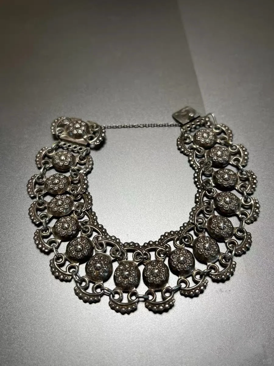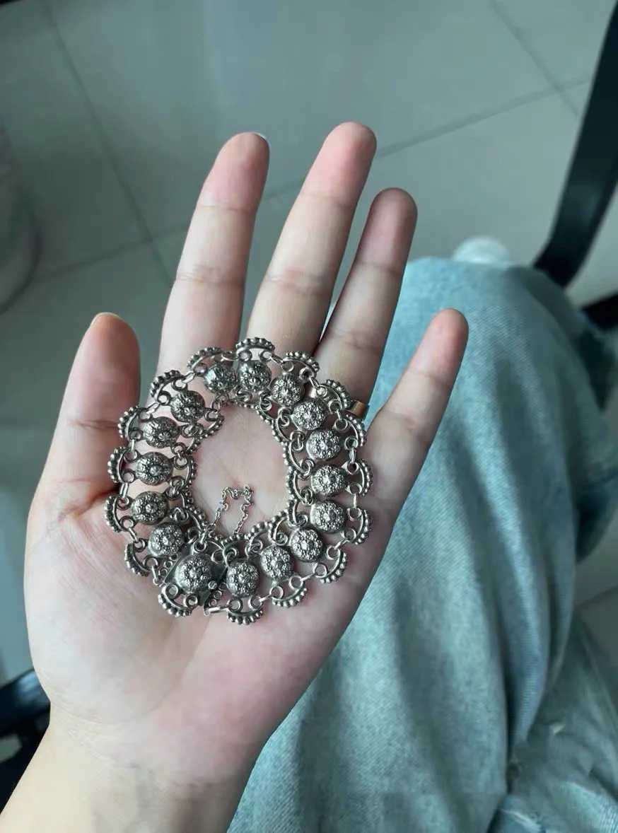 800银古董手链,糖果,蝴蝶结,蕾丝宽版银手链,带原装防丢链。我是16.5手围,佩戴宽松。注意这款是宽版,不是窄版的。
