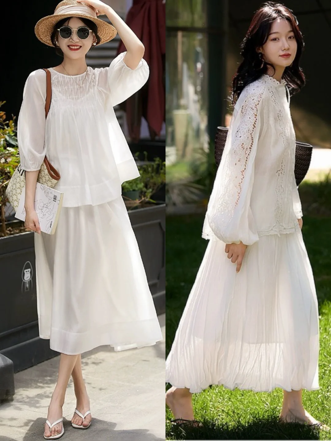 🤍白色蕾丝上衣 + 白色长裙 + 草帽