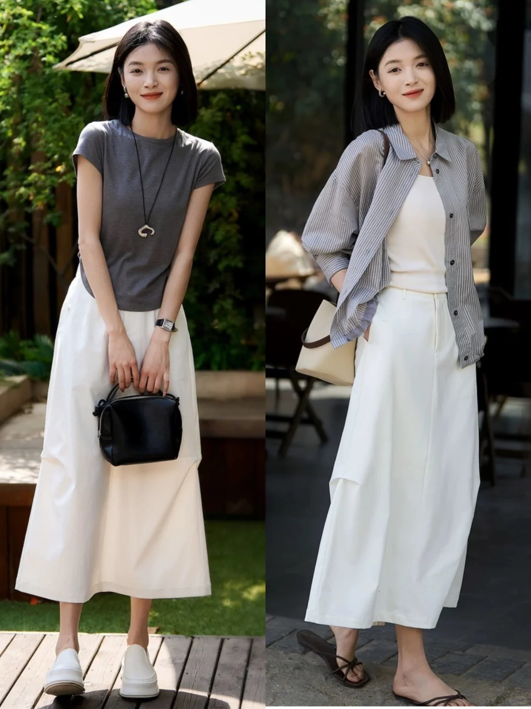 基础款短袖配A字裙,包容身材又显休闲。黑色包包点缀,日常逛街、约会都很合适。