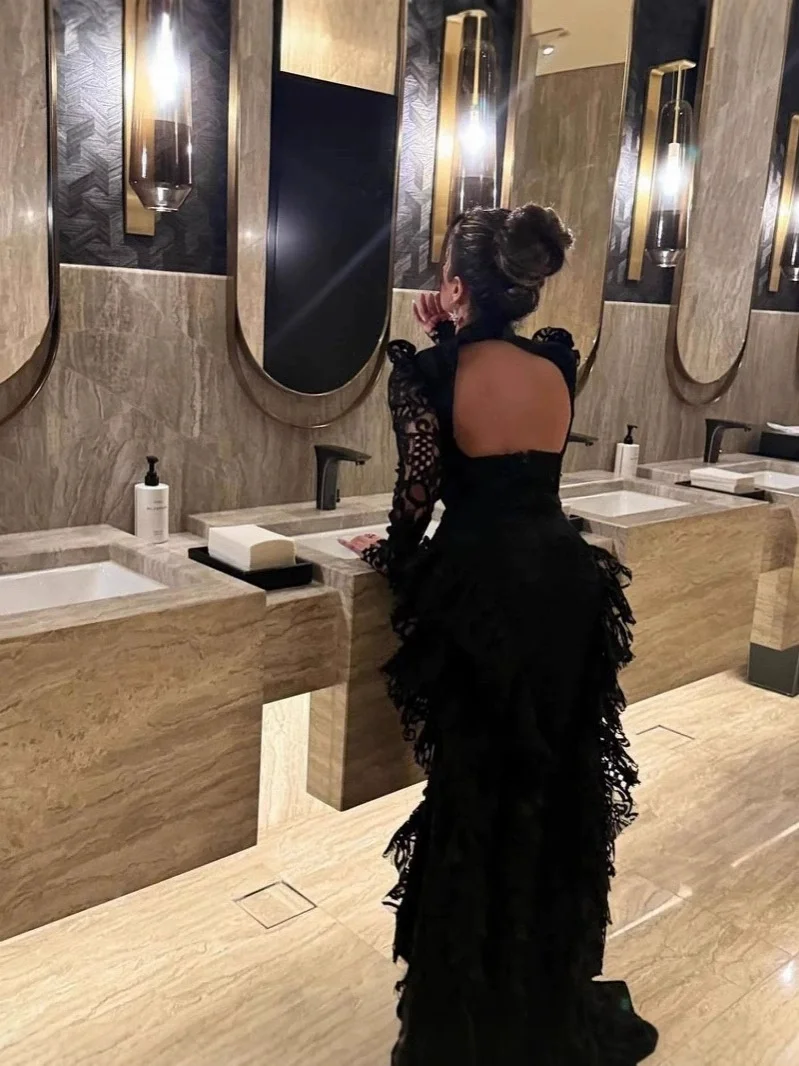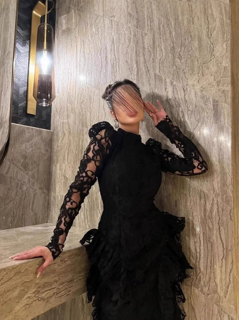 女式优雅刺绣镂空露肩长袖蕾丝腰带褶边立领