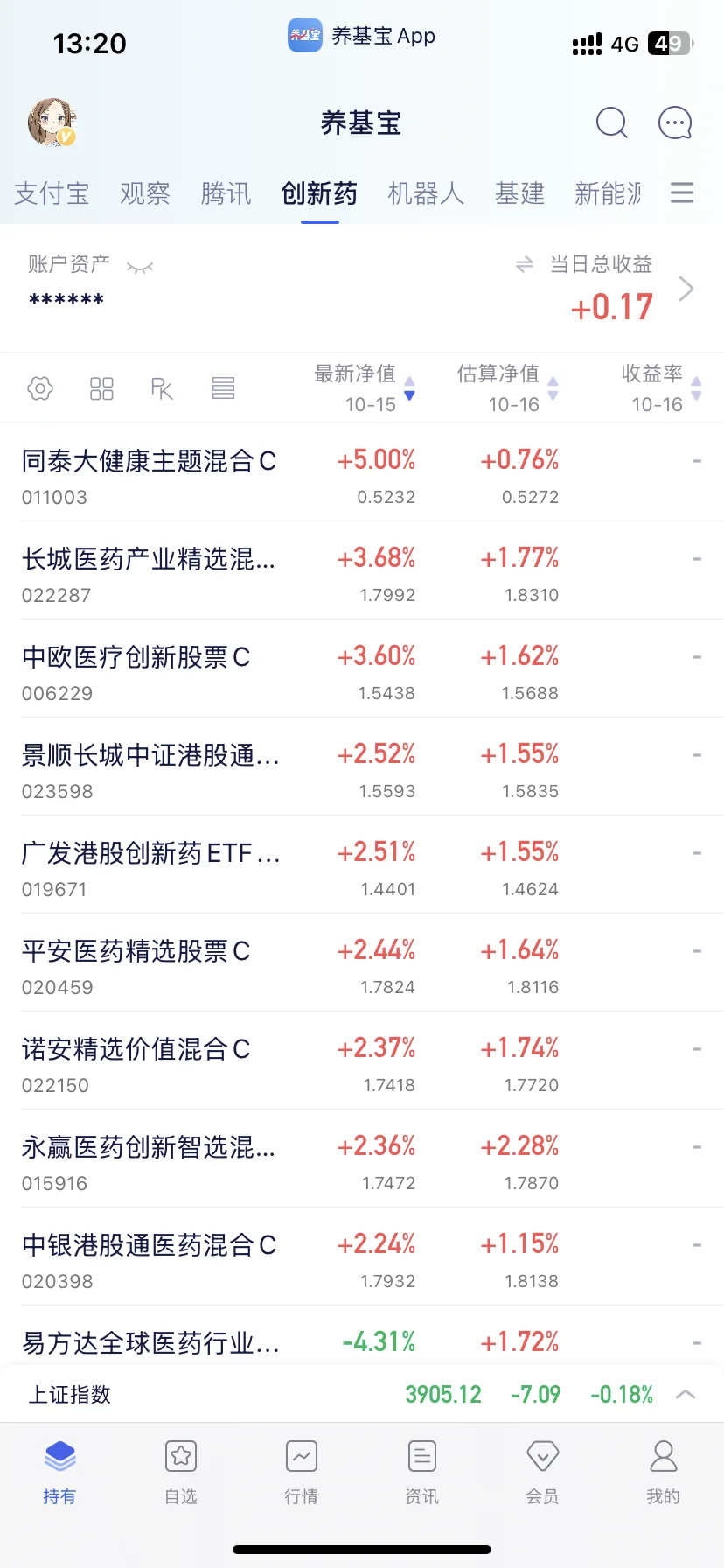 4️⃣创新药继四连跌以后昨天已经反弹了一波,今天也可以说领涨市场,位置还是挺低的,没回本也不着急,属于你的早晚会回来,同泰大健康也是创新药板块的,昨天大涨五个点是领先同板块很多产品的,后续关注一下这个同泰创新药。
