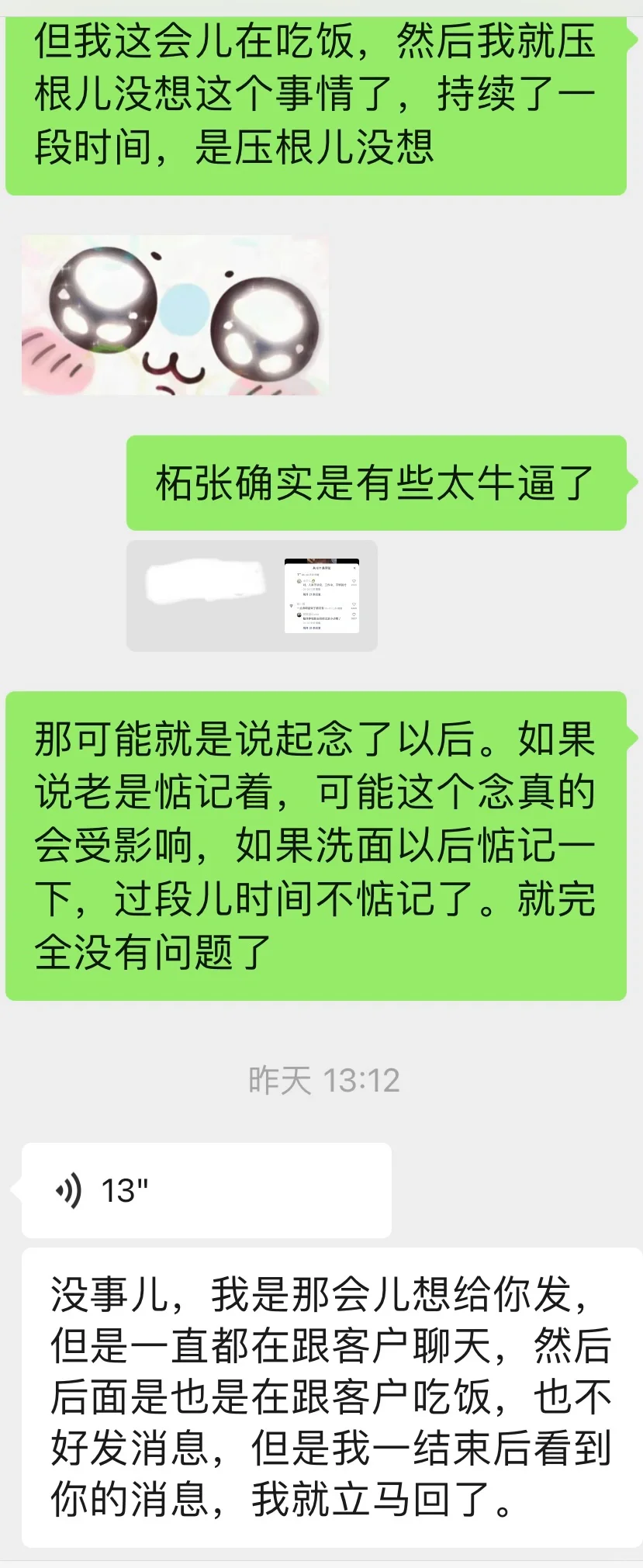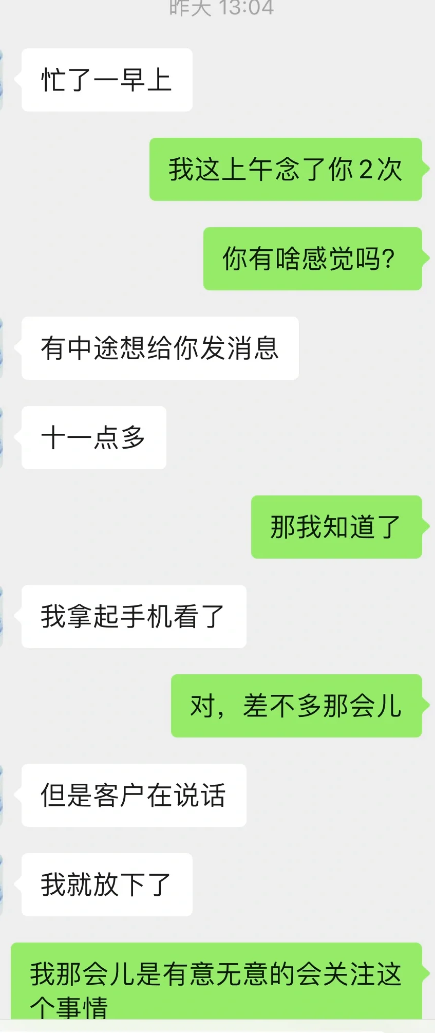 昨天上午我念我的搭子,让她立刻联系我,但是她一直都没有出现。中午的时候我们说起来这件事情,她说当时她在陪客户,中途看了好几次手机想联系我,但是实在不方便。