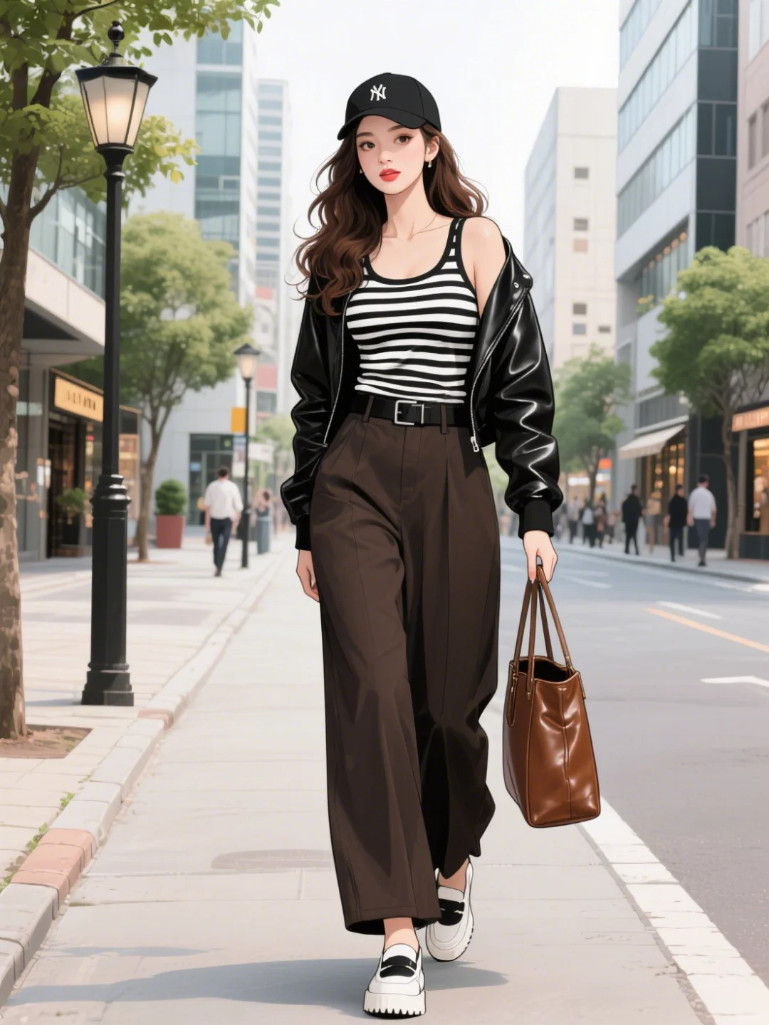 女生上身穿黑白条纹背心,外穿黑色皮质外套夹克,下身穿深褐色宽松阔腿棉混纺长裤,裤子很长垂顺舒适,质感很好,黑色腰带,脚穿白色厚底乐福鞋,戴黑色棒球帽 手提深棕色皮质托特包