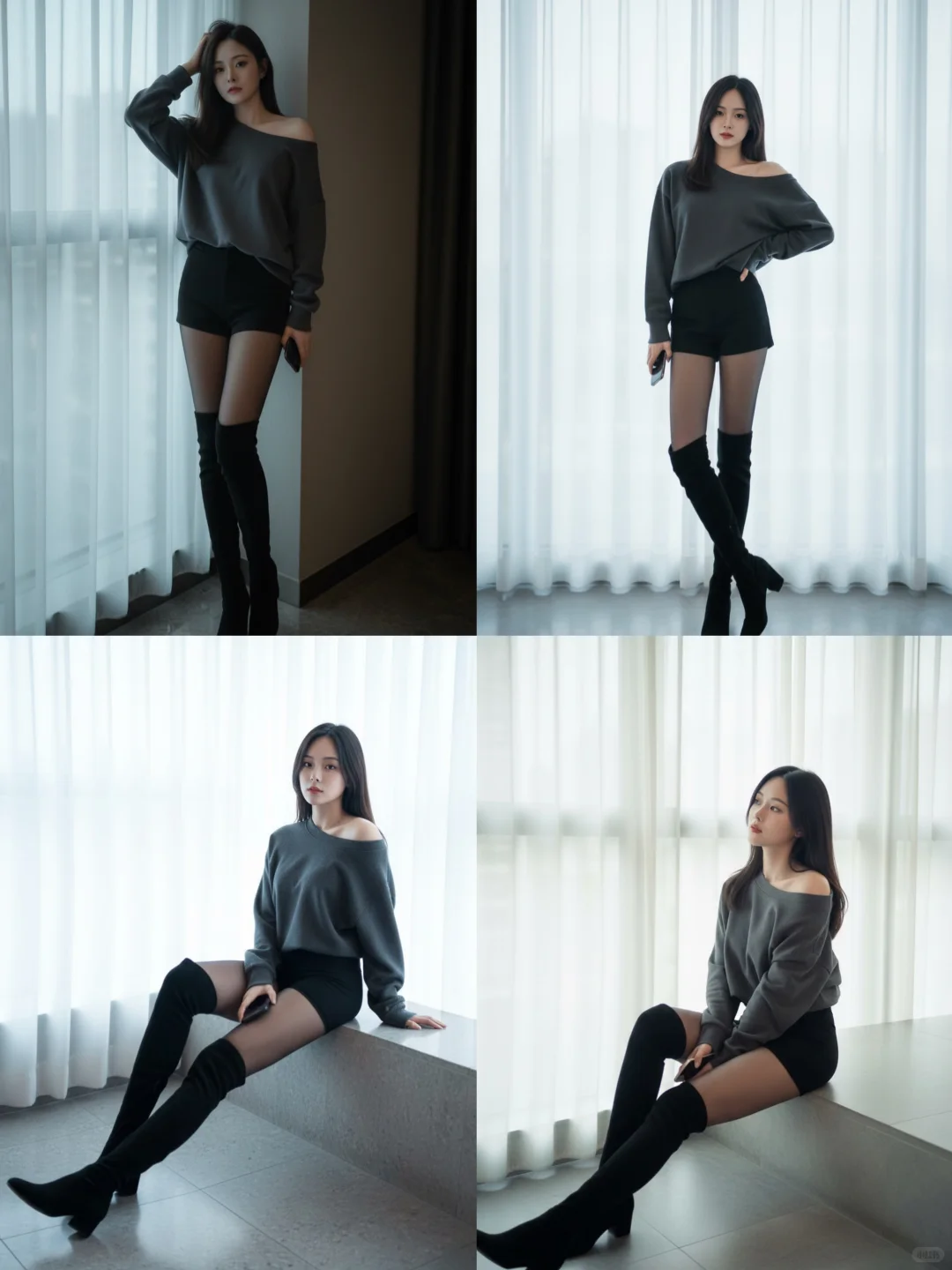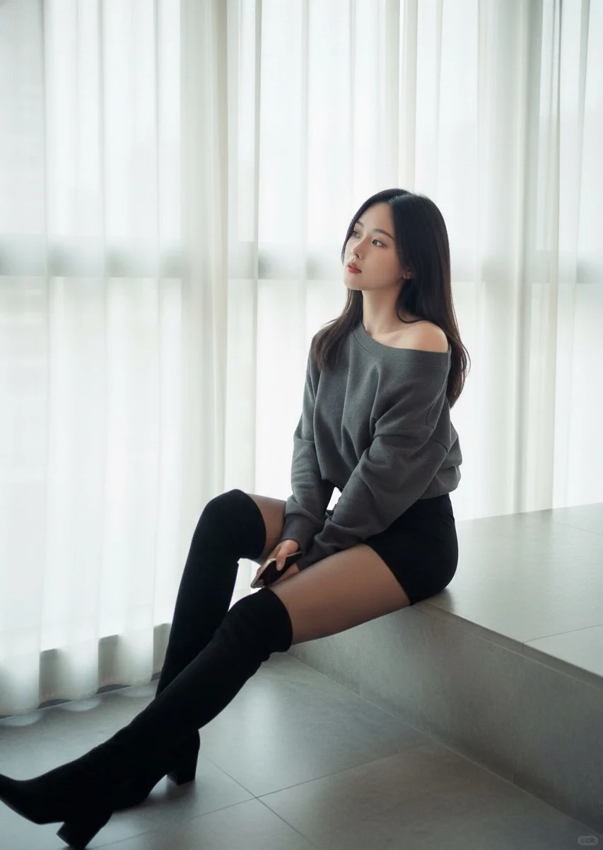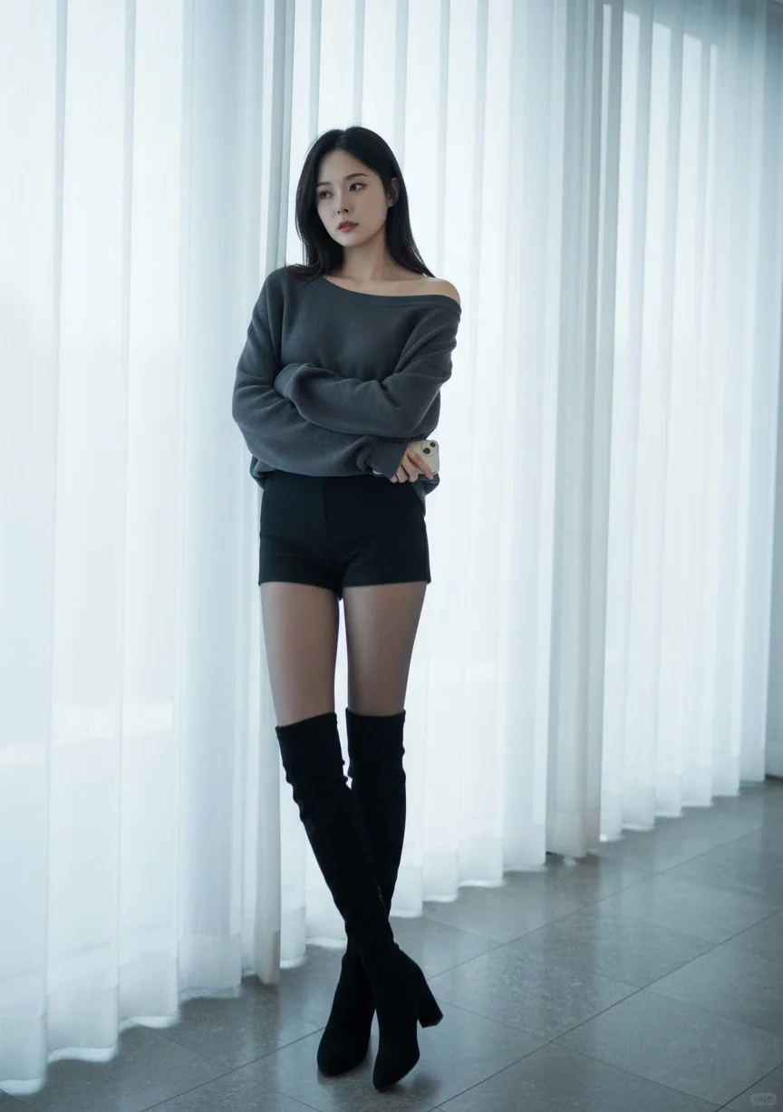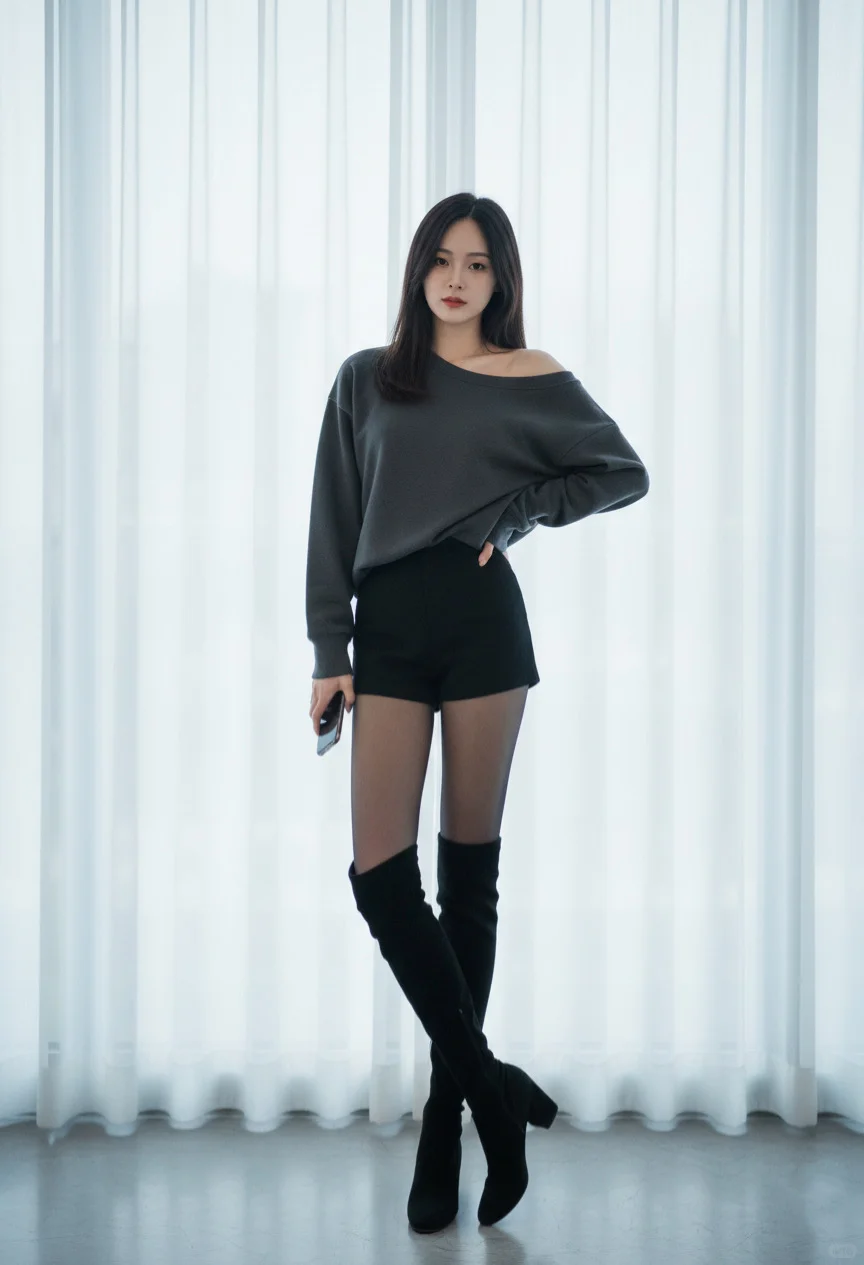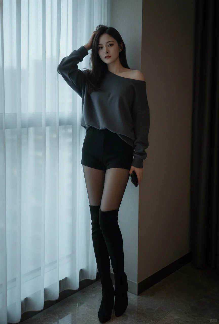 一张高分辨率的极简室内全身时尚人像摄影,画面以柔和纱帘为背景,风格简洁、光影细腻。主体是一位年轻的东方女性,长发自然披散,身穿深灰色一字领宽松卫衣、黑色高腰短裤、半透明裤袜与黑色过膝长靴,可手持手机作为造型道具。整体妆容干净、冷调,气质高级。 她靠在浅色墙边站立,左腿微屈交叉形成自然的“S”形曲线,双臂环抱胸前,姿态克制且放松。人物没有直视镜头,而是侧目凝视前方,神情冷静从容,略带酷感,散发出一种清冷的都会气场。 拍摄环境为极简风格的室内空间,背景是乳白色落地纱帘与灰色石材地面,整体干净无杂物,背景轻柔虚化,突出主体。主光来自窗外透过纱帘的大面积自然柔光,均匀照亮面部与上身;正前方补以低强度冷白柔光与地面反射光,以平衡明暗层次。光线在锁骨与肩线处形成细腻高光,腿部与躯干呈柔和的阴影过渡。整体光比中等偏低,明暗层次细腻,白平衡略偏冷,使画面呈现出极具现代感的冷静气质。 氛围高级、清冷、克制,带有极简的都市审美与时尚大片质感。摄影采用全画幅相机搭配 50mm 定焦镜头,光圈 f/2.0–f/2.5,以浅景深突出人物,背景保持丝滑柔化。 画面细节丰富而真实:肌肤保留自然纹理与锁骨线条,卫衣的针织绒面质地清晰可见;裤袜的半透明渐层衬托腿部曲线;麂皮过膝长靴的绒毛质感与边缘反射柔和自然;地面石材的细微纹理与反光为画面增加真实层次。整体添加轻微胶片颗粒与淡淡的高光晕影(halation),保持画面清晰度的同时增加艺术氛围与光影的呼吸感。 画面比例为 2:3,简约而富有视觉张力。”