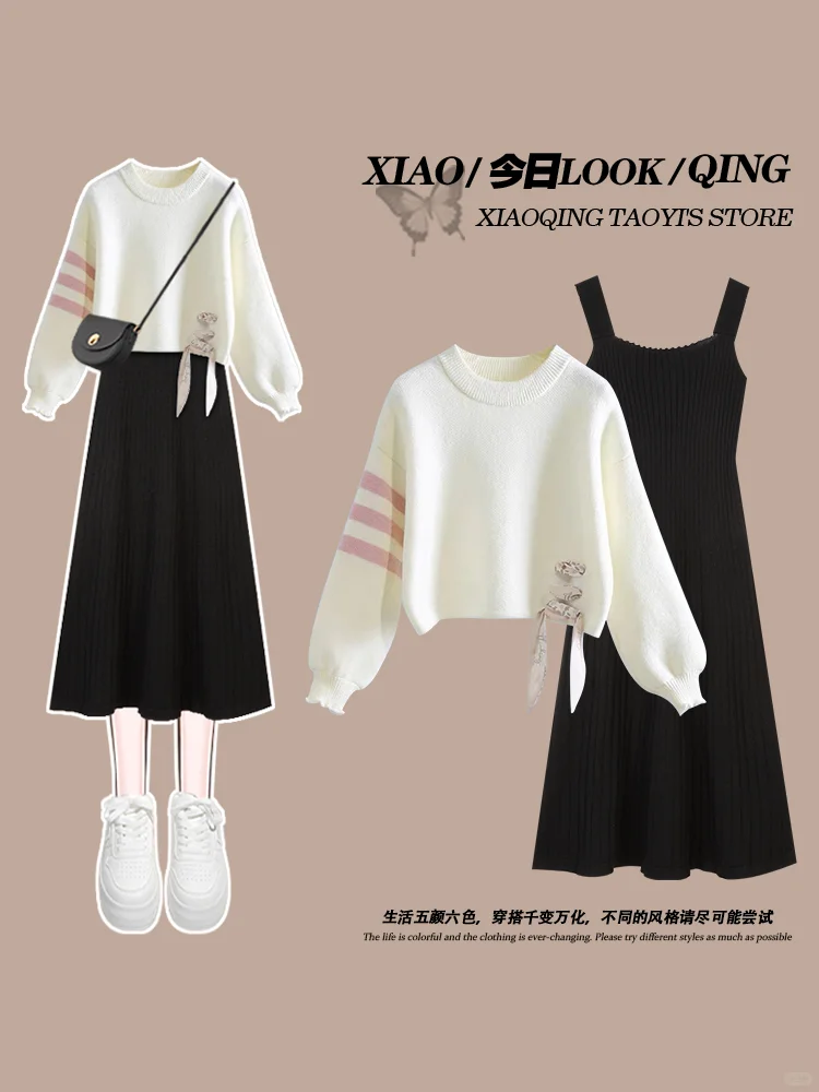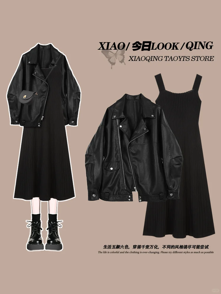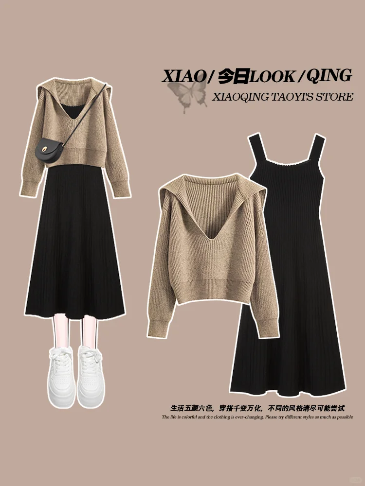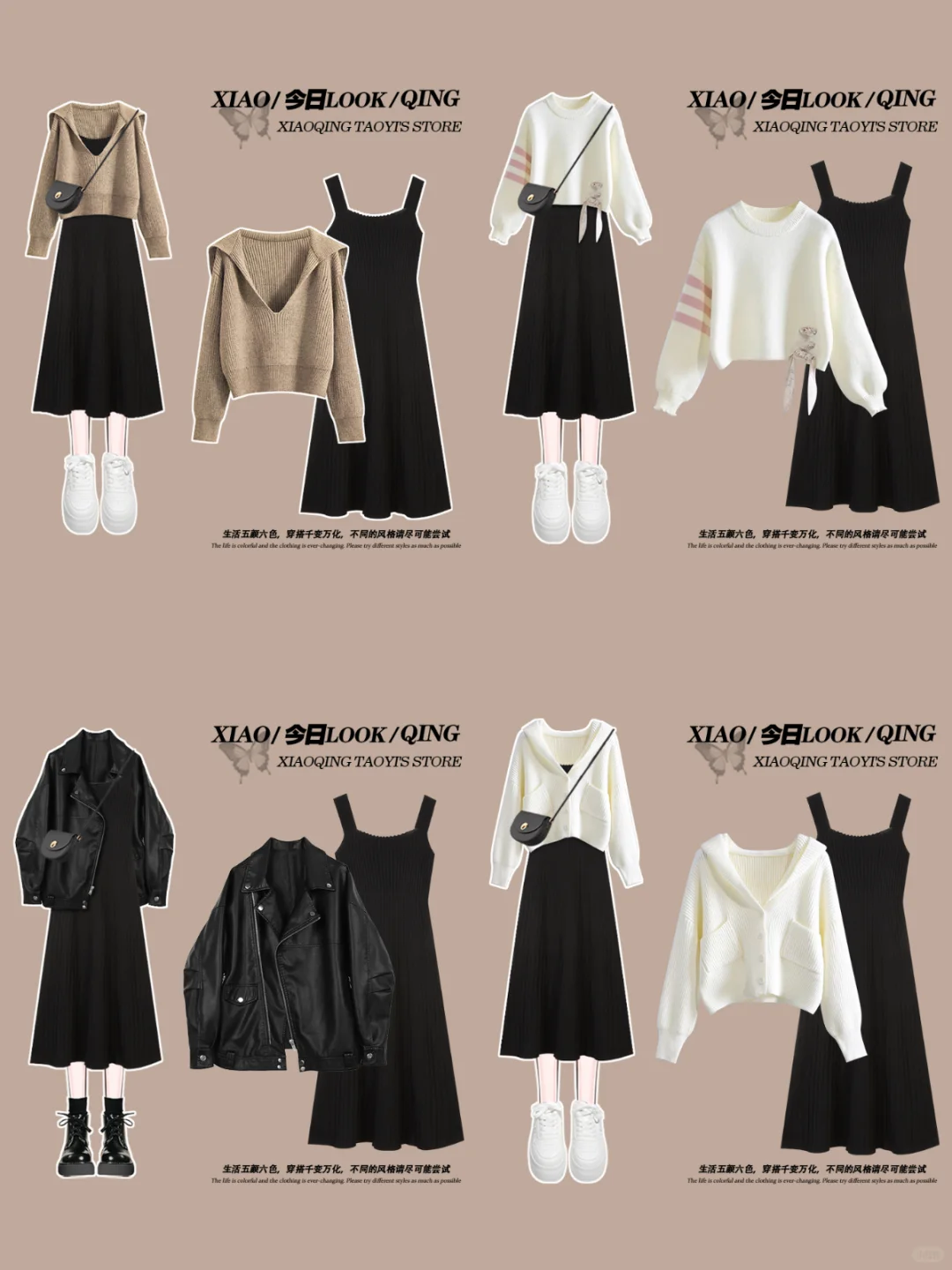 Look1⃣:黑色吊带裙+卡其色毛衣