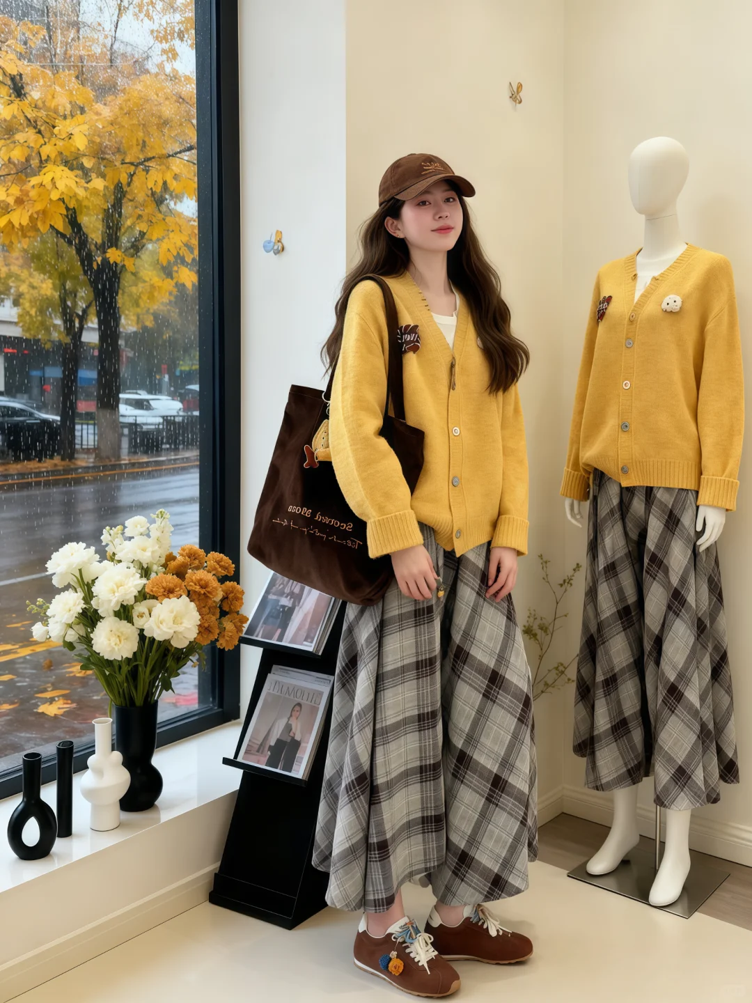 图一模特,站在装饰有白色和粉色鲜花、摆有杂志架与简约摆件的室内,身后是同款服装人体模型,人物自然的看向镜头,窗外是秋雨濛濛、黄叶满树的街景,整体画面呈现出高级感与时尚氛围