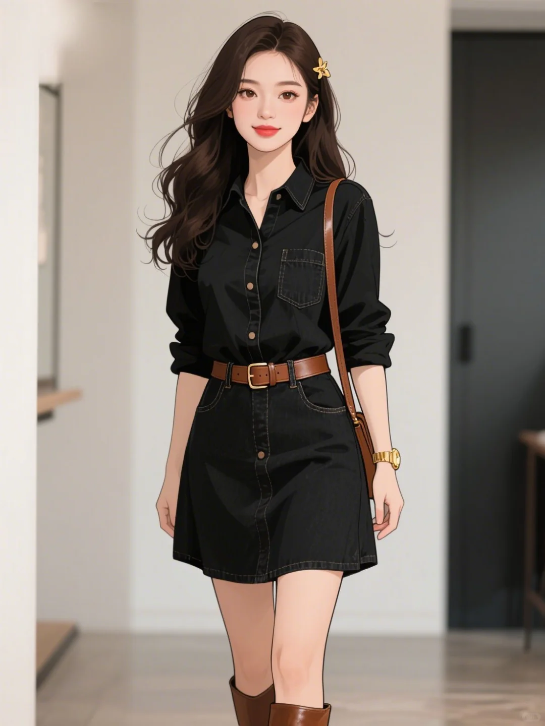 尚休闲穿搭,(都市复古牛仔风,权重1.3 ),(随性洒脱,兼具时尚感与实用性 )。关键设计点:黑色棉质衬衫裙,经典衬衫领型,单排扣设计从领口延伸至裙摆,增添利落感 ;腰部搭配棕色皮质腰带,设有独特造型小口袋,既提升腰线勾勒曲线,又具装饰性 ;袖口可挽起露出内衬,展现随性态度。