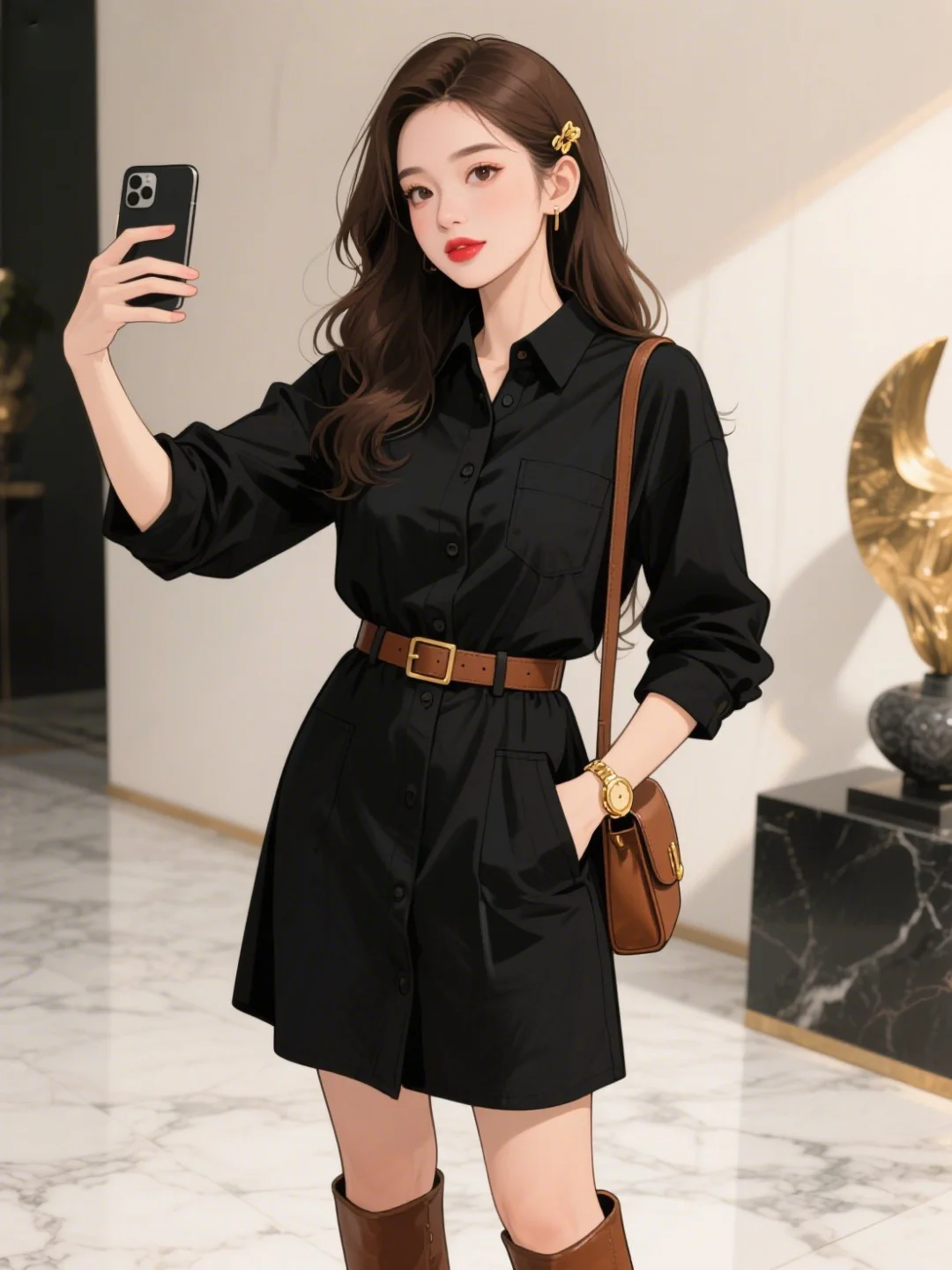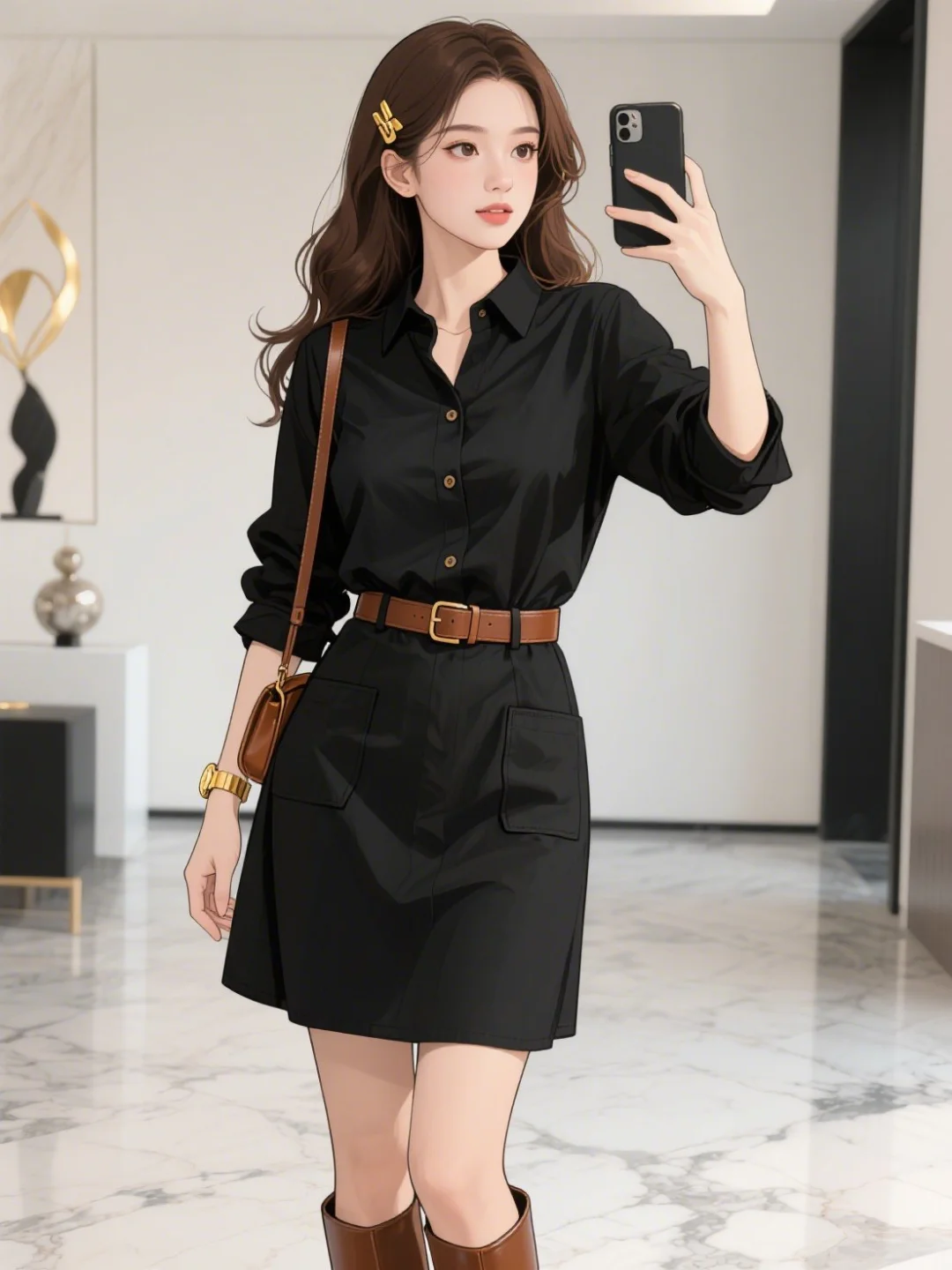 面料方面,黑色裙采用棉质,有挺括度且耐磨,呈现复古质感 。场景为室内现代简约空间,大理石地面搭配艺术摆件,营造时尚氛围 ,人物手持手机自拍,呈现日常又时髦的状态 。 --no 廉价质感、繁杂无序装饰、奇怪比例剪裁、色彩冲突搭配