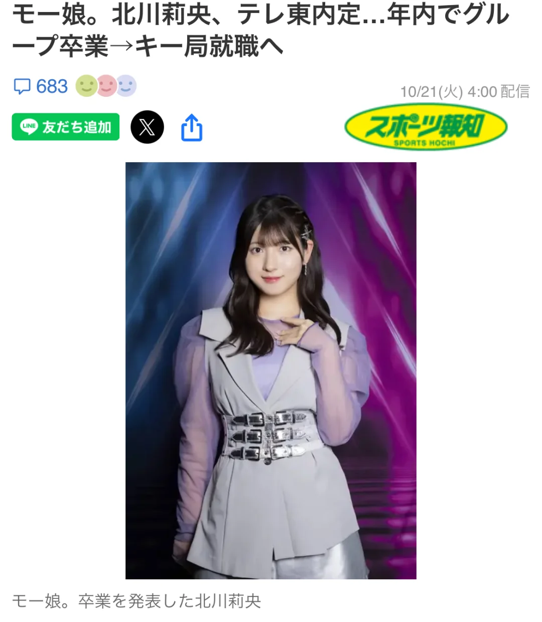 北川莉央(21岁)宣布年内从“早安少女组。”毕业,20日据《体育报知》采访获悉,其已内定入职东京电视台。