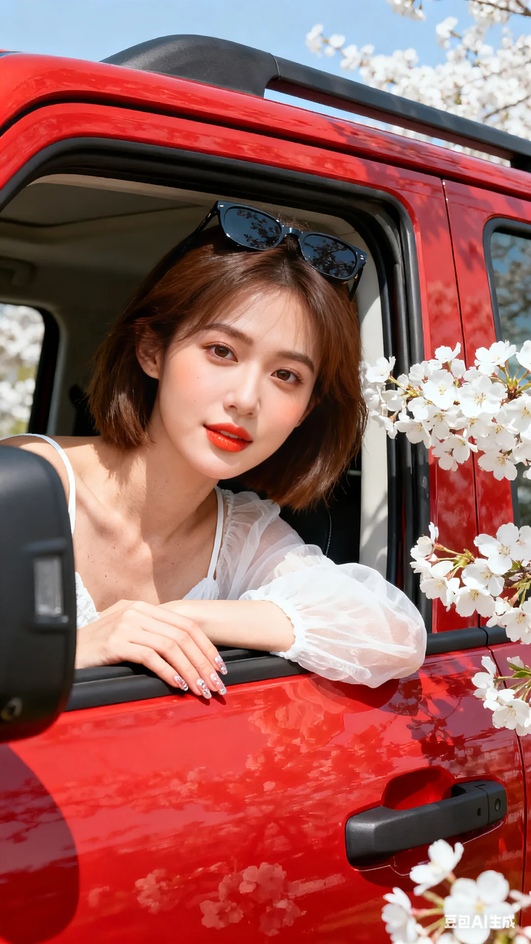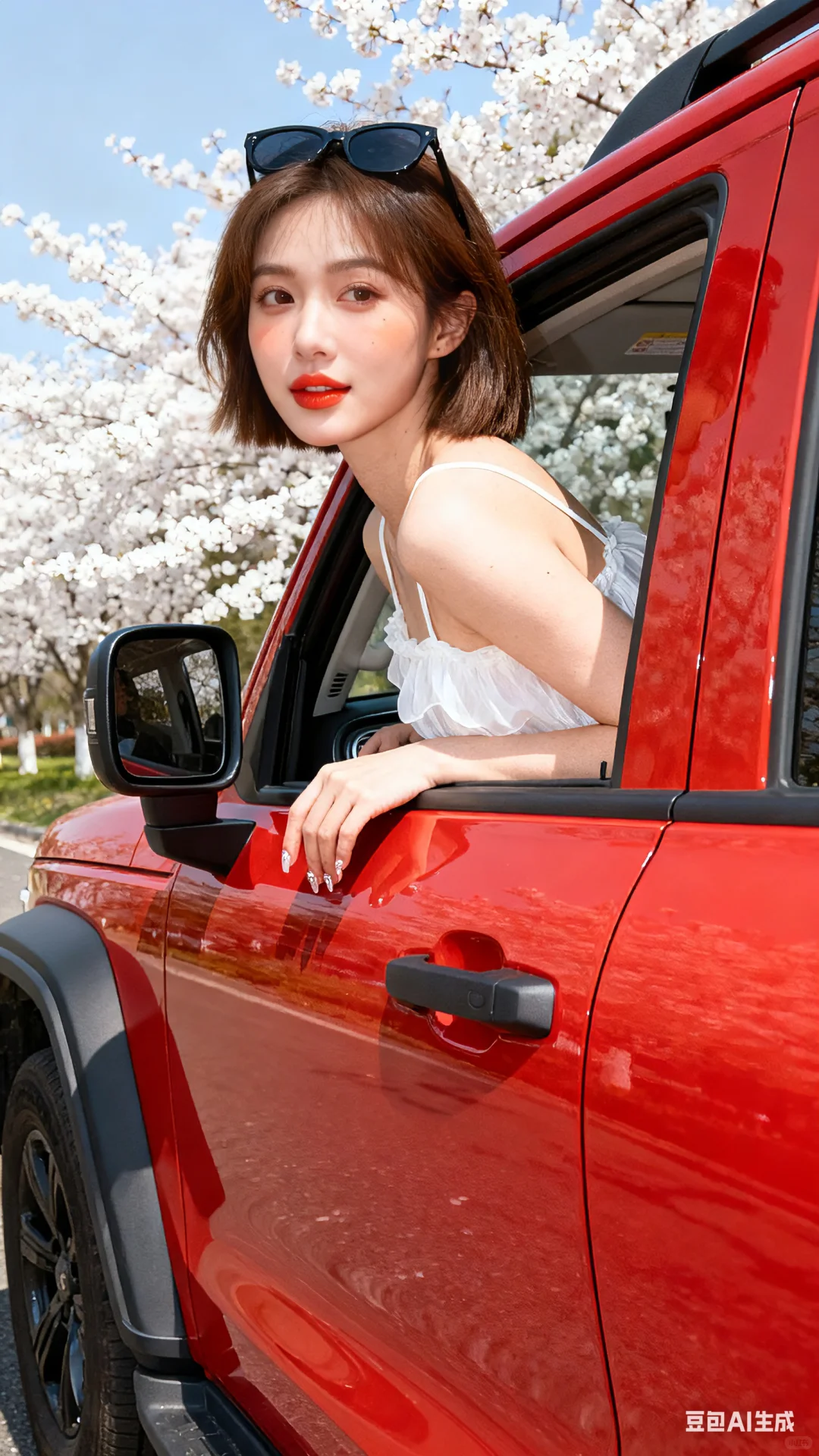 帮我生成一张人物写真,三分线构图,近景特写,摄影大片光感 。甜美女主从红色SUV正驾室车窗探出上半身,车辆居画面中右侧,一手撑在车窗台上,一手稍伸出窗外,半侧身转头望向相机镜头。身着白色雪纺吊带衣,头上戴一个墨镜,皮肤浅小麦色透点白,清透自然,粟棕色短发,淡淡的浅橙色腮红,鼻头浅橙色胭脂,妆容甜美,浅红色唇秞,手指配带美甲,车右前方有一片白色樱花,远方是浅蓝色的天空。五官高光提亮,阳光侧射于人物身上,光感通透,,陶瓷肌肤,皮肤光滑白皙,高级磨皮,高级去噪,高级柔光,32K细腻真人皮肤纹理,远景聚焦模糊。比例9:16#美女与汽车 #AI女生头像 #向往自由的女生头像 #高清头像 #AI #AI美女 #高级感女生头像 #车内的那片花海 #豆包 #和你的汽车一起拍照