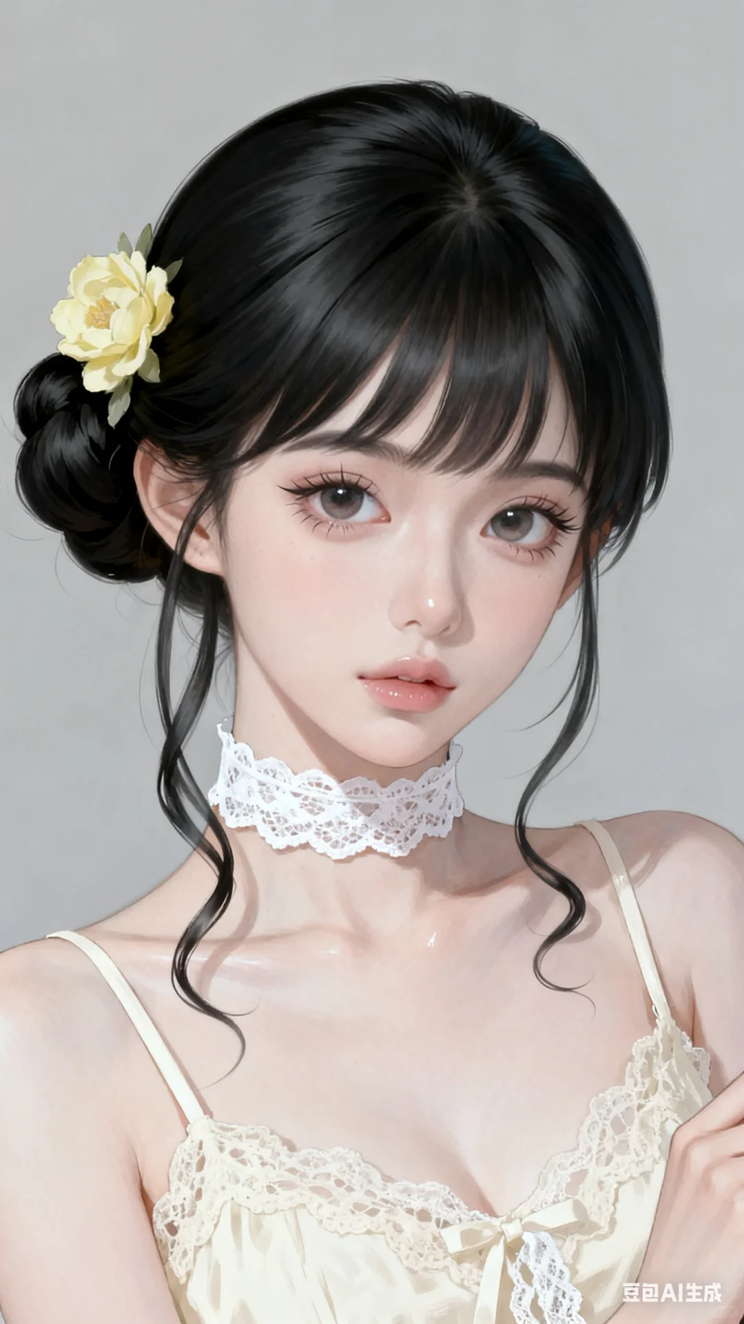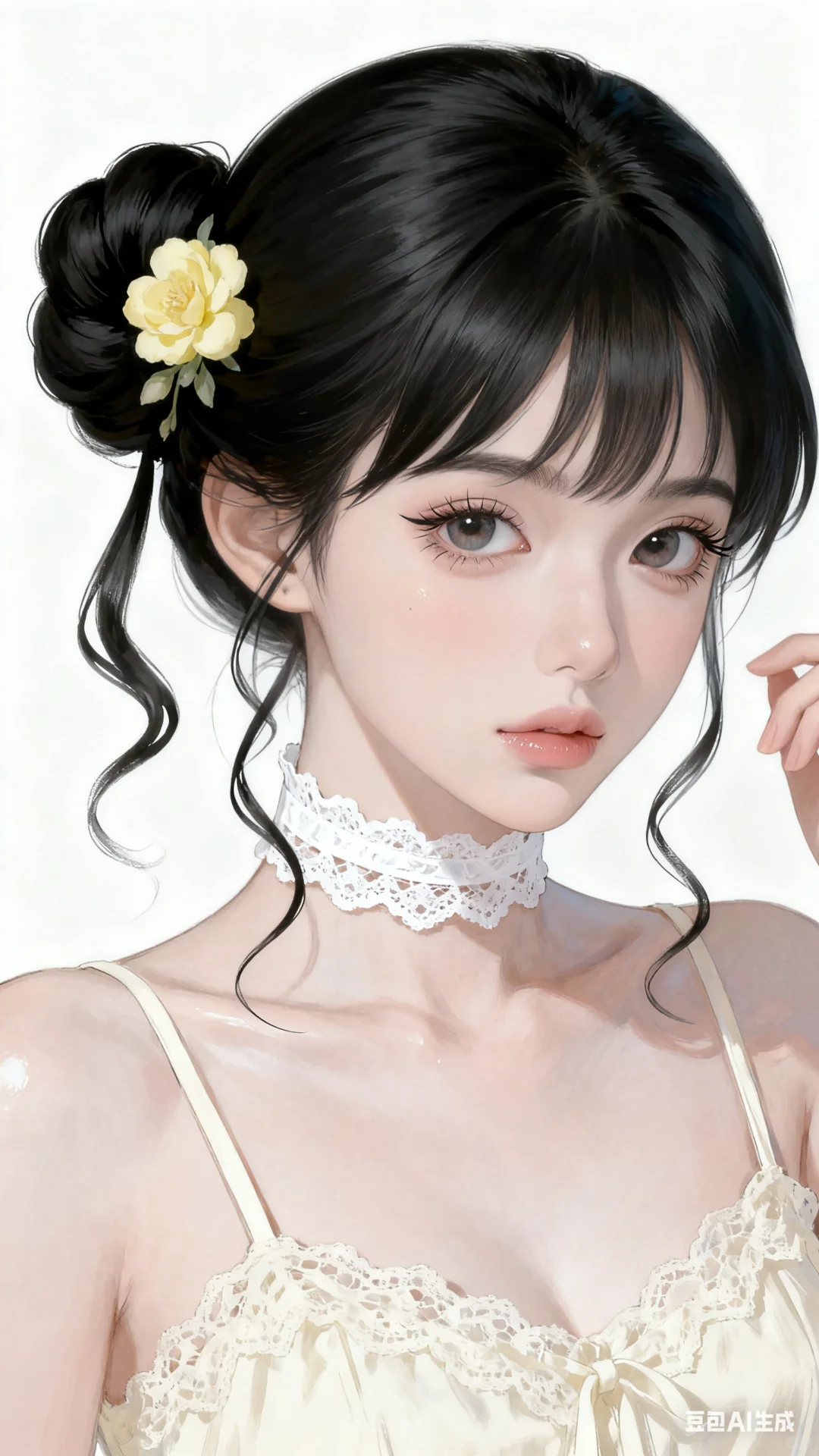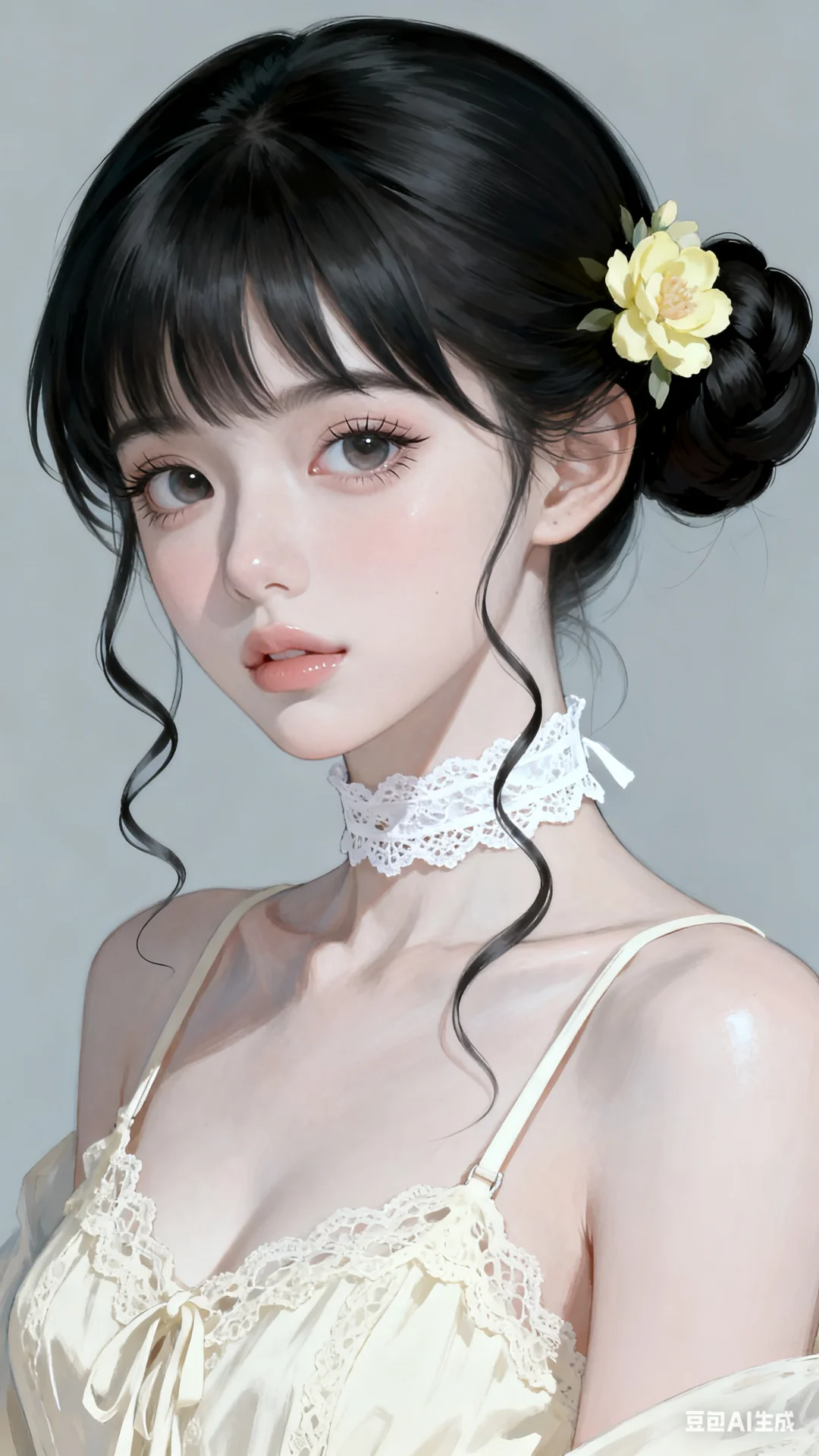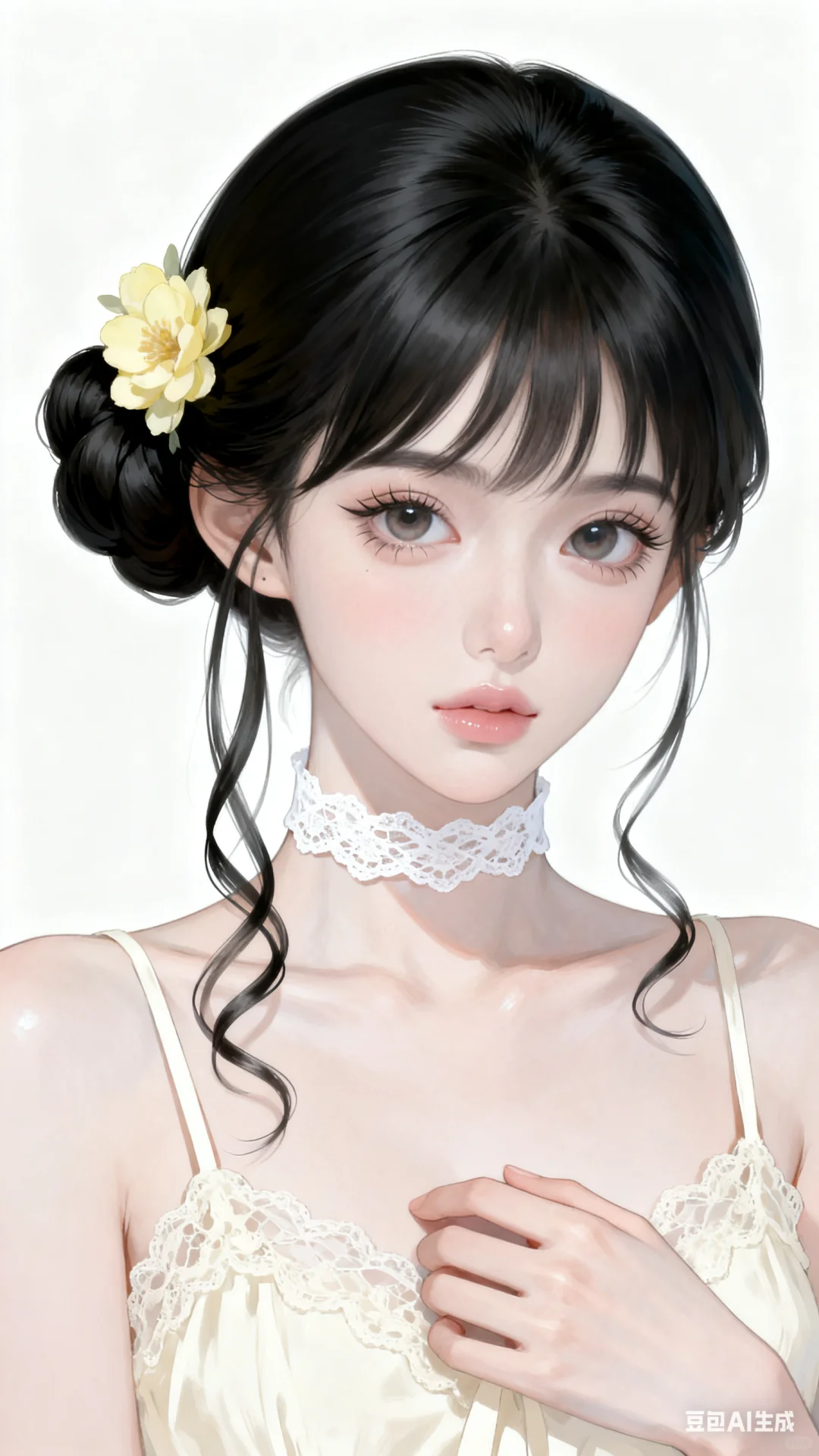 妆发:呈现古早感侧丸子头,黑色发丝打造出一侧丸子造型,搭配淡黄色花朵发饰点缀,发丝间有自然卷曲的龙须刘海,妆容清淡,眼妆线条柔和,唇色裸色,整体尽显甜美复古风格。