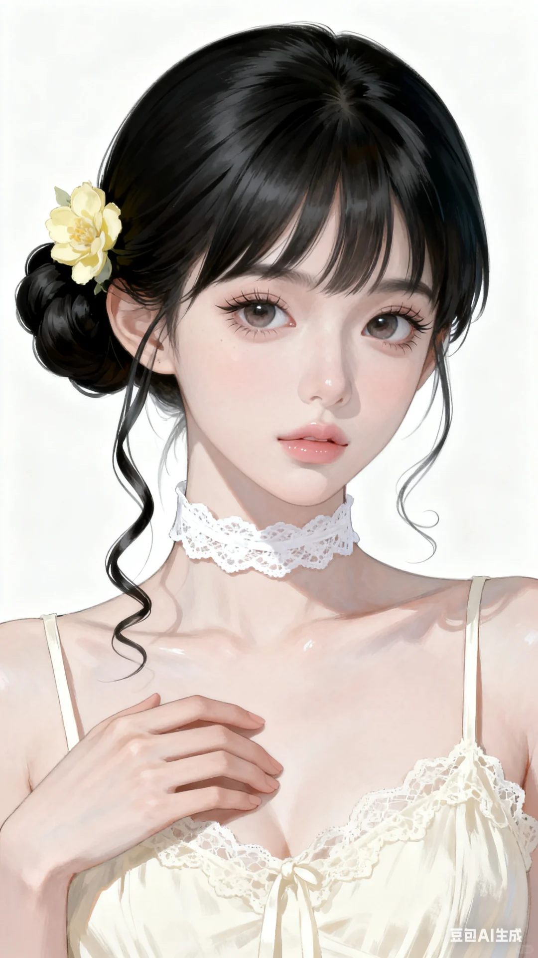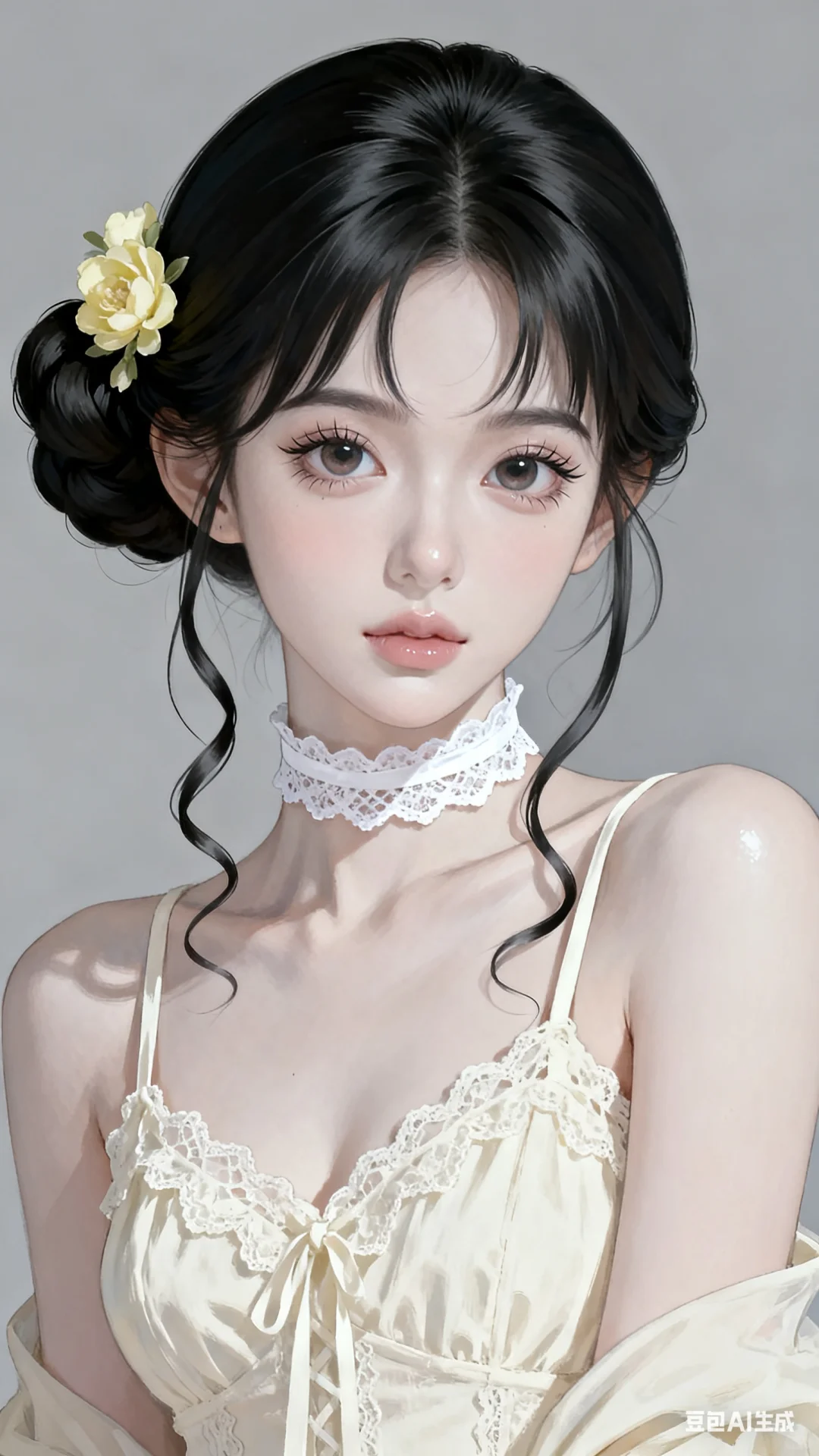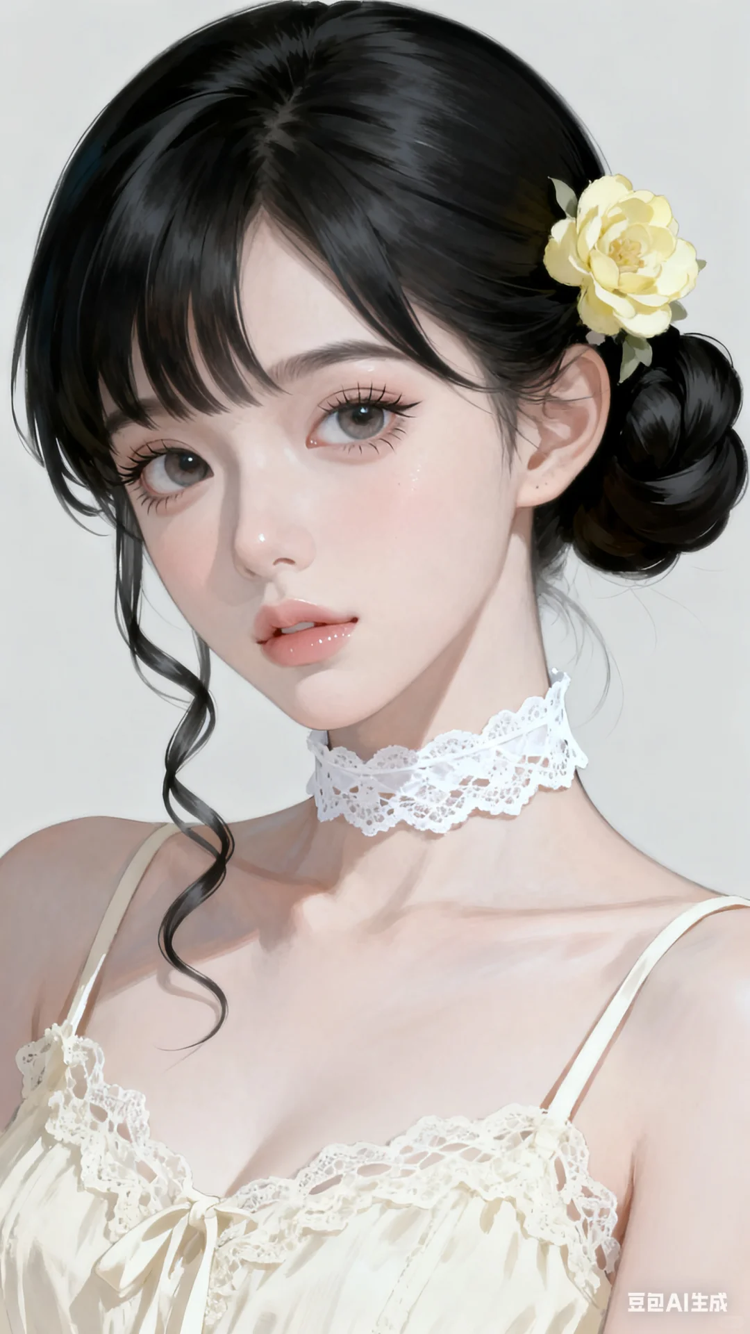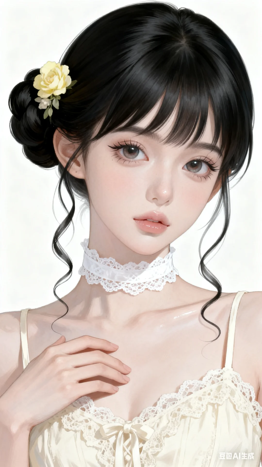 妆发:呈现古早感侧丸子头,黑色发丝打造出一侧丸子造型,搭配淡黄色花朵发饰点缀,发丝间有自然卷曲的龙须刘海,妆容清淡,眼妆线条柔和,唇色裸色,整体尽显甜美复古风格。