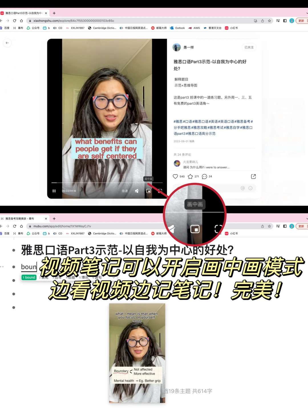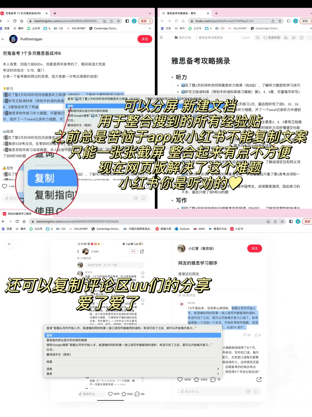 ▪️打开一篇经验贴,可以分屏在文档中记笔记,还可以直接复制作者的文案和下面的评论内容,粘贴到自己的文档中。这一点是App版本中没有的,也是我渴望了很久的新功能🤩方便整合所有的经验贴,几篇笔记整合下来,恭喜你雅思已经入门了