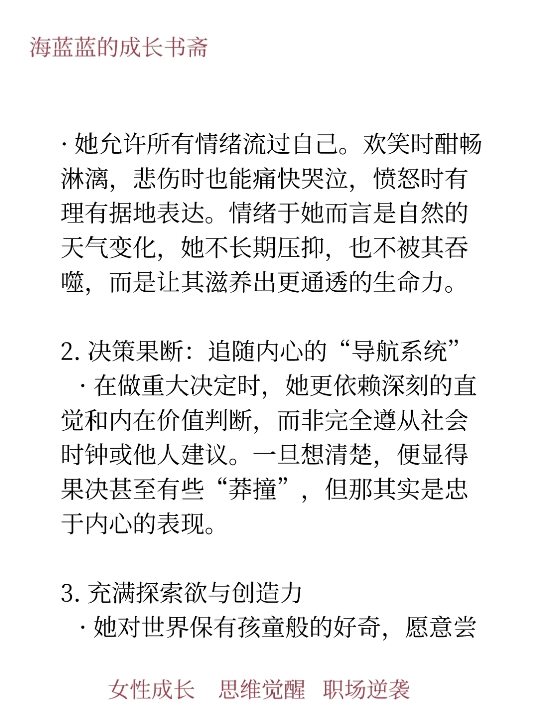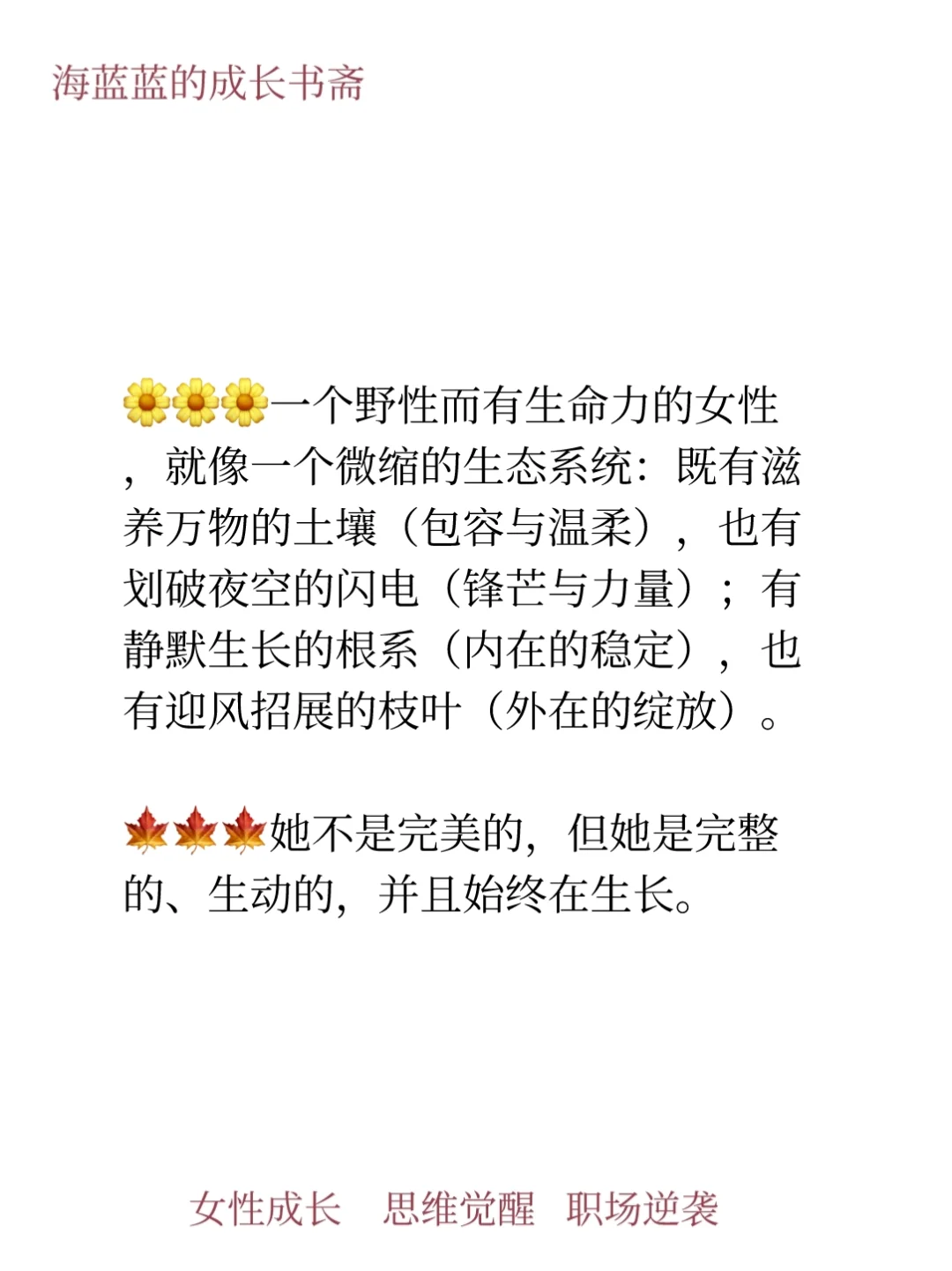 🍁🍁🍁她不是完美的,但她是完整的、生动的,并且始终在生长。就像一个微缩的生态系统:既有滋养万物的土壤(包容与温柔),也有划破夜空的闪电(锋芒与力量);有静默生长的根系(内在的稳定),也有迎风招展的枝叶(外在的绽放)。