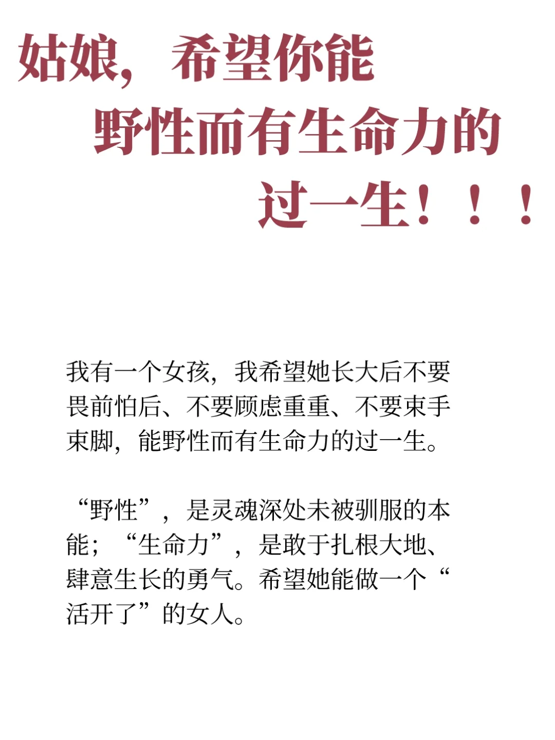 我有一个女孩,我希望她长大后不要畏前怕后、不要顾虑重重、不要束手束脚,能野性有生命力的过一生!