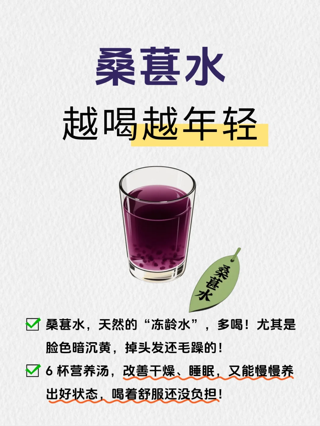 后来发现,比起猛敷面膜,每天喝杯桑葚水才是真管用!酸酸甜甜的像喝果茶,喝了一个月,不仅皮肤透着润,连睡眠都变好了,整个人看着清爽又显年轻,闺蜜还问我是不是偷偷做了保养~