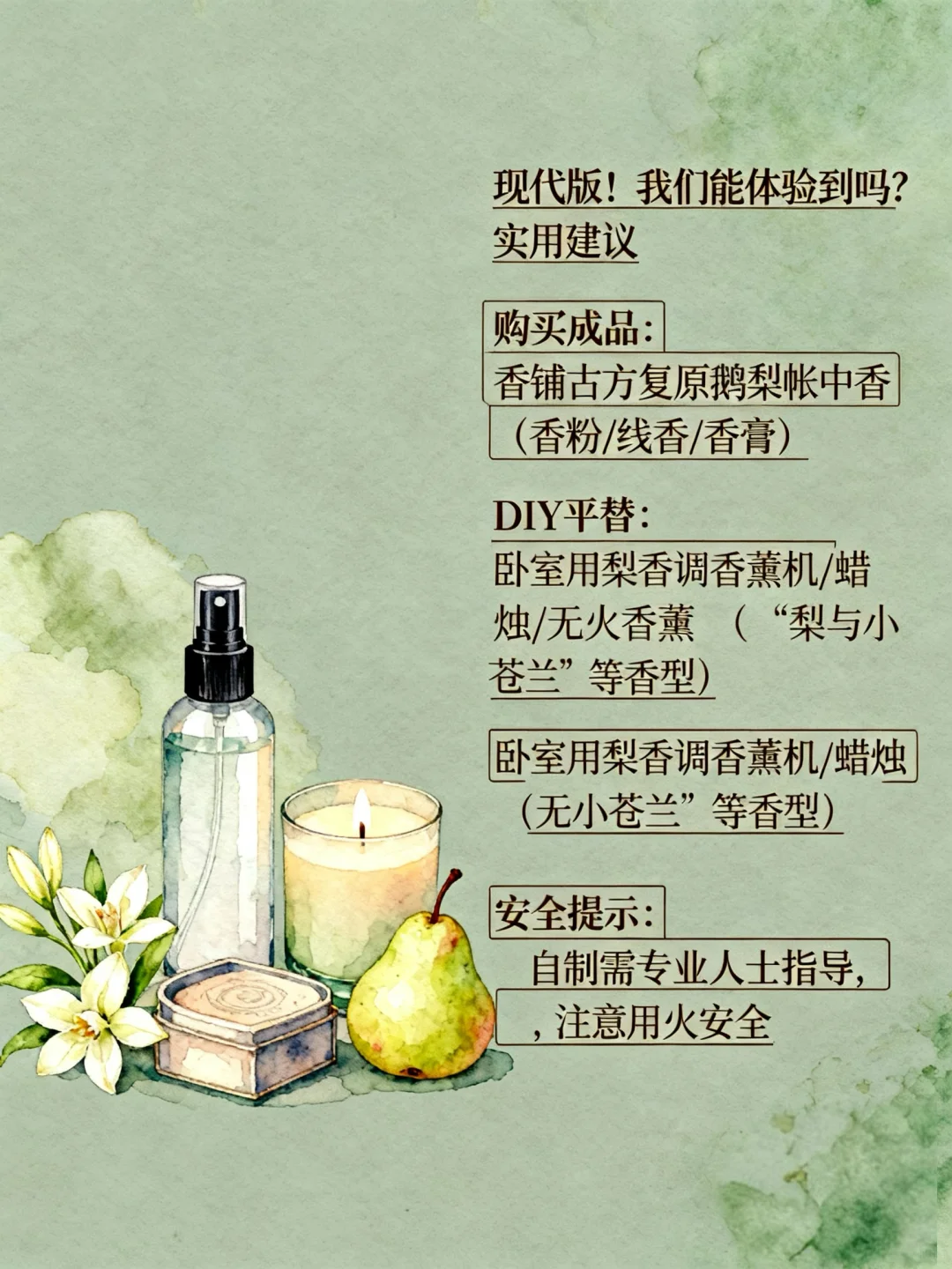 购买成品: 现在有很多香铺根据古方复原了鹅梨帐中香,有香粉、线香、香膏等形式,可以轻松买到同款。