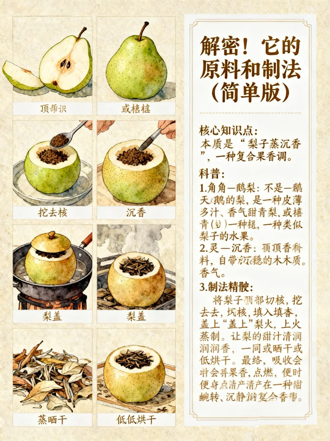 制法精髓: 将梨子顶部切开,挖去梨核,填入沉香末,盖上“梨盖”,上火蒸制。让梨的清甜果汁浸润沉香,一同晒干或低温烘干。最终,沉香会吸收梨的果香,点燃时,便会产生一种清甜婉转、幽远沉静的复合香气。