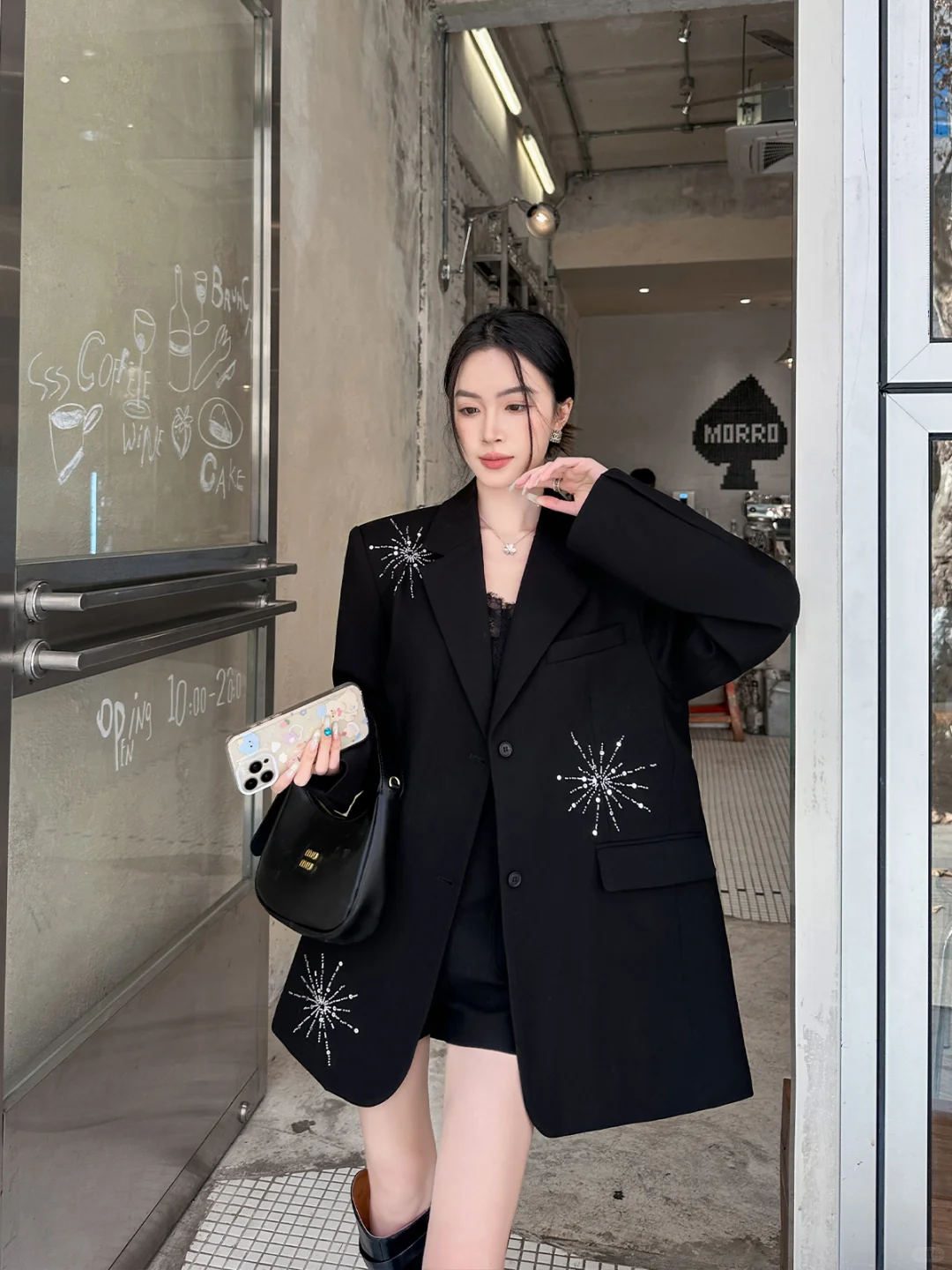 看似纯黑的面料暗藏玄机!阳光/灯光下居然有细密银闪✨像把深蓝天幕的烟花碎钻全织进去了!同事追着问是不是喷了亮片喷雾,笑死~低调心机说的就是它!☄️