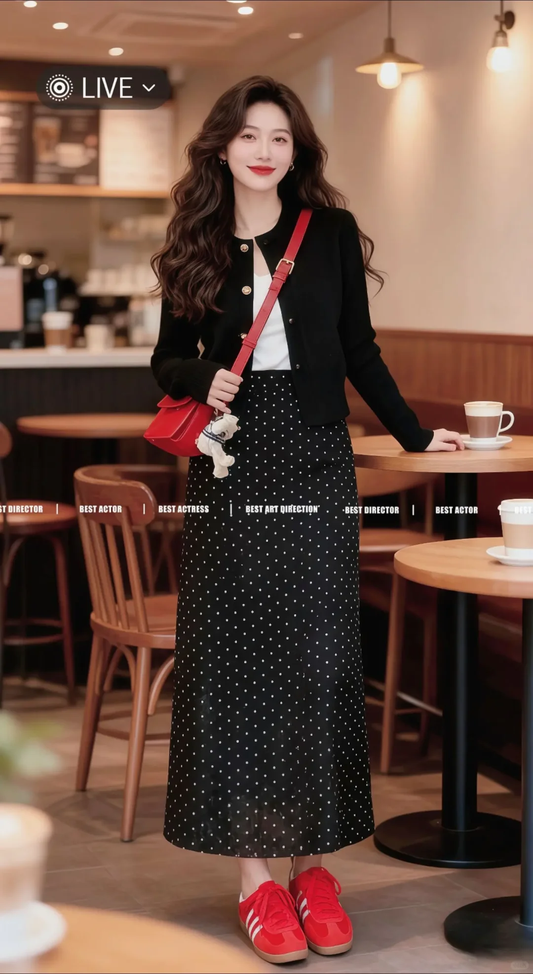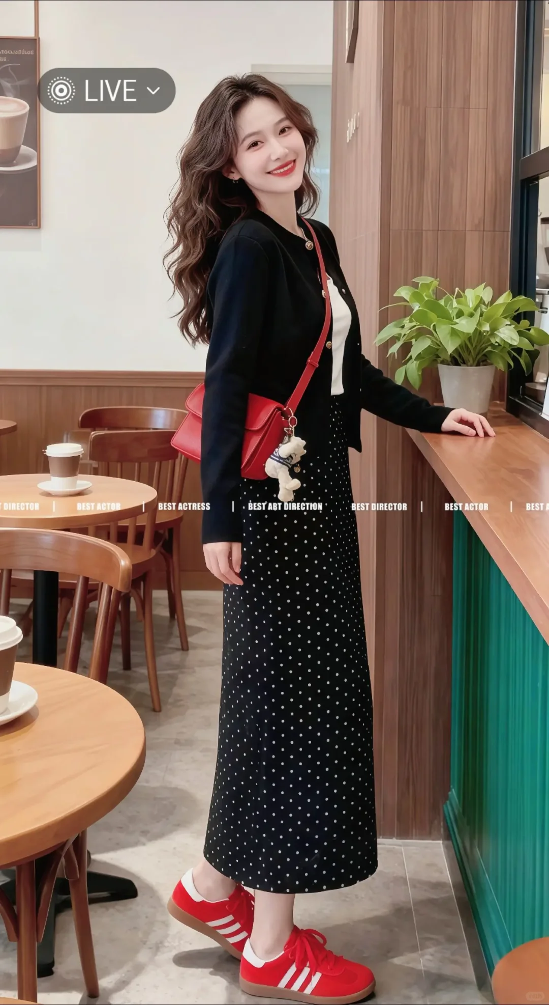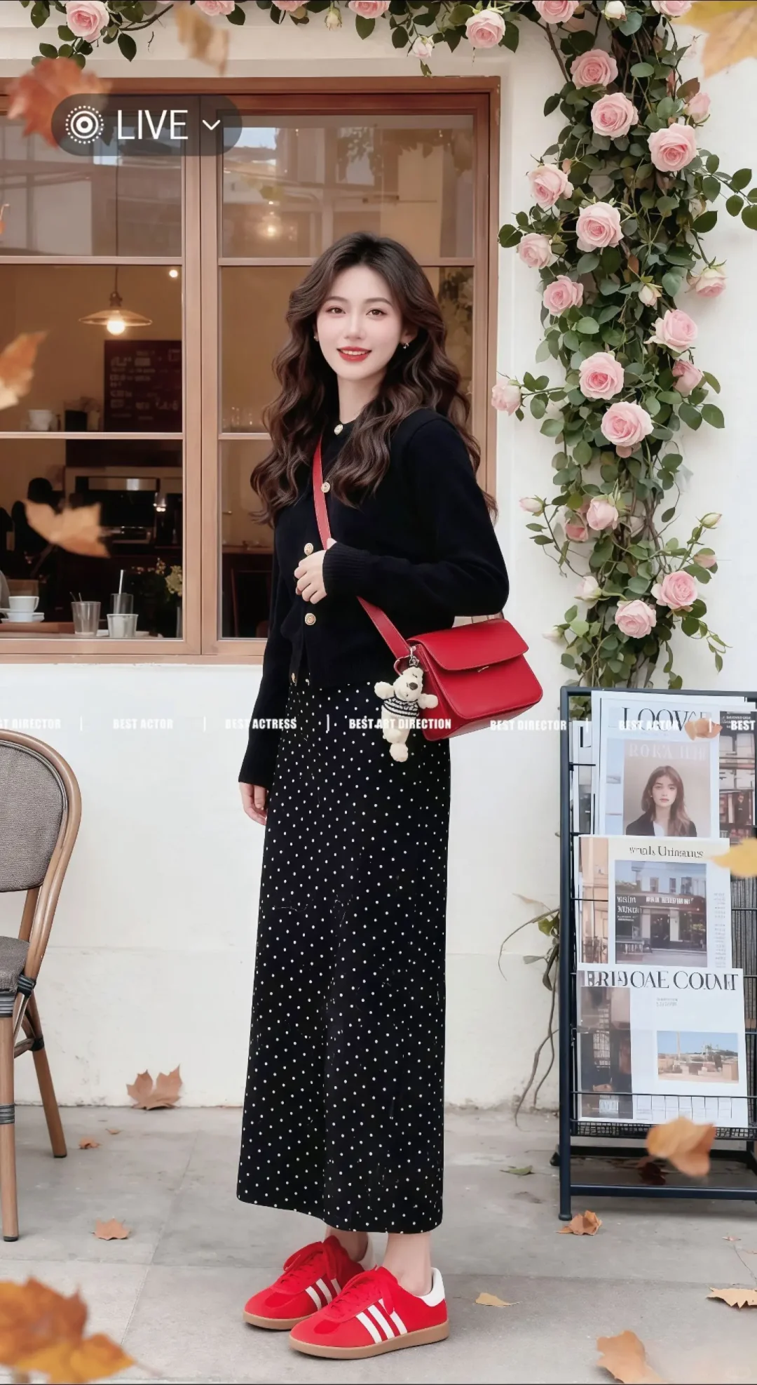 她靠在椅子上,目光落在对面的杂志架上。最新一期的时尚杂志封面是她喜欢的模特,她走过去翻了翻,指尖划过那些精致的穿搭,忽然觉得自己今天的搭配也挺有意思——黑色针织开衫配波点长裙,是复古的优雅;红色运动鞋和挎包,又添了几分跳脱的活力。