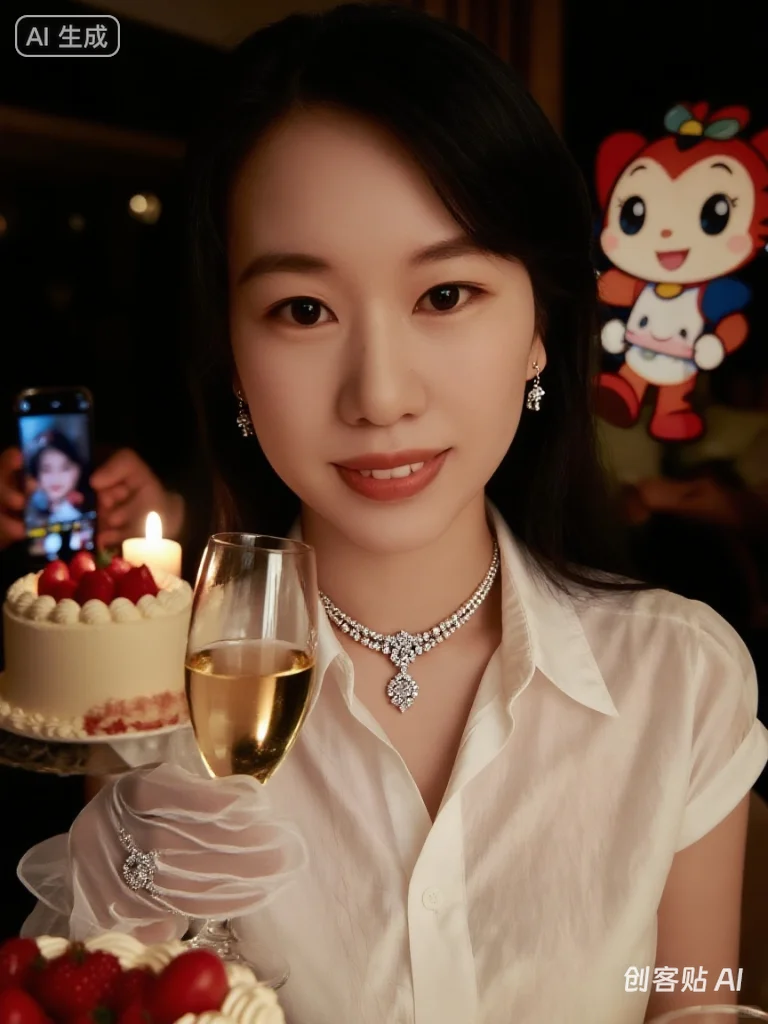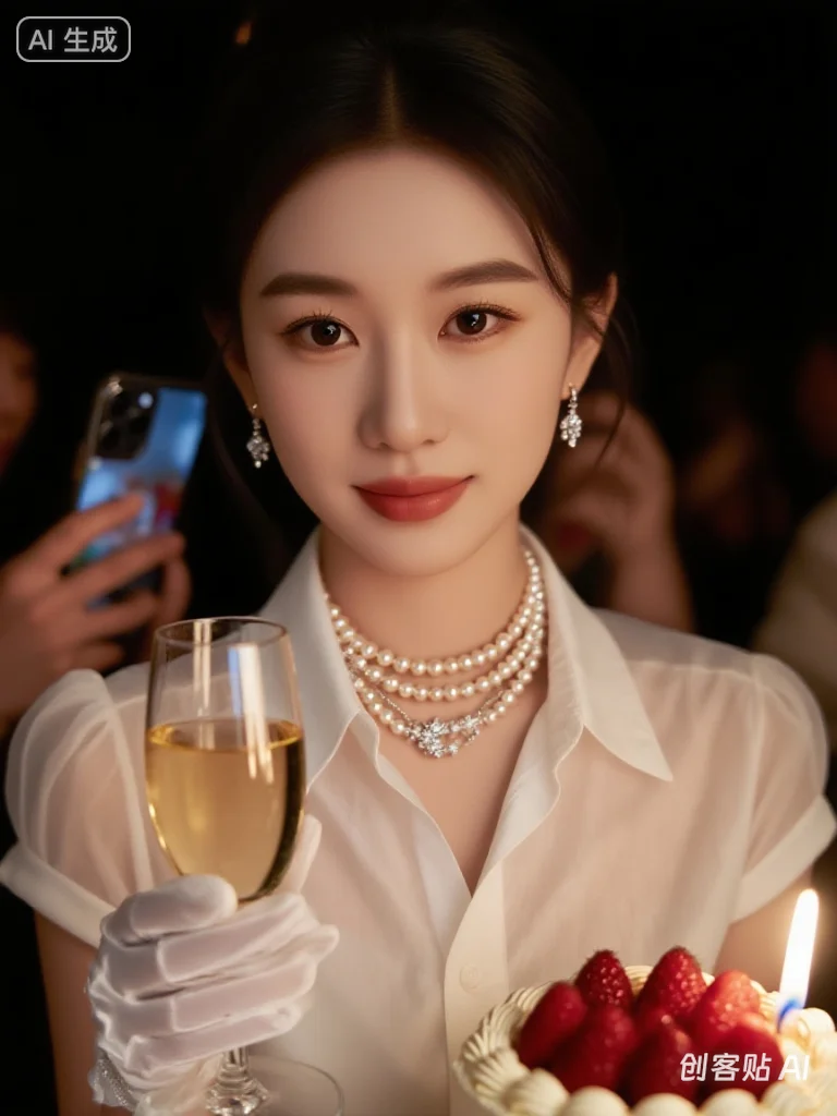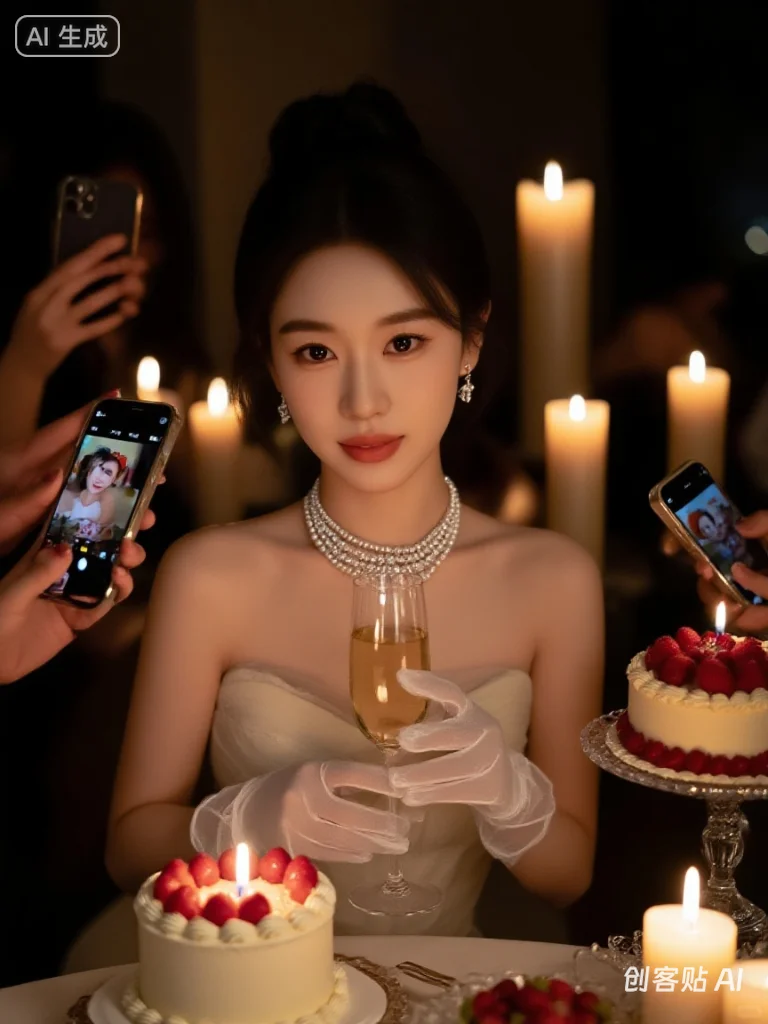 造出浪漫且有仪式感的氛围,光线主要来自多支燃烧的蜡烛,呈现出柔和温暖的烛光效果。 人物形象:一位妆容精致(清透底妆、自然眼妆、温柔唇色)的年轻女性,头发精致盘起,身着带有透明元素的优雅浅色系礼服,佩戴多层华丽珍珠项链(带有闪钻装饰)和耳饰,手部戴着白色薄纱手套,正手持香槟杯。 场景与互动:周围有多只手拿着手机,从不同角度拍摄记录这位女性,桌上摆放着装饰有红色水果的白色蛋糕,还有透明的精致器皿,整体画面质感细腻,光影层次丰富,突出烛光下的温馨与精致感