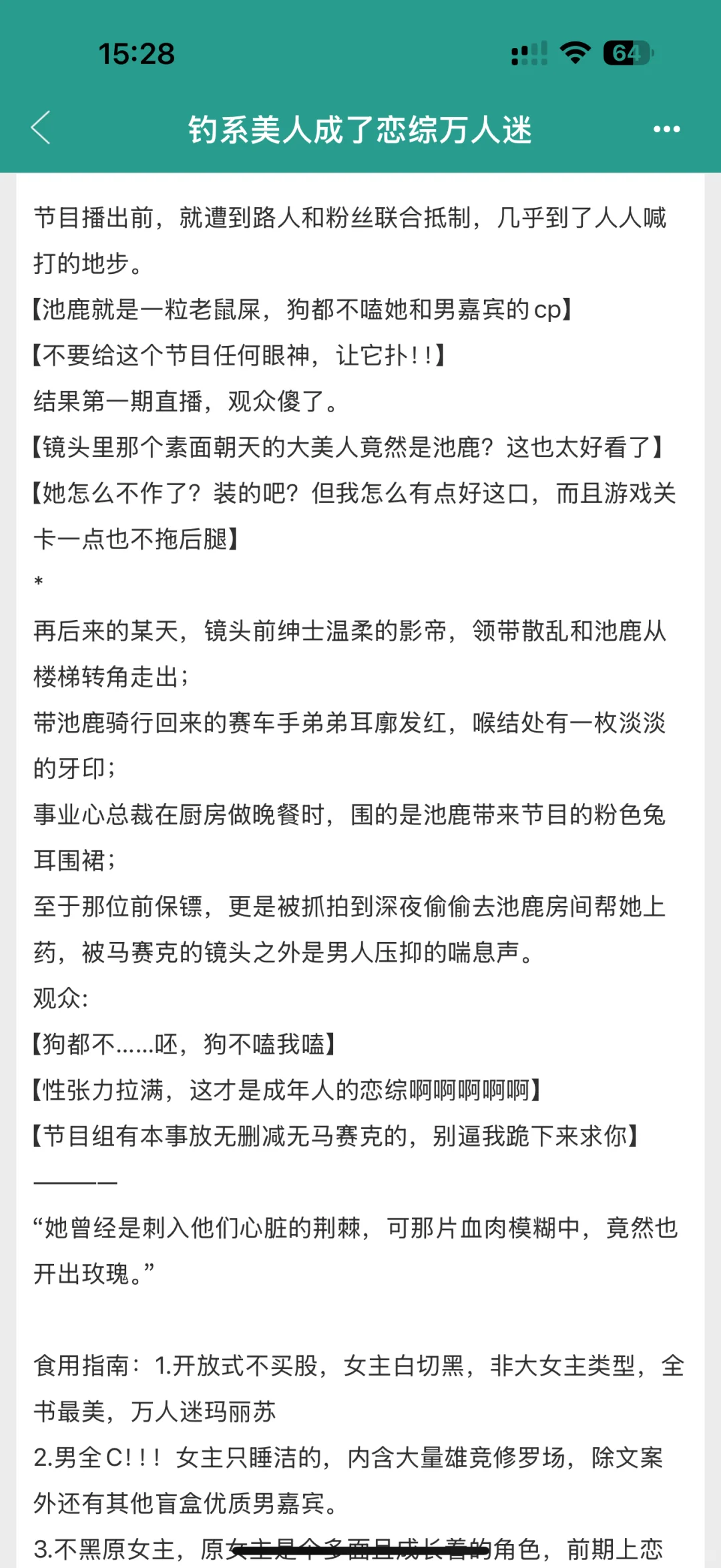 男嘉宾们则各有千秋,身强体壮的保镖、帅气影帝、放下身段的霸总、绿茶男大、赛车手弟弟……他们或高冷、或热情、或温柔、或霸道,无时无刻为了吸引女主的注意力,耍尽手段,费尽心机!!我真的笑鼠了哈哈哈#宝藏小说推荐 #完结小说推荐 #言情小说推荐 #温柔男主 #占有欲男主 #完结推文 #言情推文 #万人迷女主小说 #雄竞文