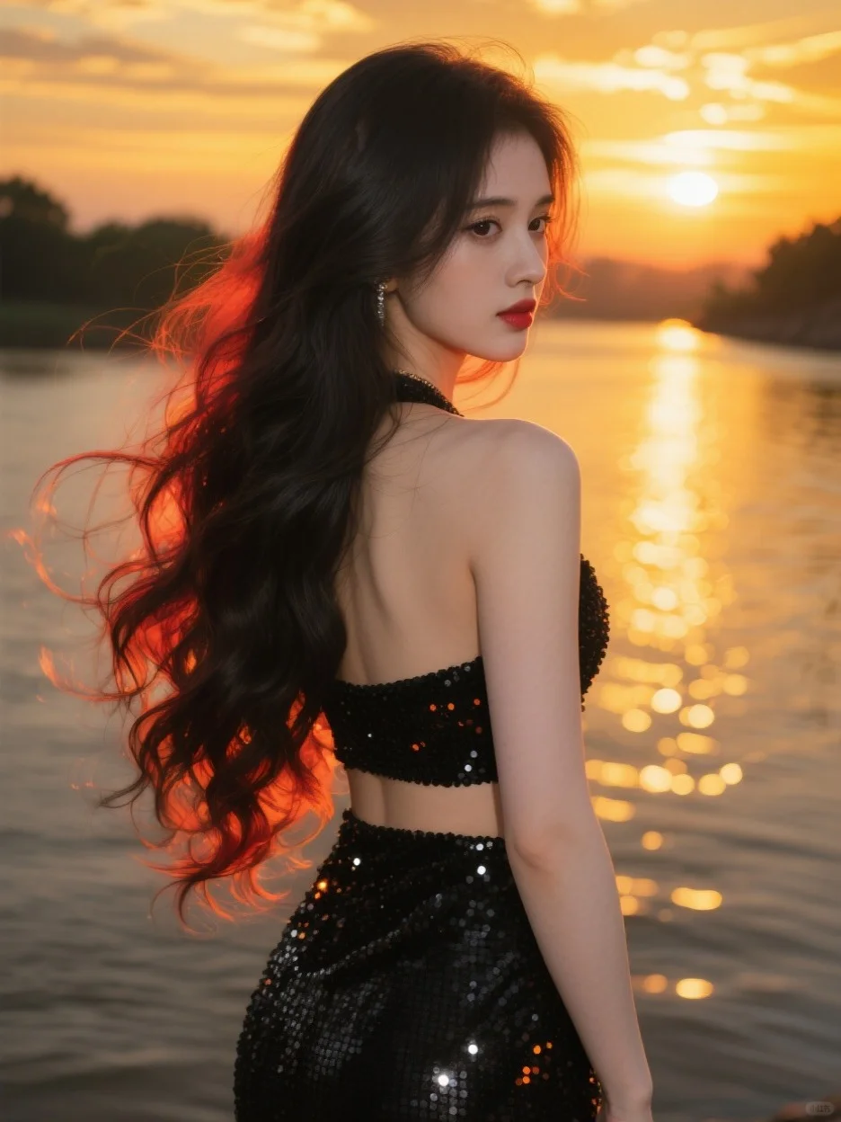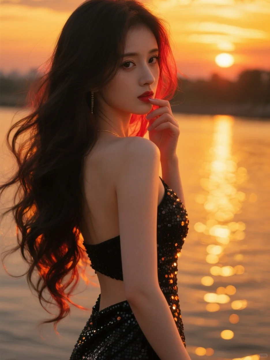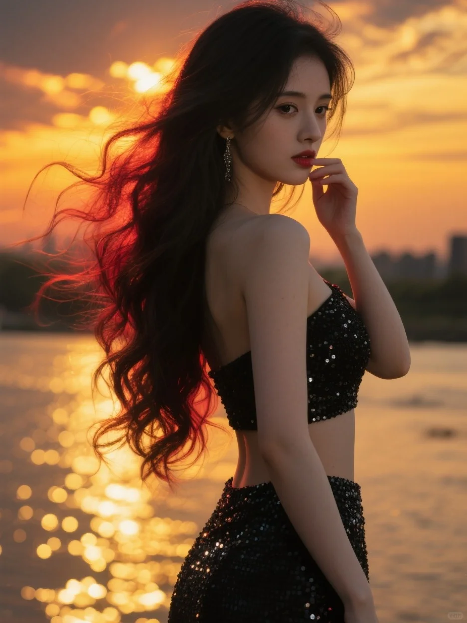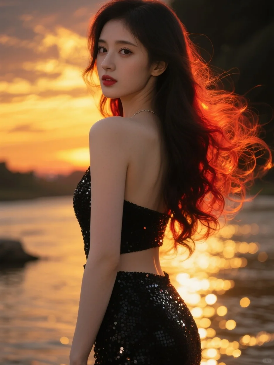 提示词:真实摄影,鞠婧cosplay,上半身特写,在河边,夕阳,火烧云,金黄色,金色的波光粼粼,不规则的反光点,疏密对比,昏暗的色调,黑色纹理,橙色暗调,纹理闪闪发光,近处,长发大波浪,黑色亮片低腰晚礼服,背影照,红橘黄色强逆光,发丝呈透明质感,发丝飞扬,尾指轻触下唇情绪写真,对焦模糊,动态模糊,脸部清晰,过曝,暗调,柔和侧光,发丝光,光影对比,蓬松凌乱的头发,光斑洒在脸上,五官立体,身材完美,极致腰臀比例,瓜子脸,妆容精致,睫毛长,绝美眼睛,含情脉脉的眼神,胶片摄影,镜头语言,淡彩,映射,反射,折射,个性视角,非对称,奇妙融合意境,超高颜值,既视感,现场感,情绪氛围感拉满,透视感,暗朦,光朦,泛白,褪色,漏光,胶片颗粒质感,层次丰富,写意,概念艺术,发型光,发丝光,脸部补光,侧逆光,磨砂,朦胧美学,复古,超现实,高级感,杰作,绝妙构图,电影质感,获奖作品,32K高清画质,32K细腻真人皮肤纹理,前景虚化,背景模糊。