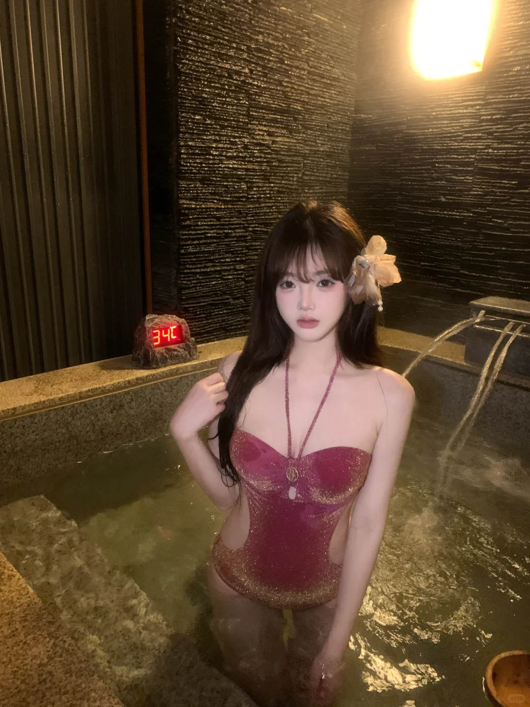 冬天就是要泡温泉呀~泡汤也要美美嘟 穿了一件非常显身材的泳衣 侧面镂空设计很有小心机~泳衣爆闪的设计也很亮眼 氛围感拿捏啦