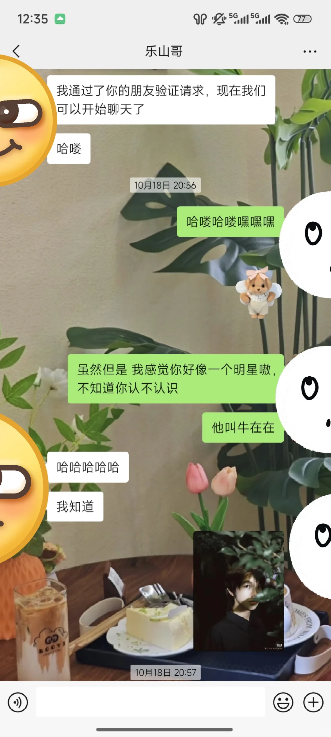 周六我和朋友去乐山玩,路过一个影像打卡点的时候,我朋友看到他在那边拍视频,我当时就觉得他很帅,很像一个明星牛在在~(秀人DNA)然后我就去找他问可不可以拍个合照,同意了后,聊了几句发现他是个博主就关注了下他的平台账号,然后加了个微信~