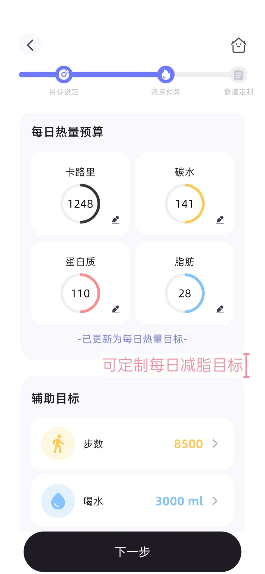 2.输入身高、体重和平时的运动习惯等,app就会根据这些数据,自动推荐适合我的每日热量摄入值,不用我去费心琢磨,跟着吃就很安心!