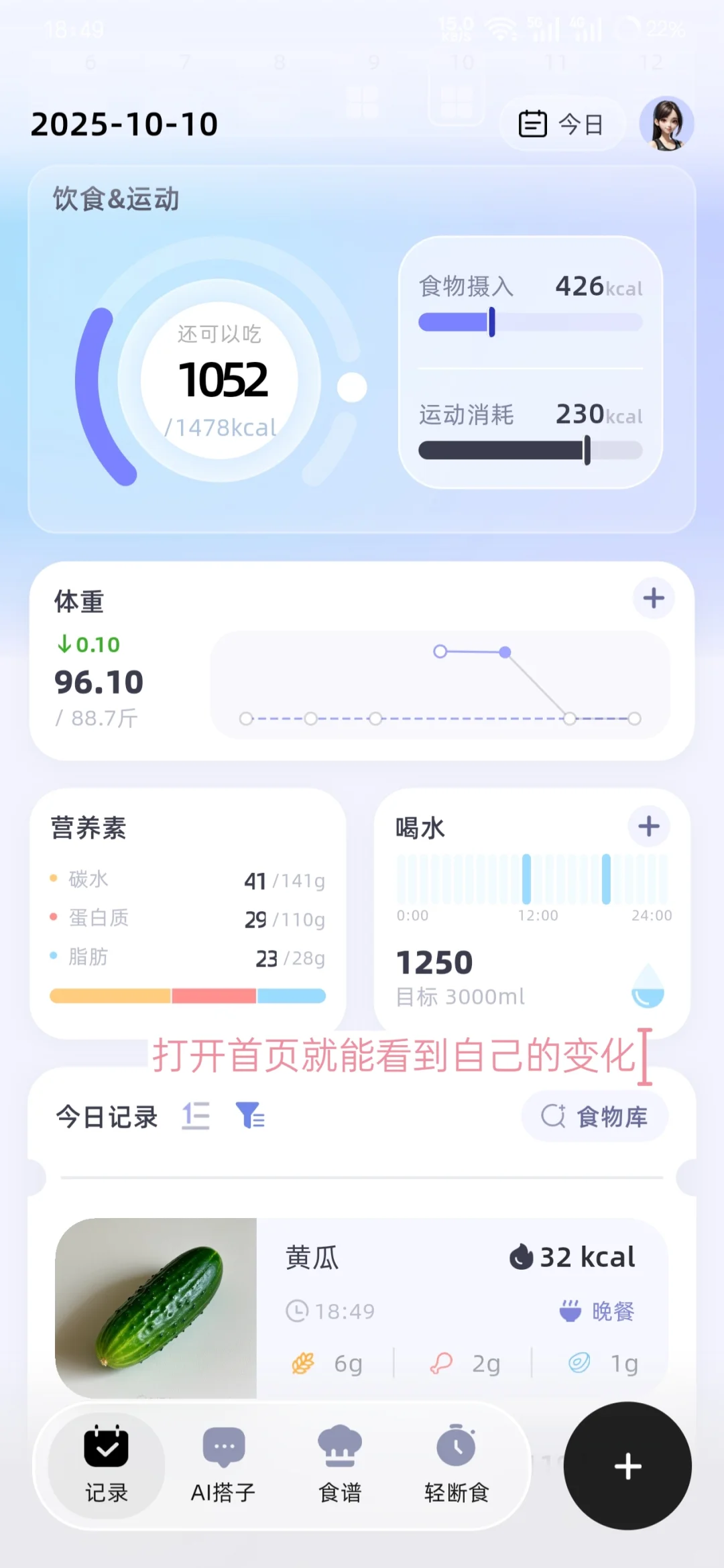 3.不仅能记每天吃了多少热量,体重、腰围这些围度数据,还有运动消耗的热量,都能快速记录下来,打开首页就能看到自己的变化,看着数据一点点变好,自律的动力都更足了!