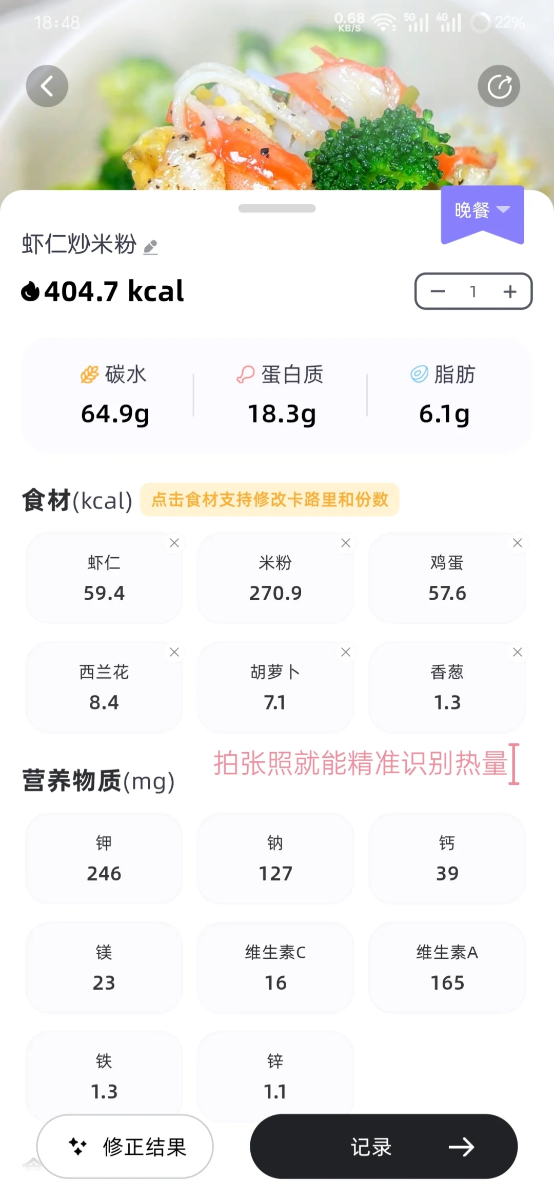 1.之前用别的软件记饮食要手动搜半天,这个不管是外卖、家常菜还是零食,拍张照基本都能精准识别出热量,不用自己瞎算,对懒人太友好了!