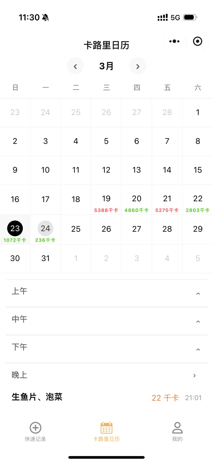 3. 日历追踪模式:每天吃了啥,摄入多少热量,统统有记录,减脂期真的太有安全感了!