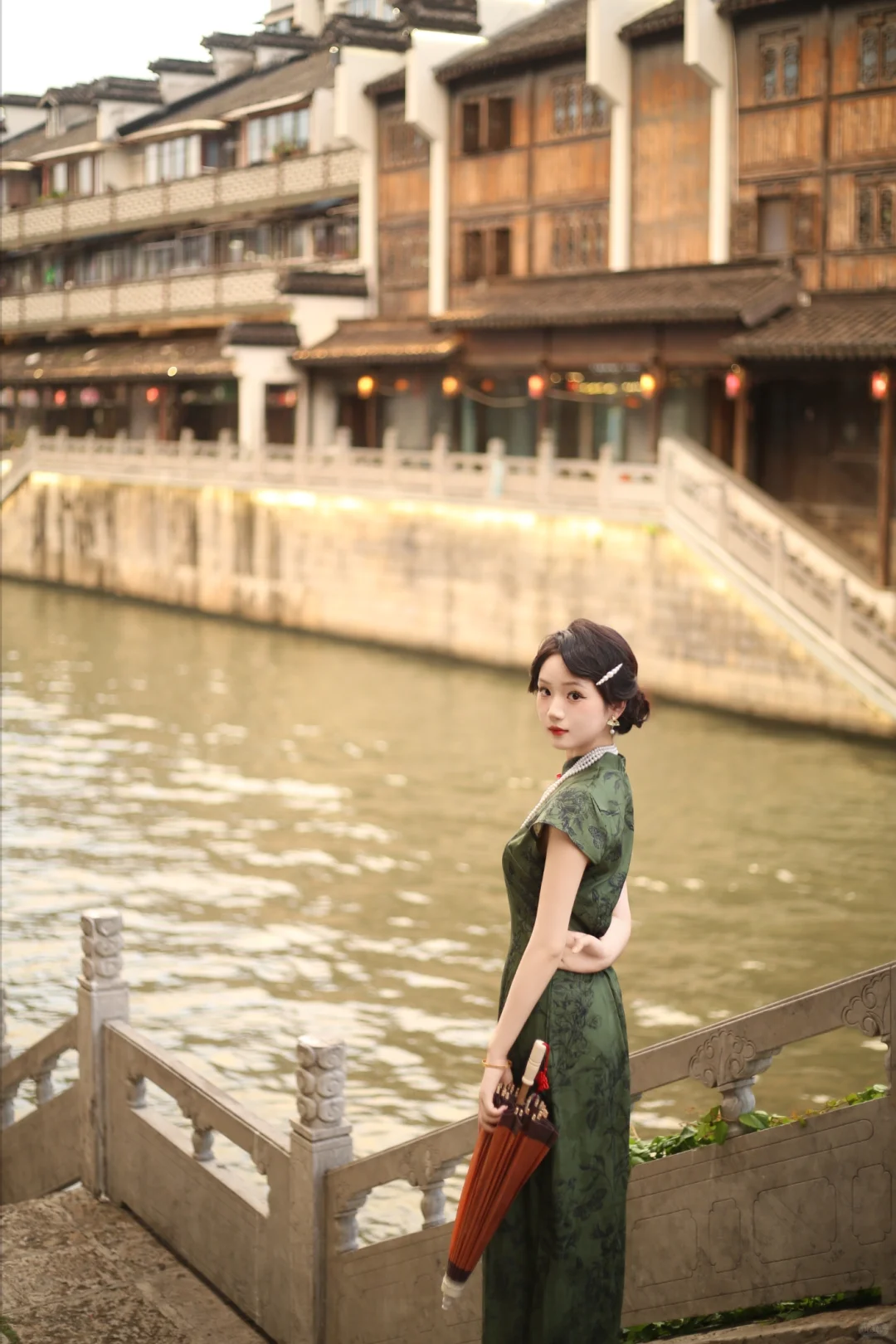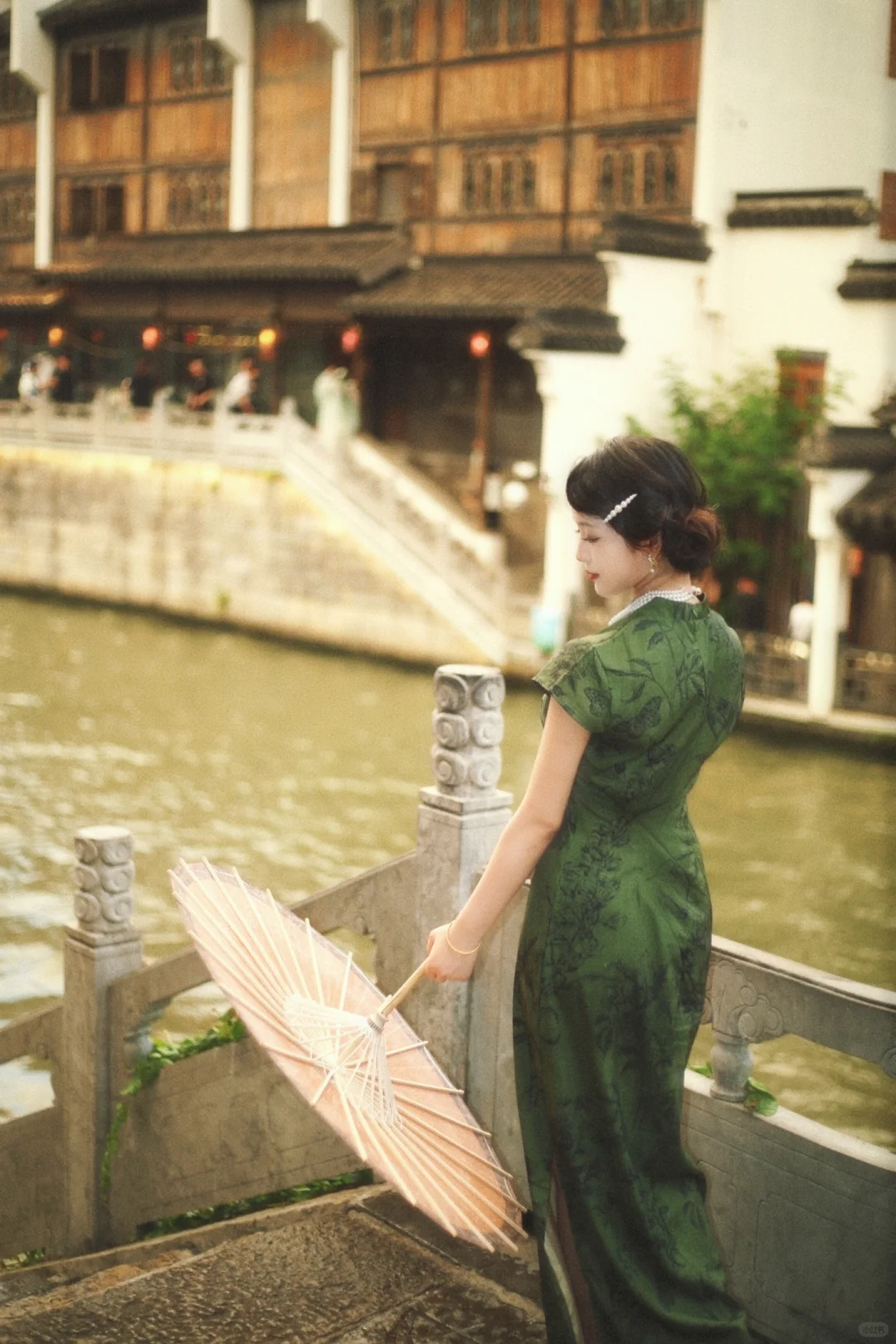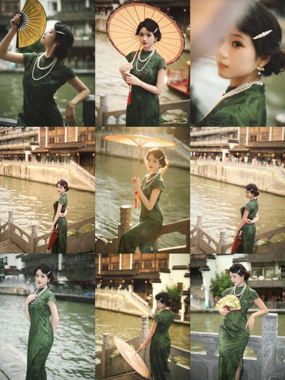 选了件墨绿色的旗袍,盘扣是暗红色的,像藏在暮色里的星子。发型师做手推波时,卷棒的温度混着桂花发油的香。他说老南京的姑娘都爱这弧度,“能把秦淮河的水都弯进眉眼间”。 果然,等我撑着竹骨油纸伞站在文德桥边,风一吹,鬓角的卷儿真的跟着河浪晃。