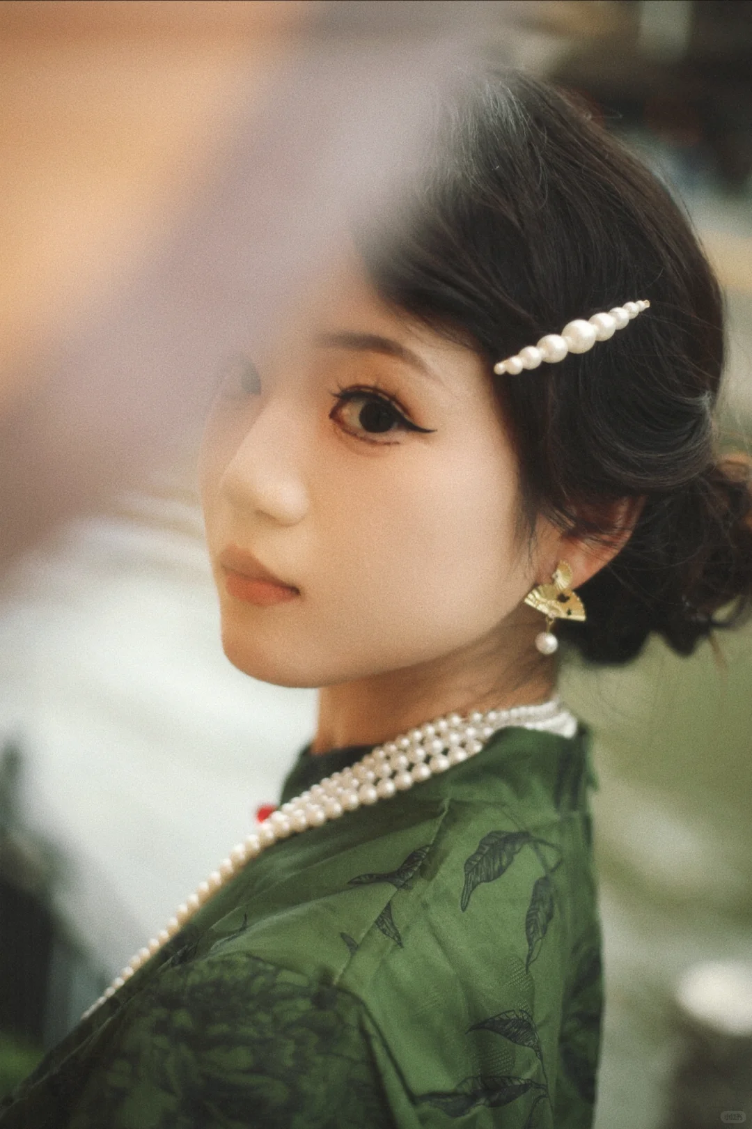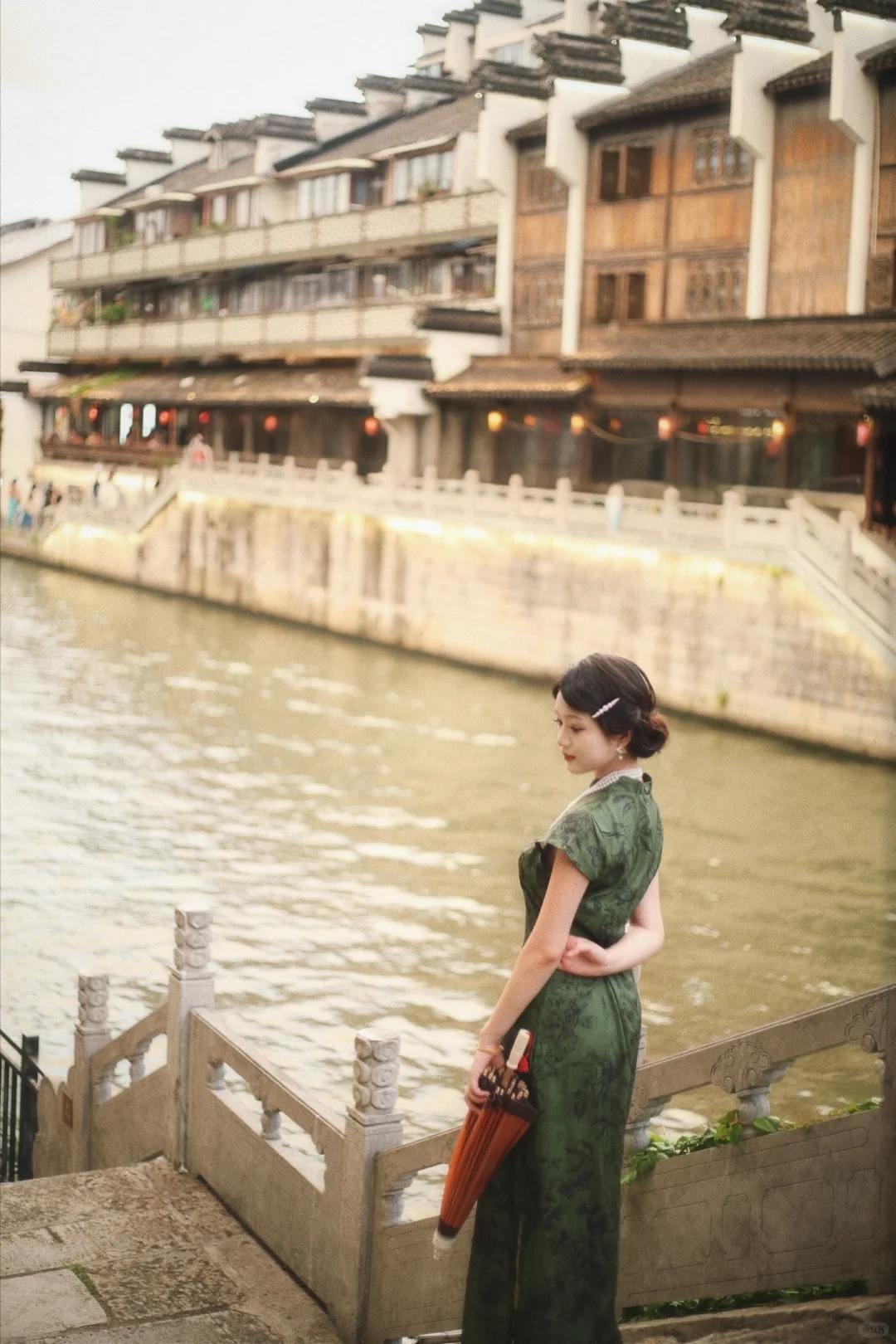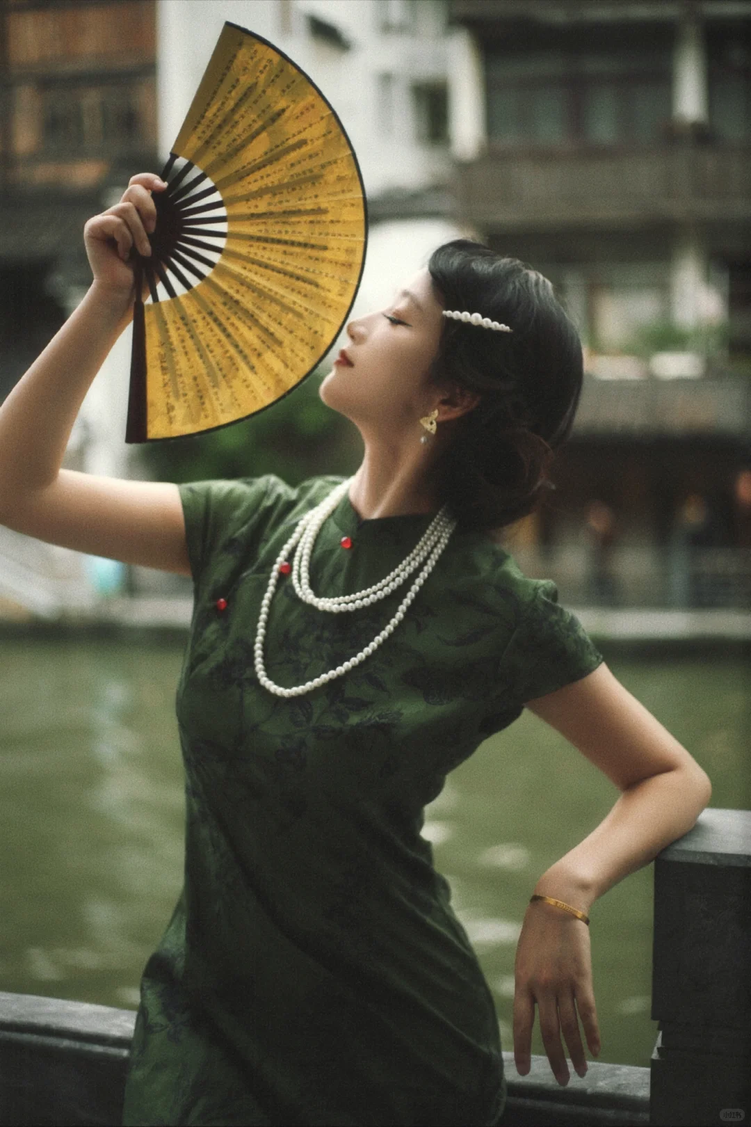 选了件墨绿色的旗袍,盘扣是暗红色的,像藏在暮色里的星子。发型师做手推波时,卷棒的温度混着桂花发油的香。他说老南京的姑娘都爱这弧度,“能把秦淮河的水都弯进眉眼间”。 果然,等我撑着竹骨油纸伞站在文德桥边,风一吹,鬓角的卷儿真的跟着河浪晃。