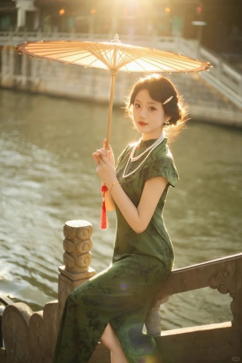 ▫️抱伞回头的瞬间要急一些。逆光里,伞面成了半透明的琥珀,旗袍的暗纹突然亮起来,连鬓角的碎发都沾着光。“你看河面”他指给我看,波光正漫到我鞋尖,像给整个画面加了层柔光滤镜。