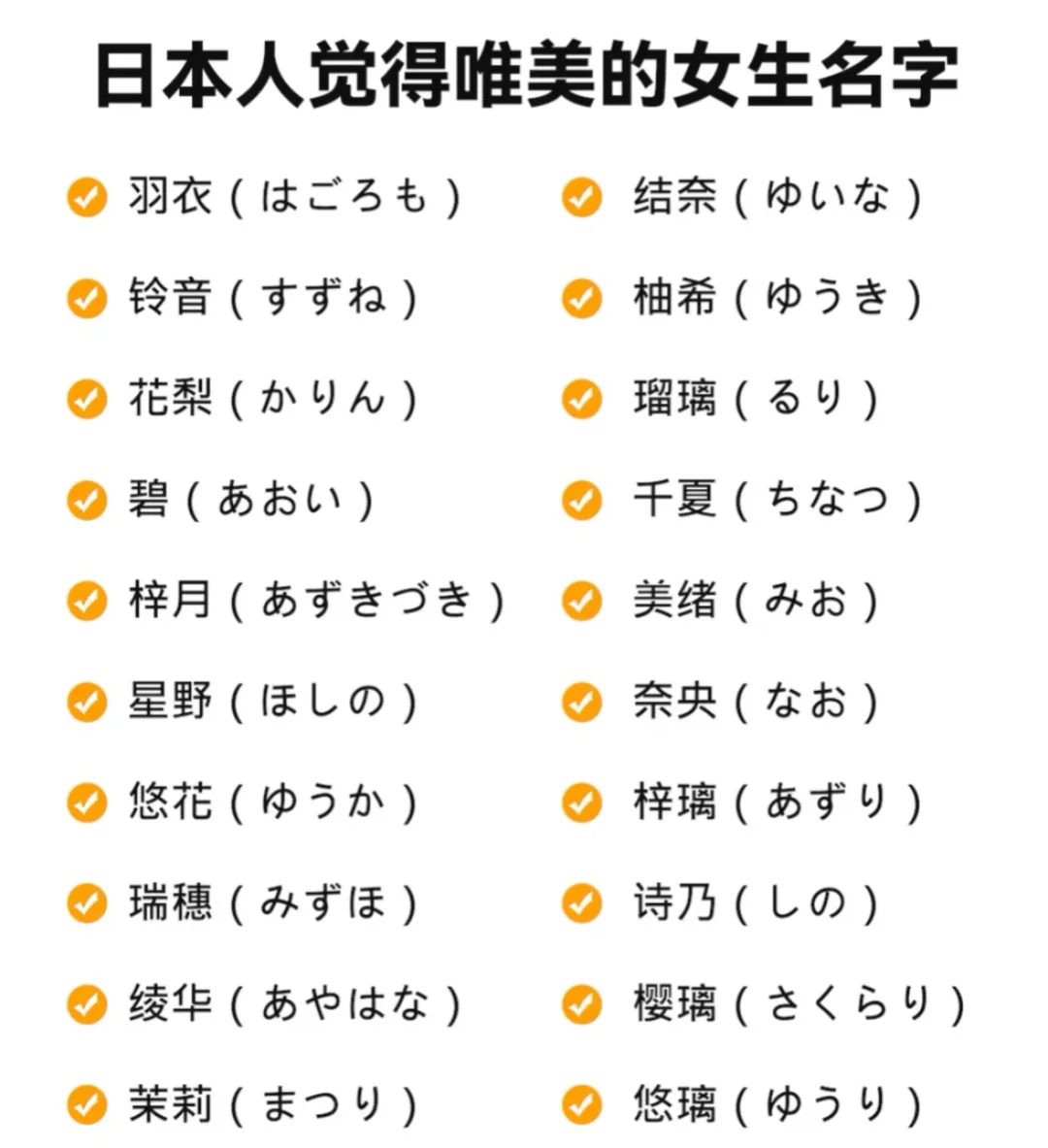 男生篇有“慎吾(しんご)”“航生(こうき)”这类很有少年感的,还有“雄大(ゆうだい)”“拓哉(たくや)”这种听着就很帅气的~女生篇“羽衣(はごろも)”“铃音(すずね)”,温柔又唯美,像从日漫里走出来的名字✨