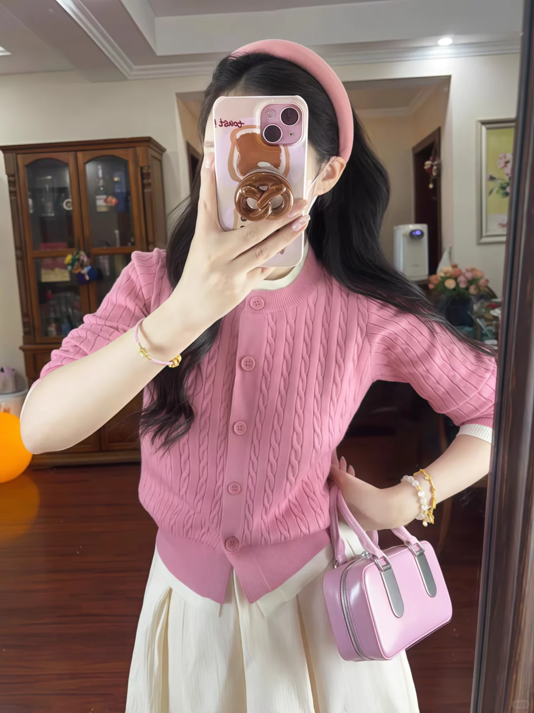 这套甜美少女穿搭的亮点在于平衡感:粉色柔和甜美,半裙的利落剪裁增添一丝俏皮的酷感。面料也超贴心,上衣亲肤透气,半裙垂顺不易皱,逛街约会穿一天都自在。小细节也很加分,比如裙子的口袋设计实用,腰头处理得贴合不勒肉,小个子也能穿出好比例。