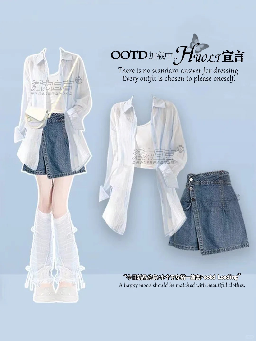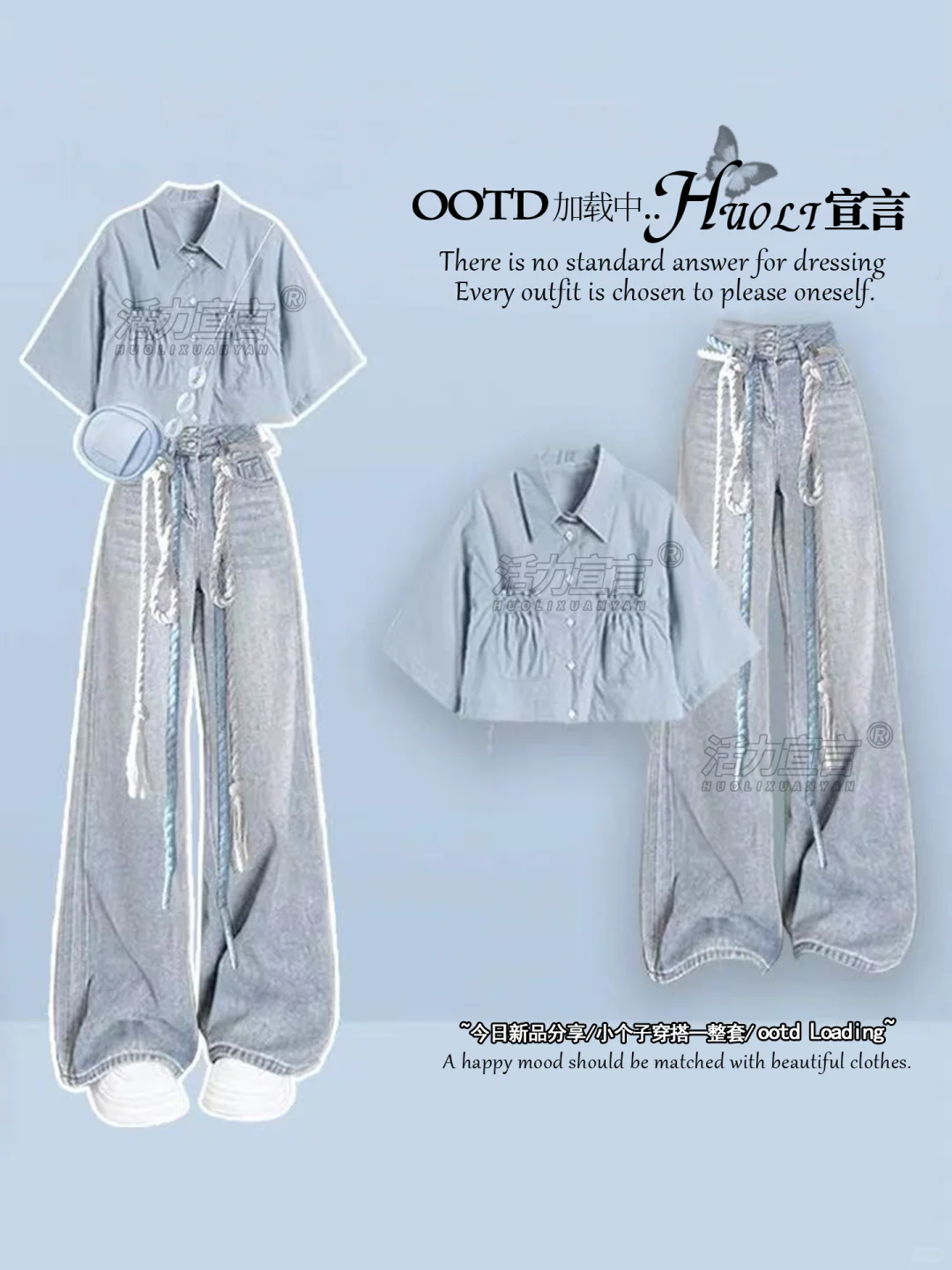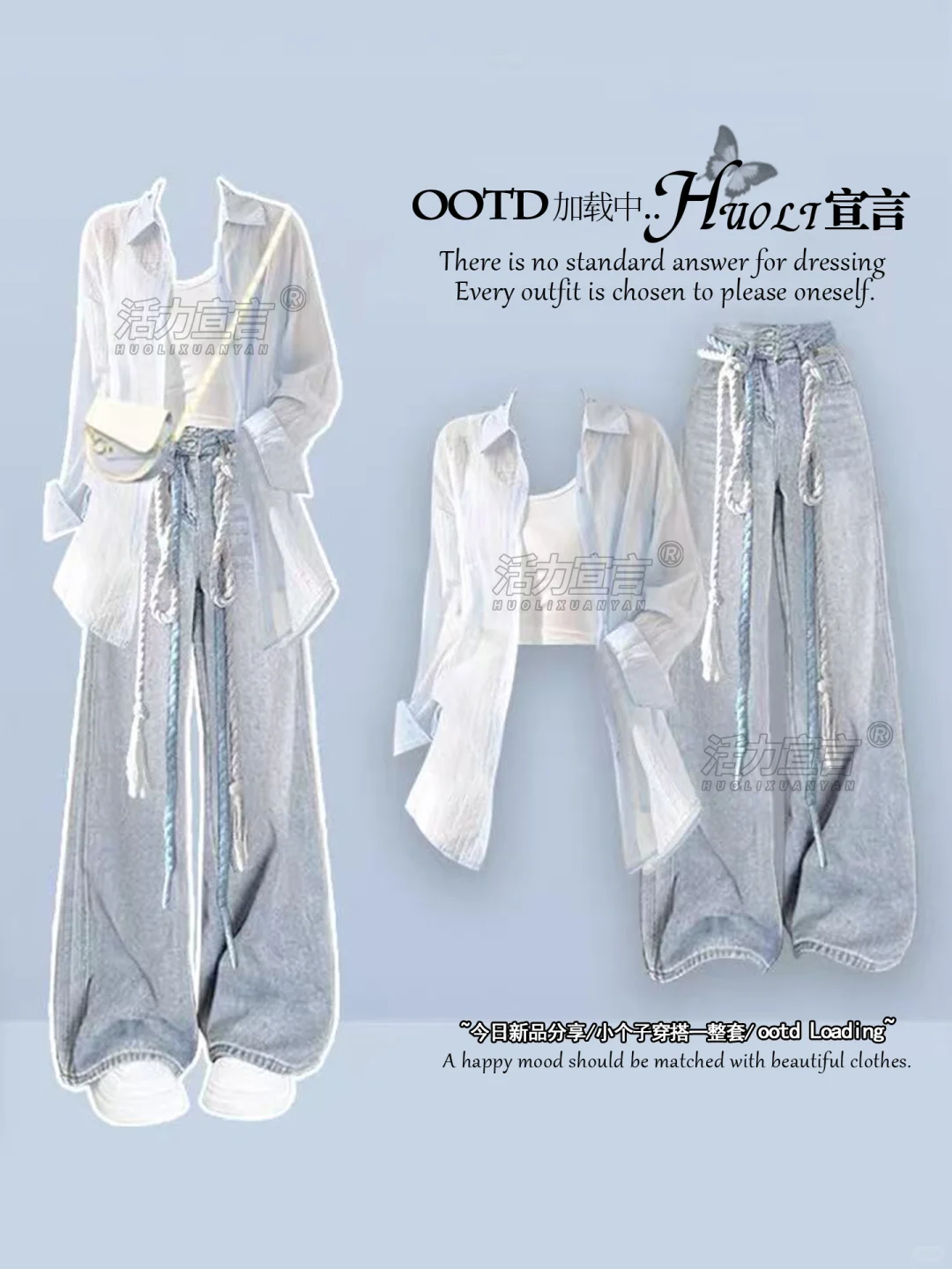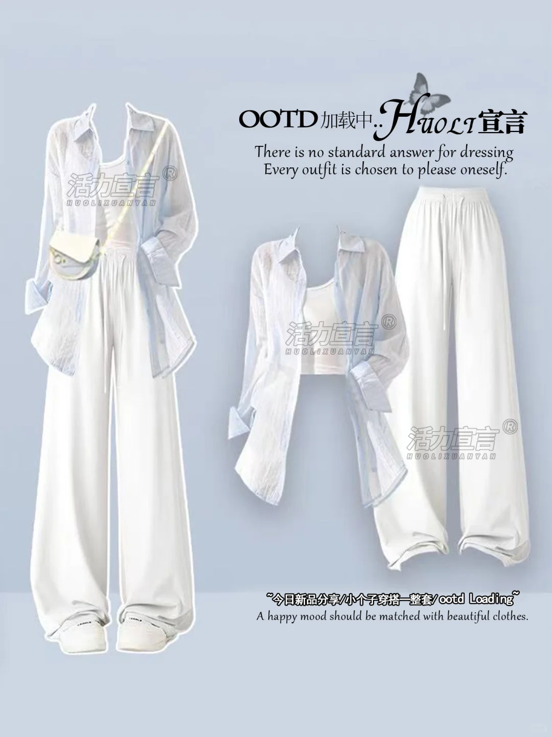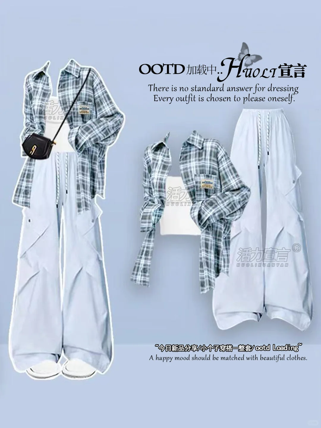 浅蓝衬衫+同色系阔腿裤,慵懒又松弛😌 配上小吊带叠穿,随性中带点小性感,蹦迪都不怕走光~格纹外套混搭奶白内搭,韩里韩气💫 拍照秒出氛围感,发朋友圈被问爆链接!