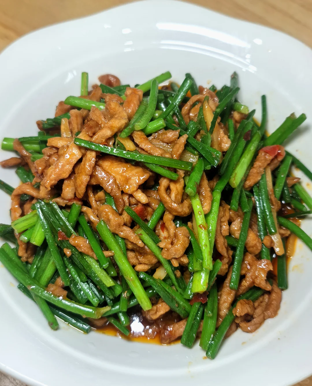 2️⃣ 爆香泡姜丝和豆瓣酱,滑炒肉丝变色加入韭菜花,根据自己口味来加盐调味,炒匀出锅!