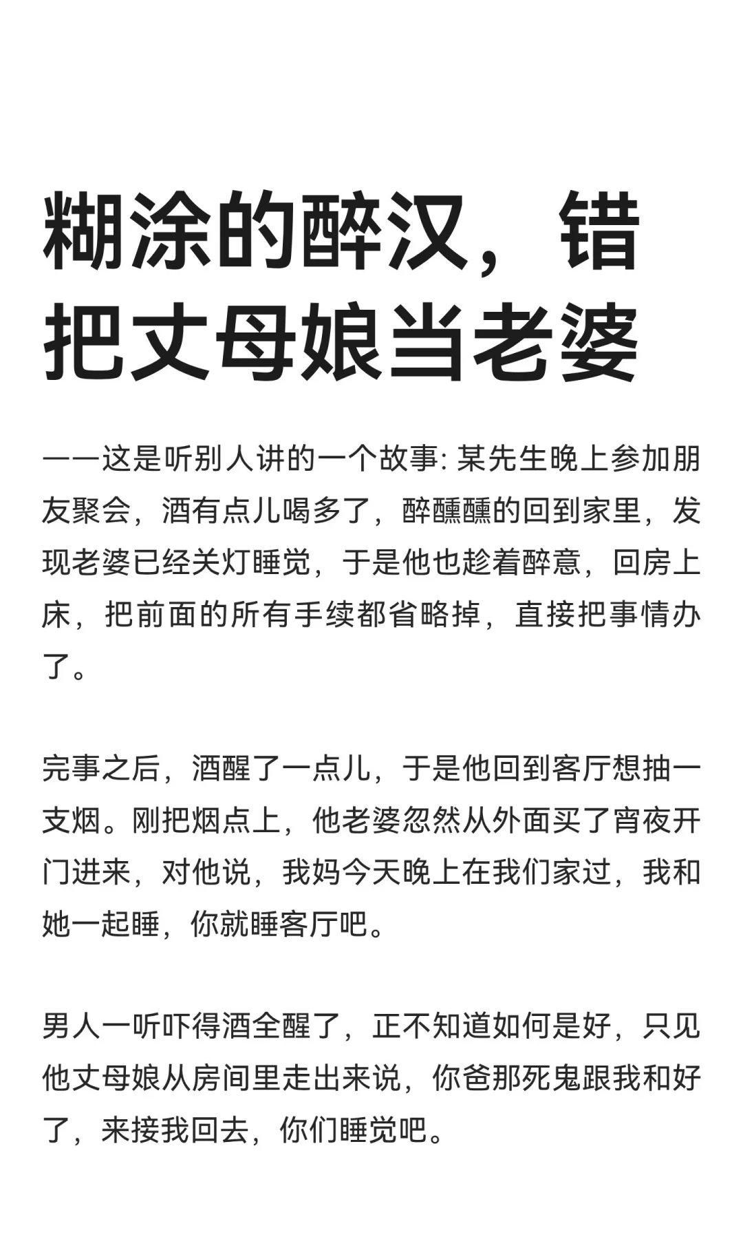 男人一听吓得酒全醒了,正不知道如何是好,只见他丈母娘从房间里走出来说,你爸那死鬼跟我和好了,来接我回去,你们睡觉吧