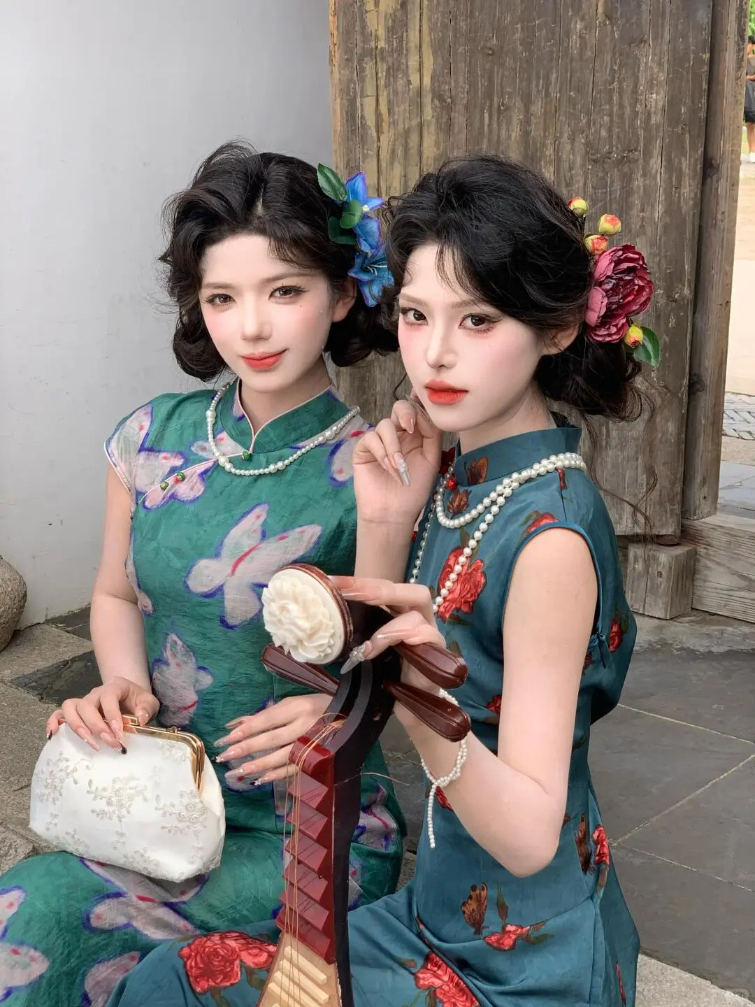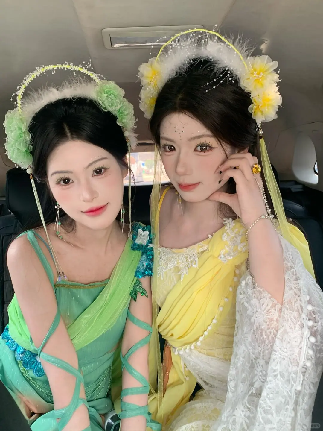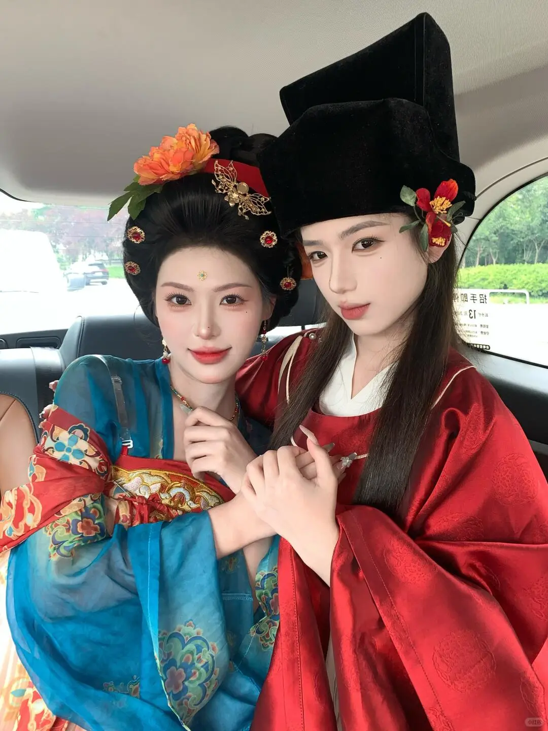 不全拍也能美!选 2-3 个互补色系(比如红 + 绿、蓝 + 紫),同款发髻配流苏,站成一排转身的瞬间,童年回忆杀直接戳中~