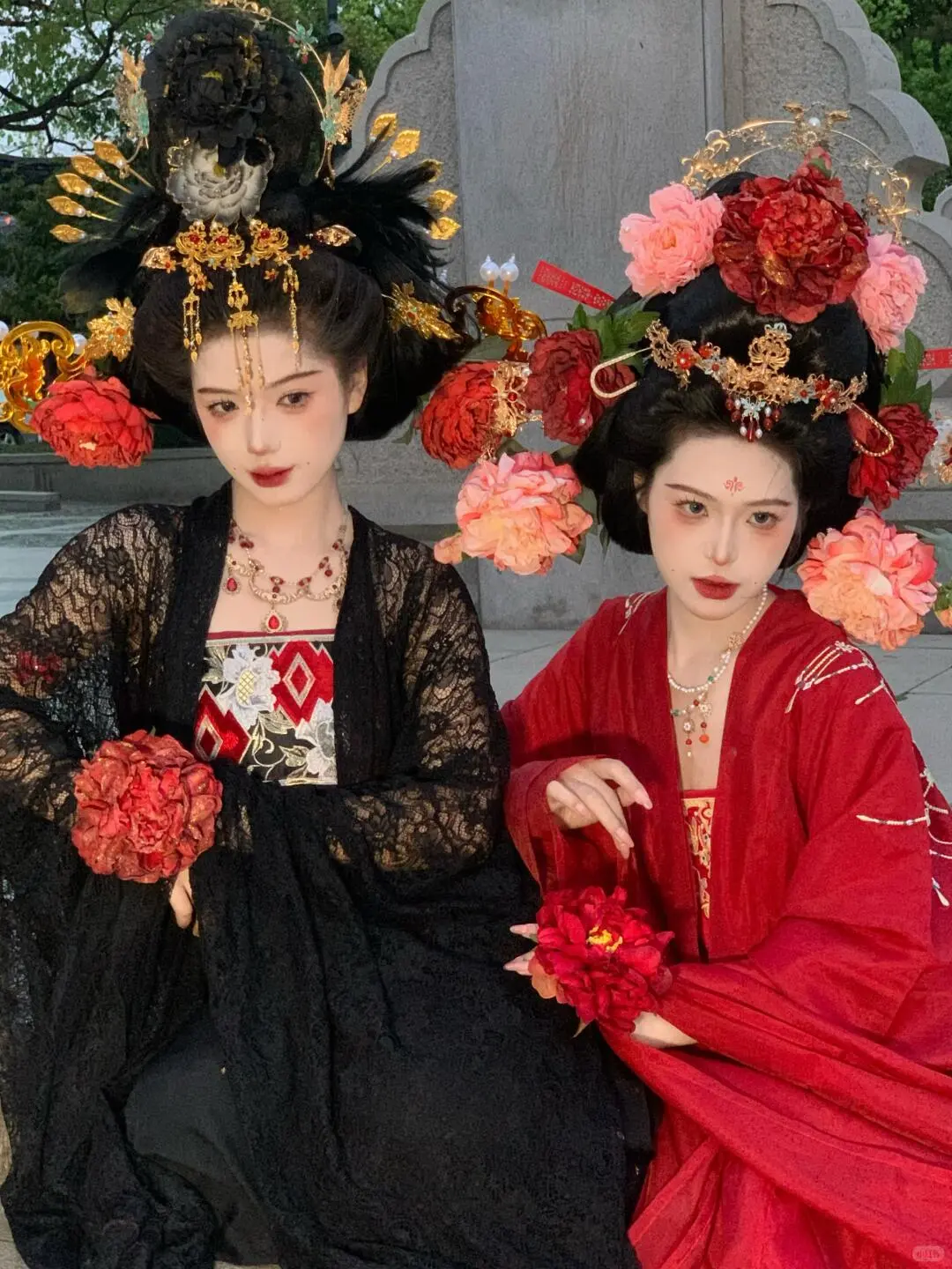 华丽唐装 + 满头金饰,裙摆扫过花径时,一个捂嘴偷笑,一个提裙追赶,把盛唐的热闹与娇憨全拍出来。