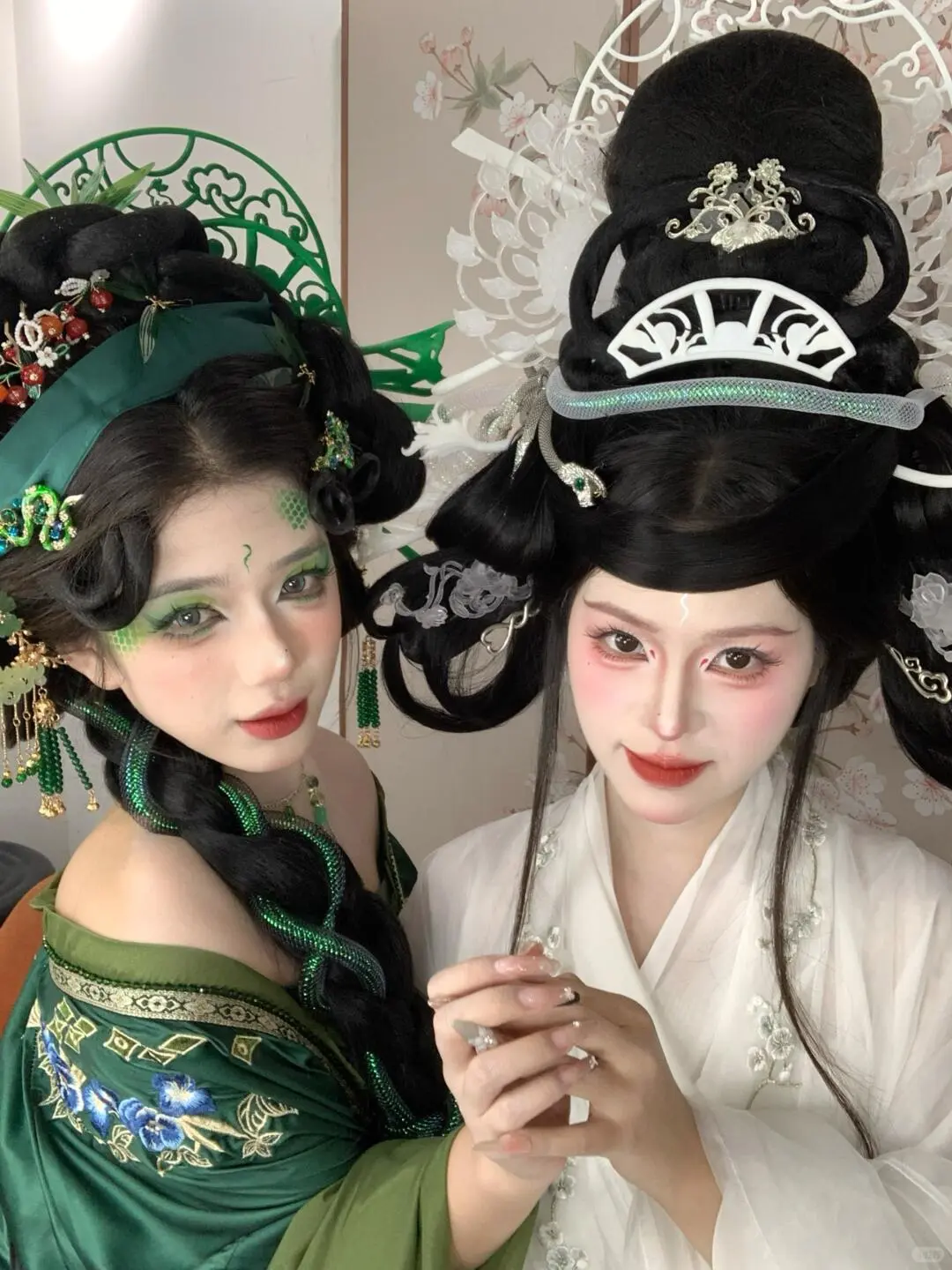 青色纱裙配蛇形发饰,白色襦裙衬素色妆容,一个媚眼如丝,一个清冷出尘,互动时的眼神戏超有故事感。