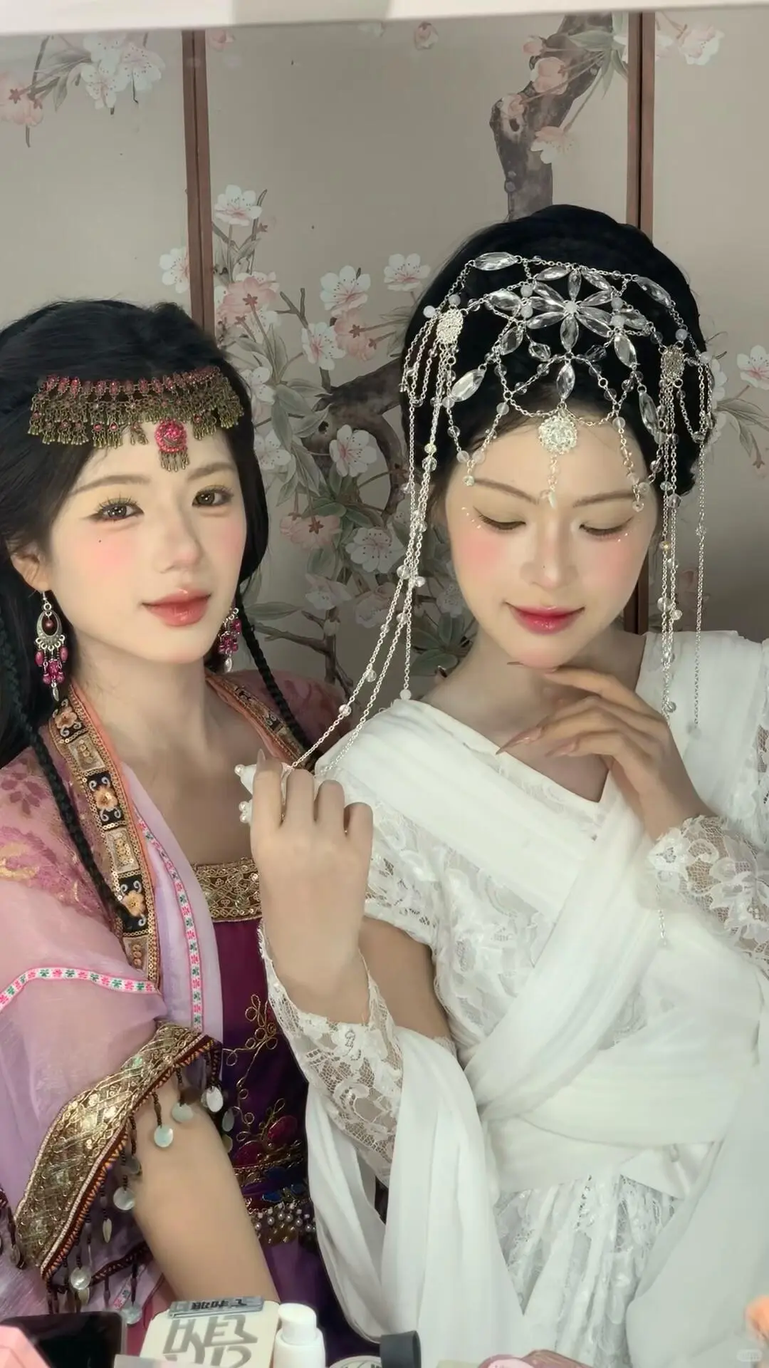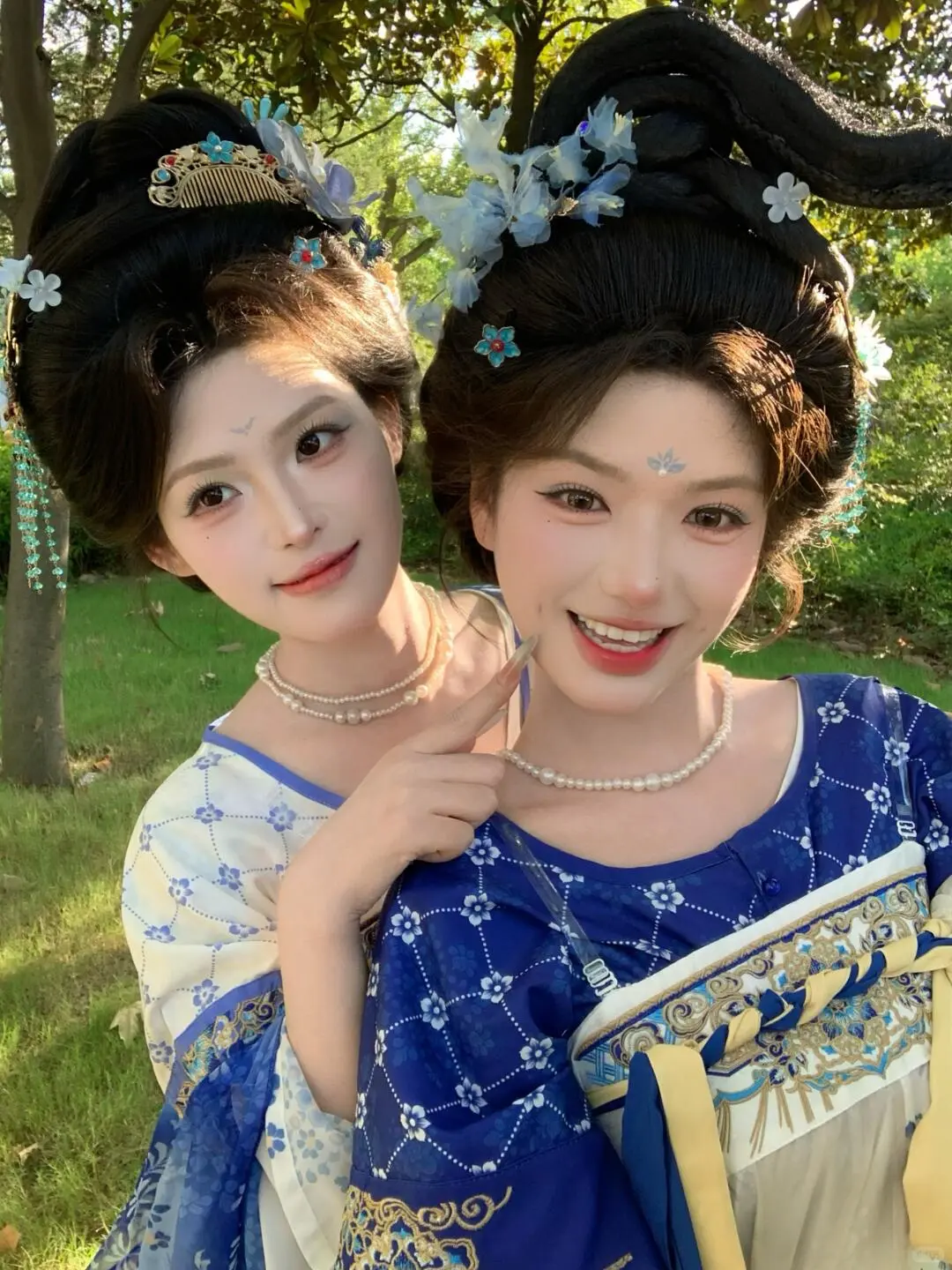青白配色自带江南温婉,衣裙绣满缠枝莲纹,手持团扇并肩而立,像从瓷瓶上走下来的古典美人。