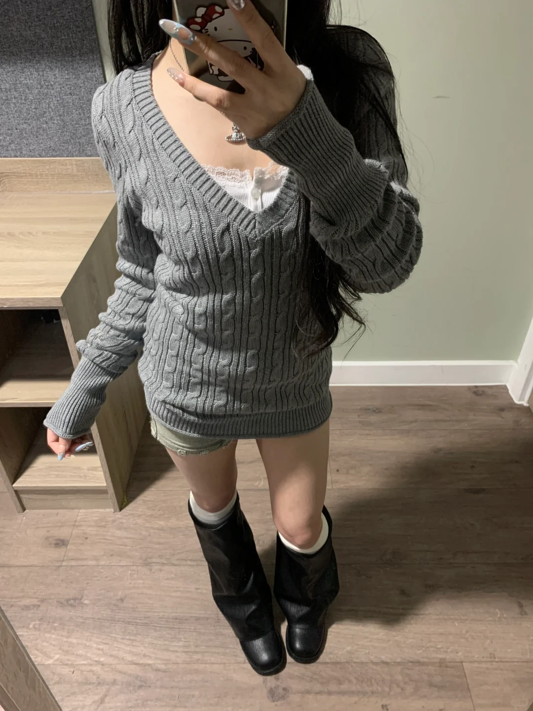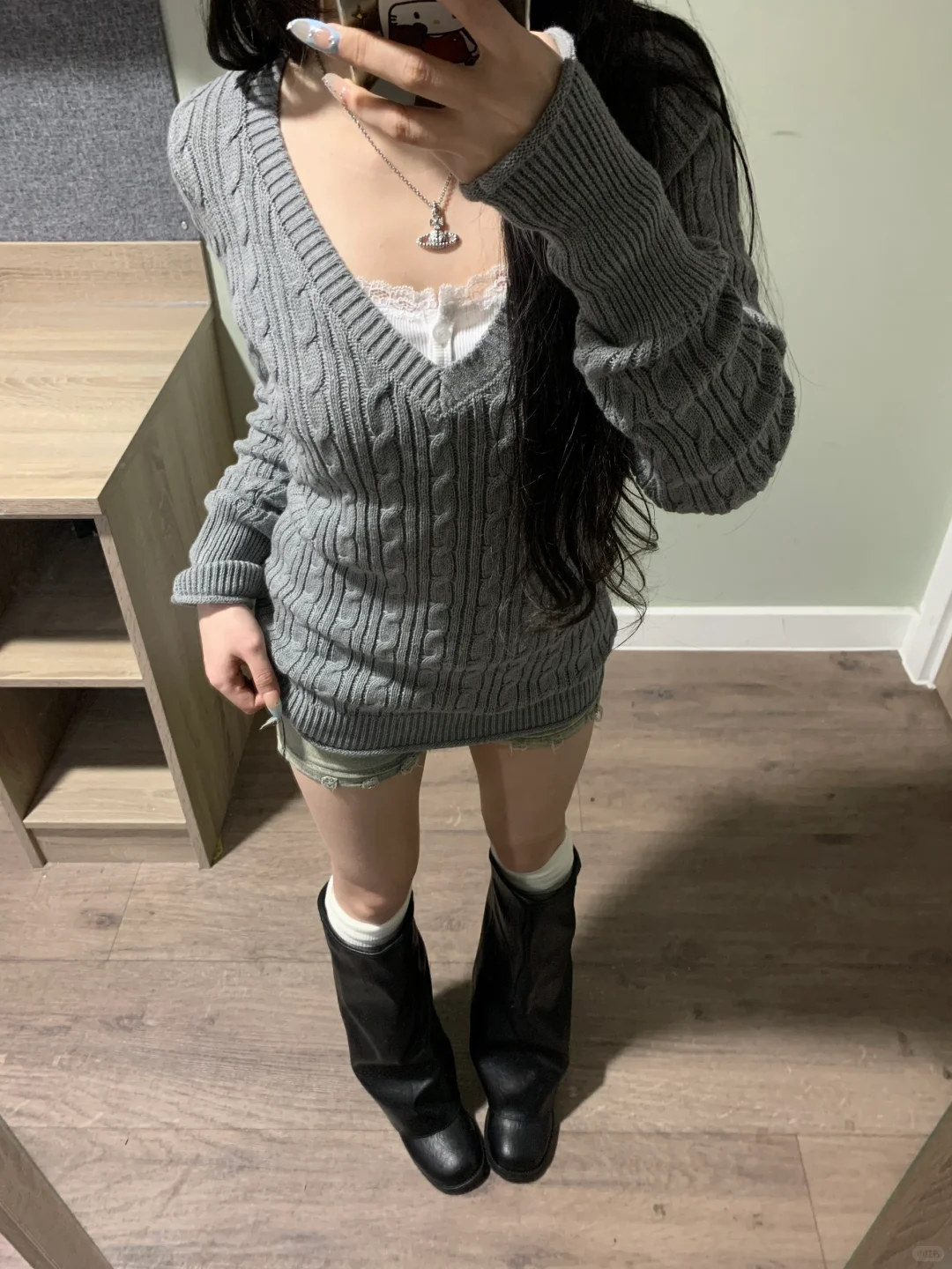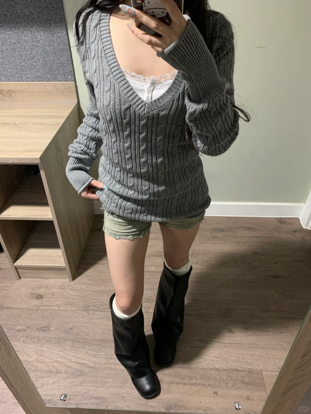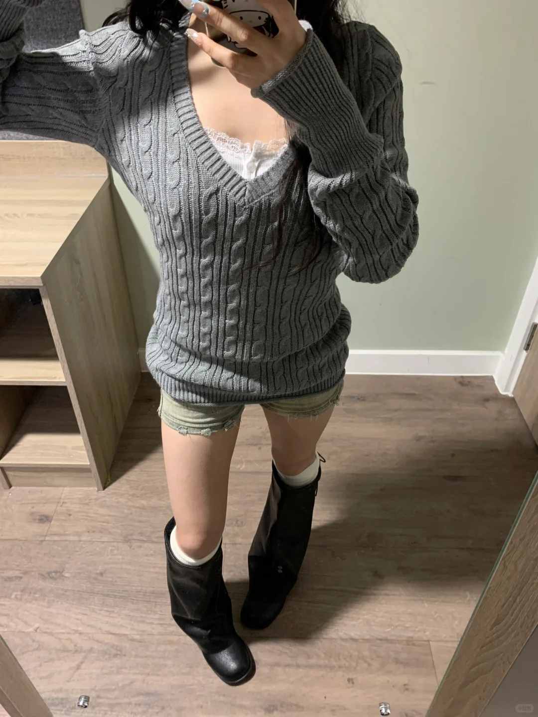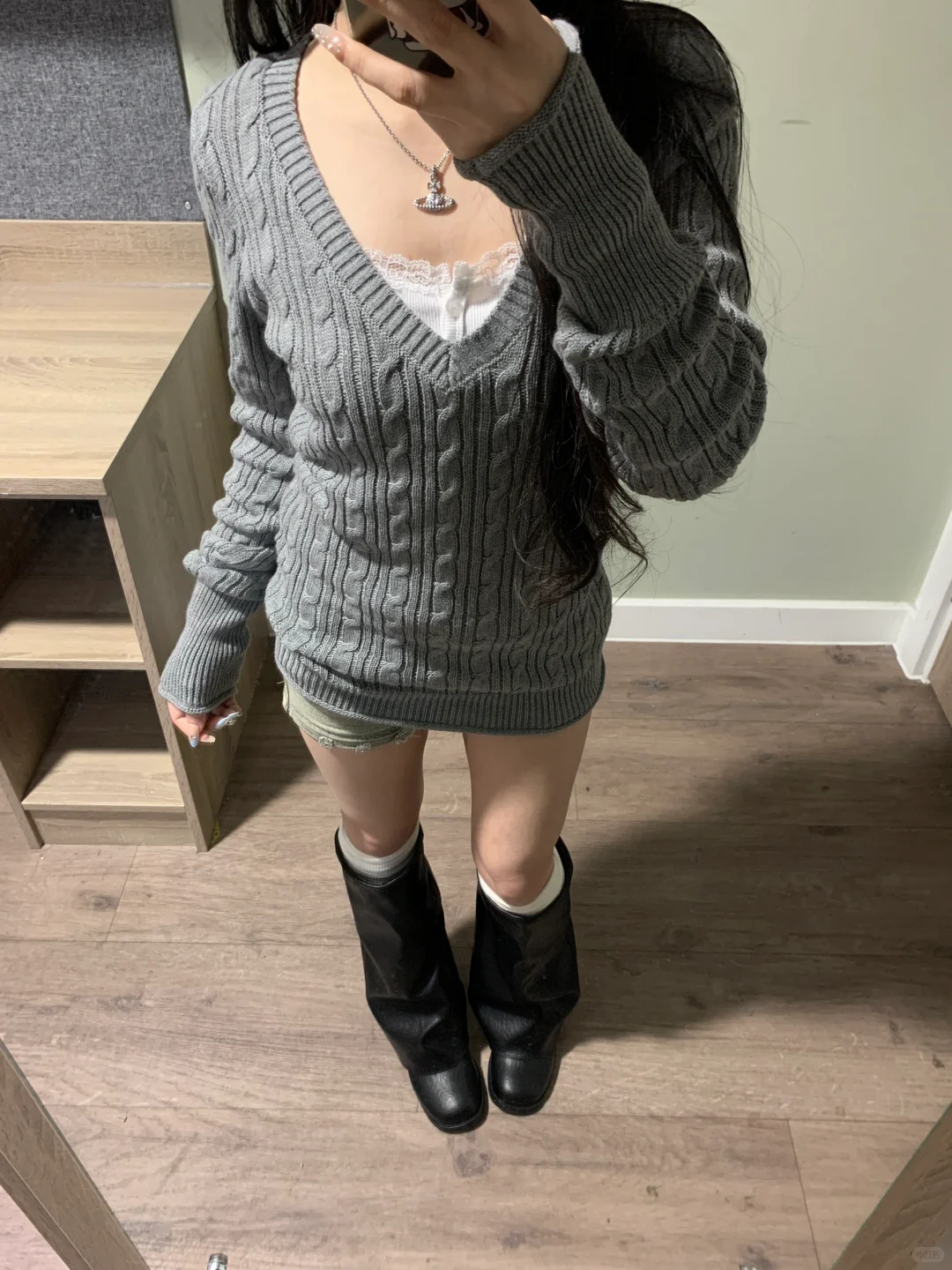 开辟蕾丝三粒扣新穿法 叠穿v领毛衣穿穿新靴子超级显腿长嘿嘿