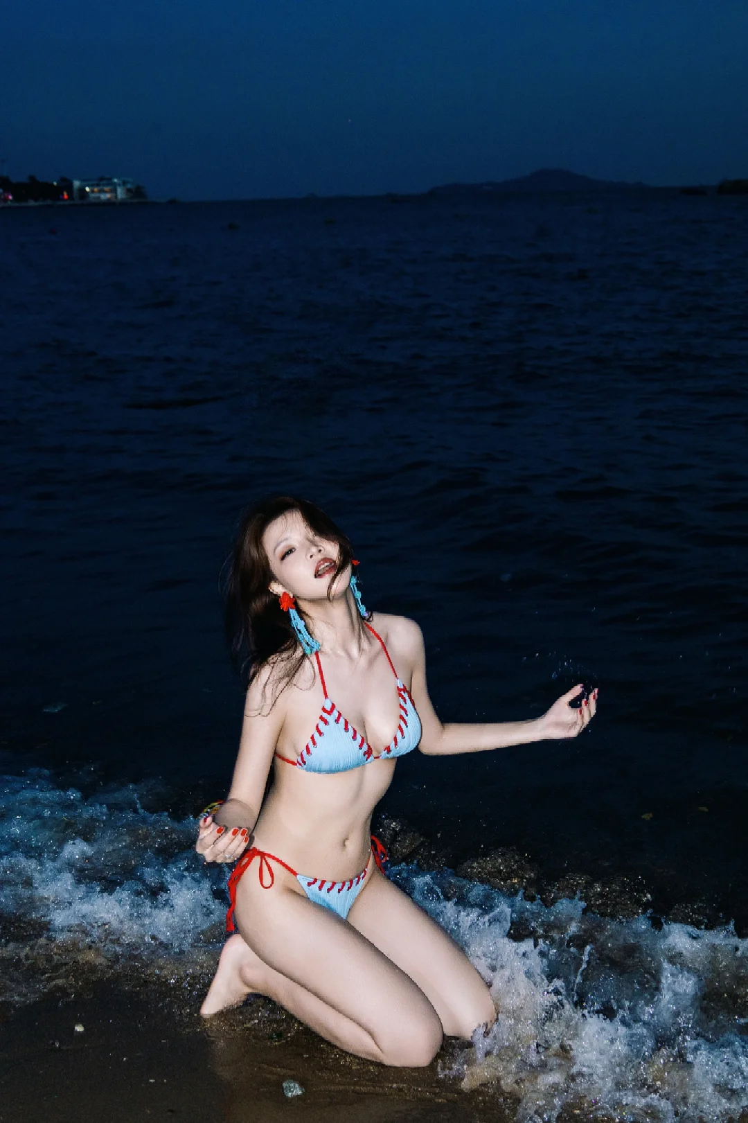 - 穿搭:选亮色比基尼(图中蓝红撞色超显白!),再戴大耳环、细腰链,精致感瞬间up~
