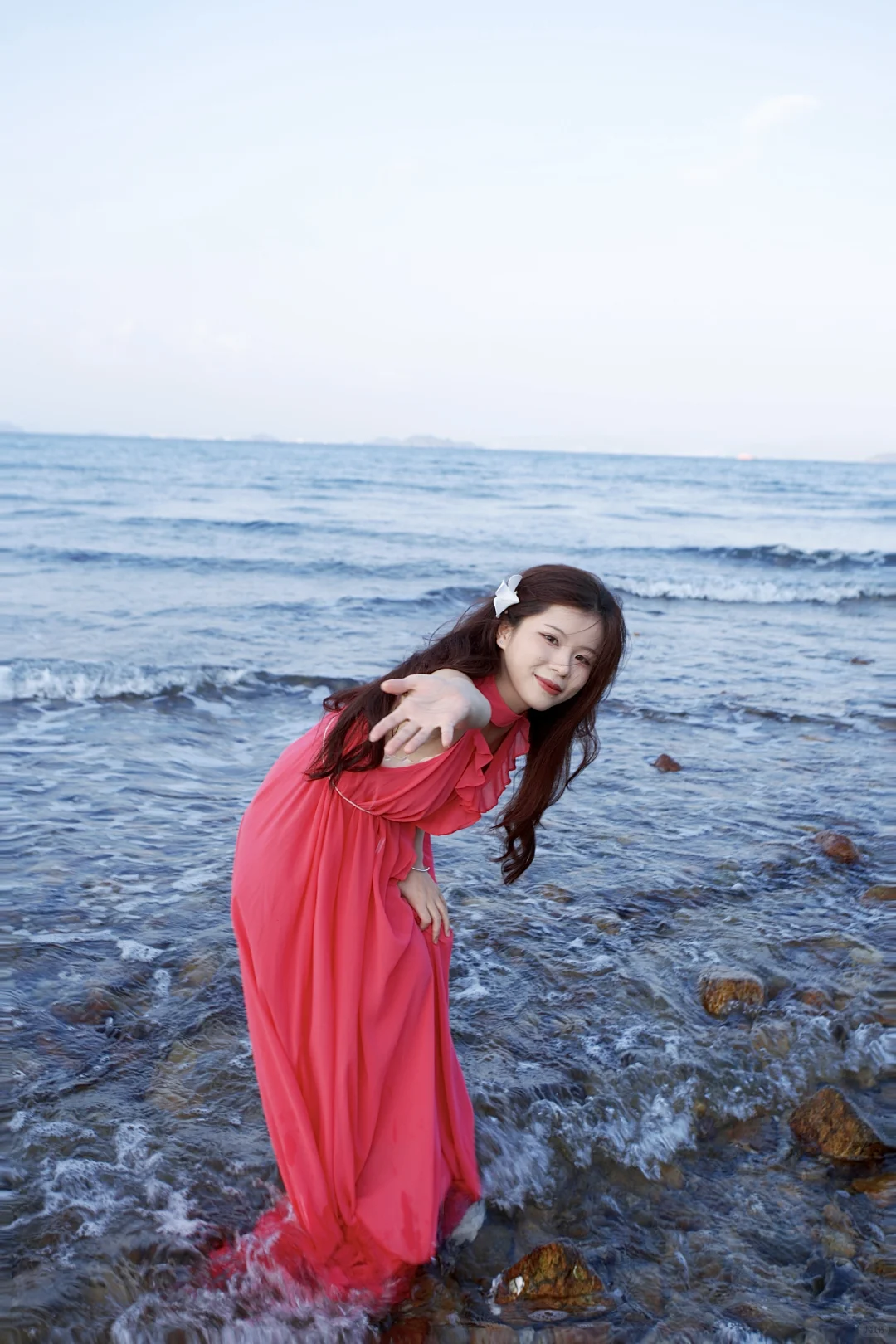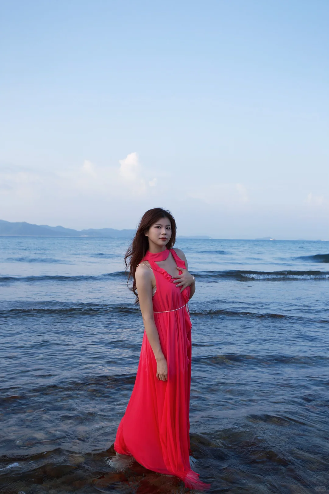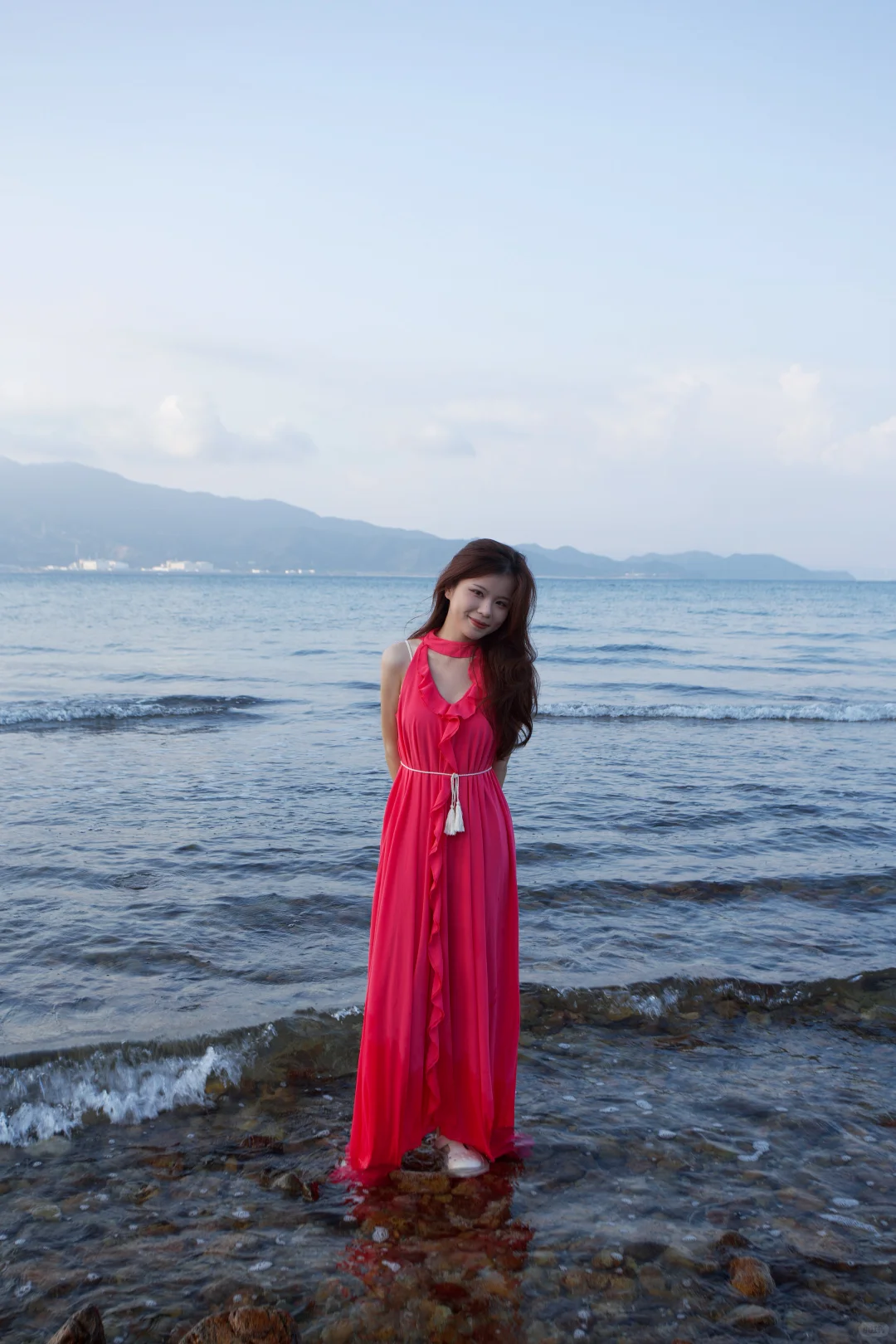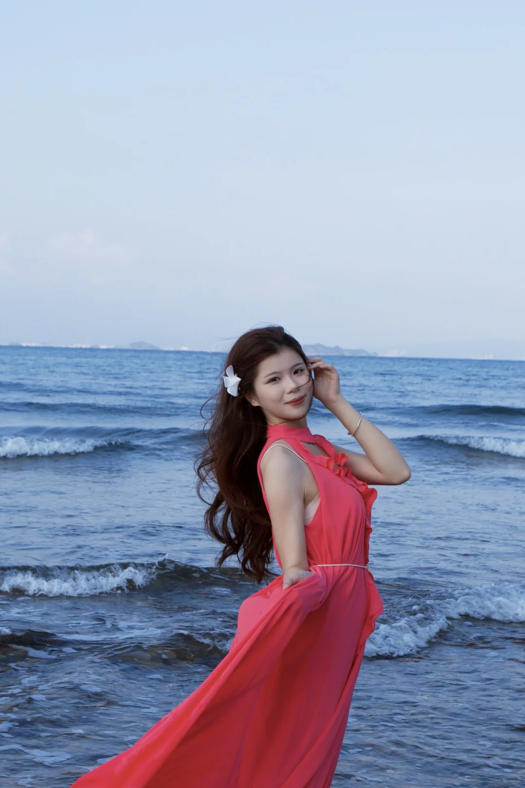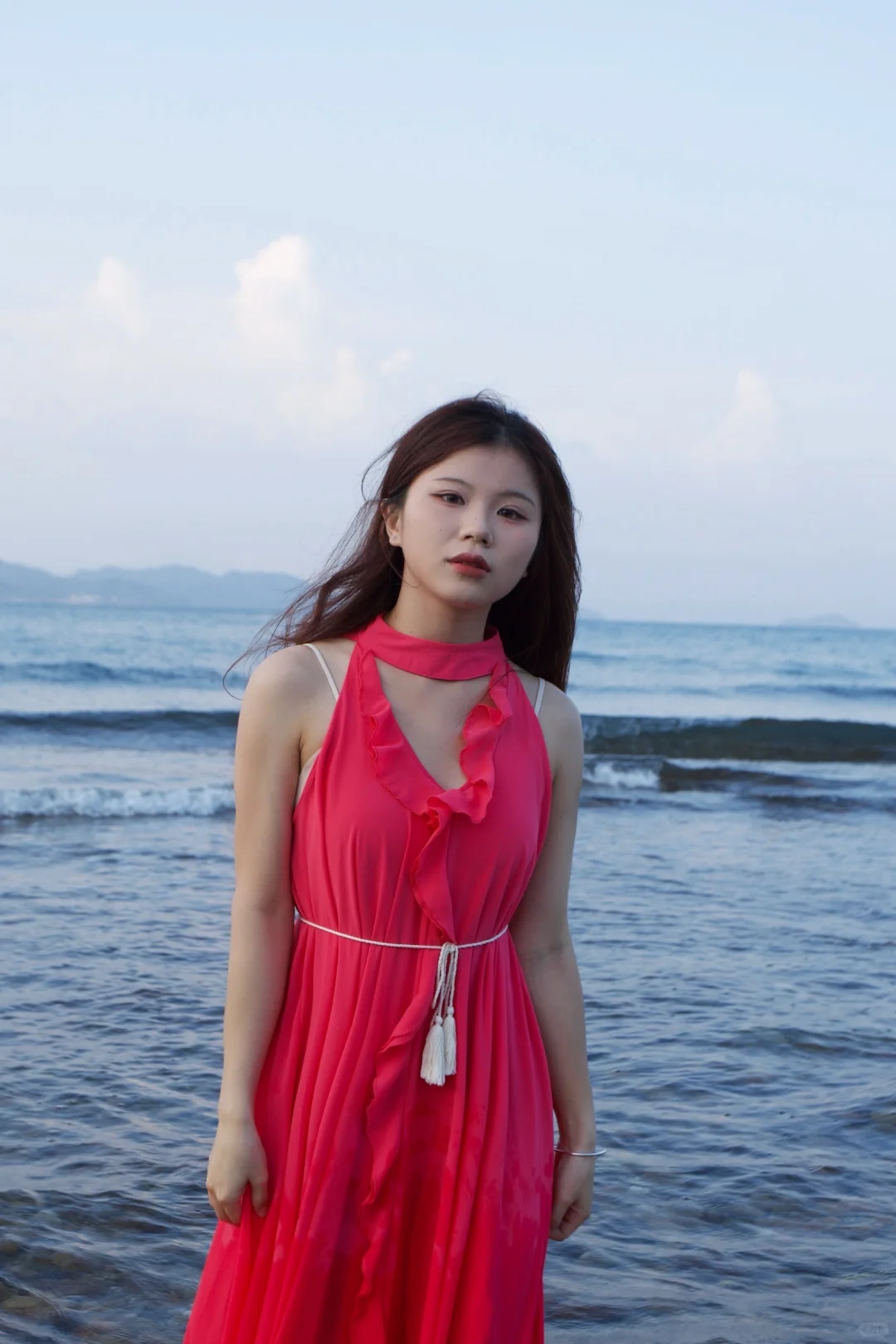 这次选了玫红色挂脖雪纺长裙,挂脖设计露出肩颈线条,木耳边点缀甜而不腻,腰间白色流苏腰带既收腰显比例,又和海浪沙滩呼应出清爽感~