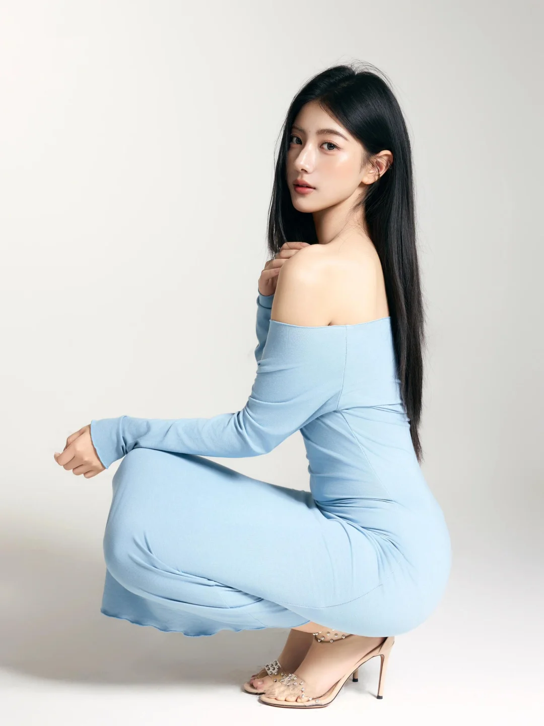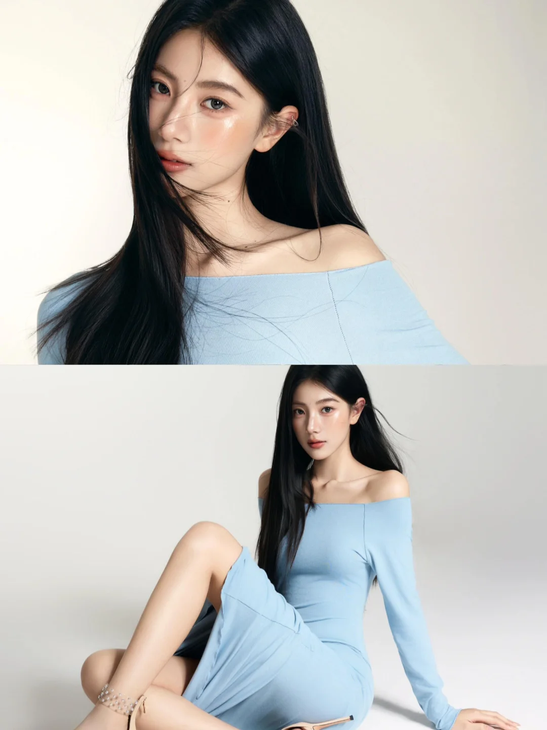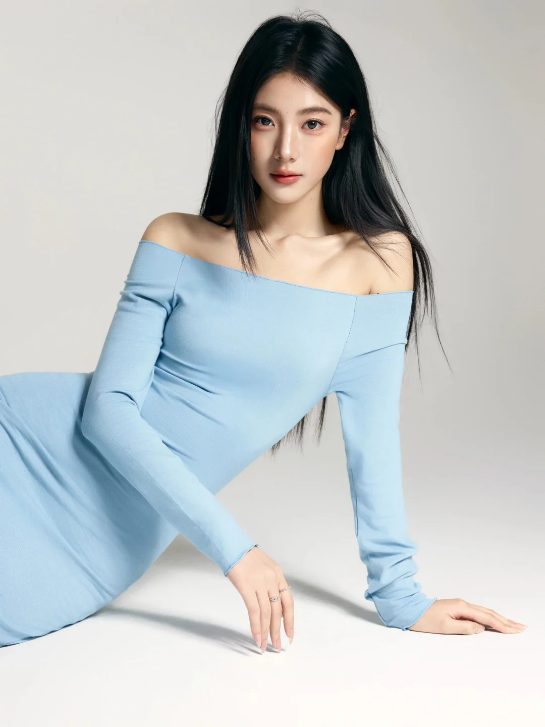 蓝色一字肩长裙真的很惊艳