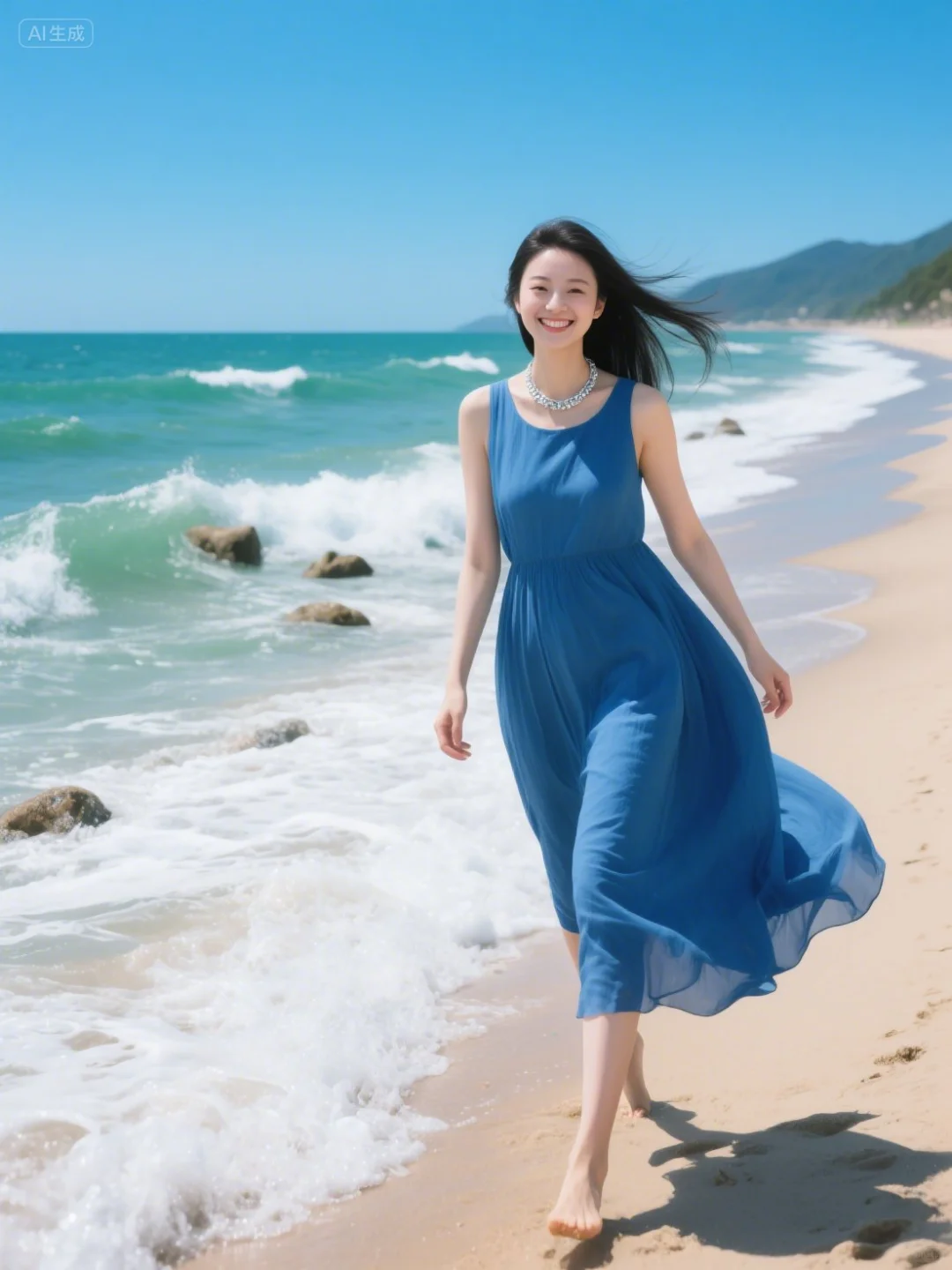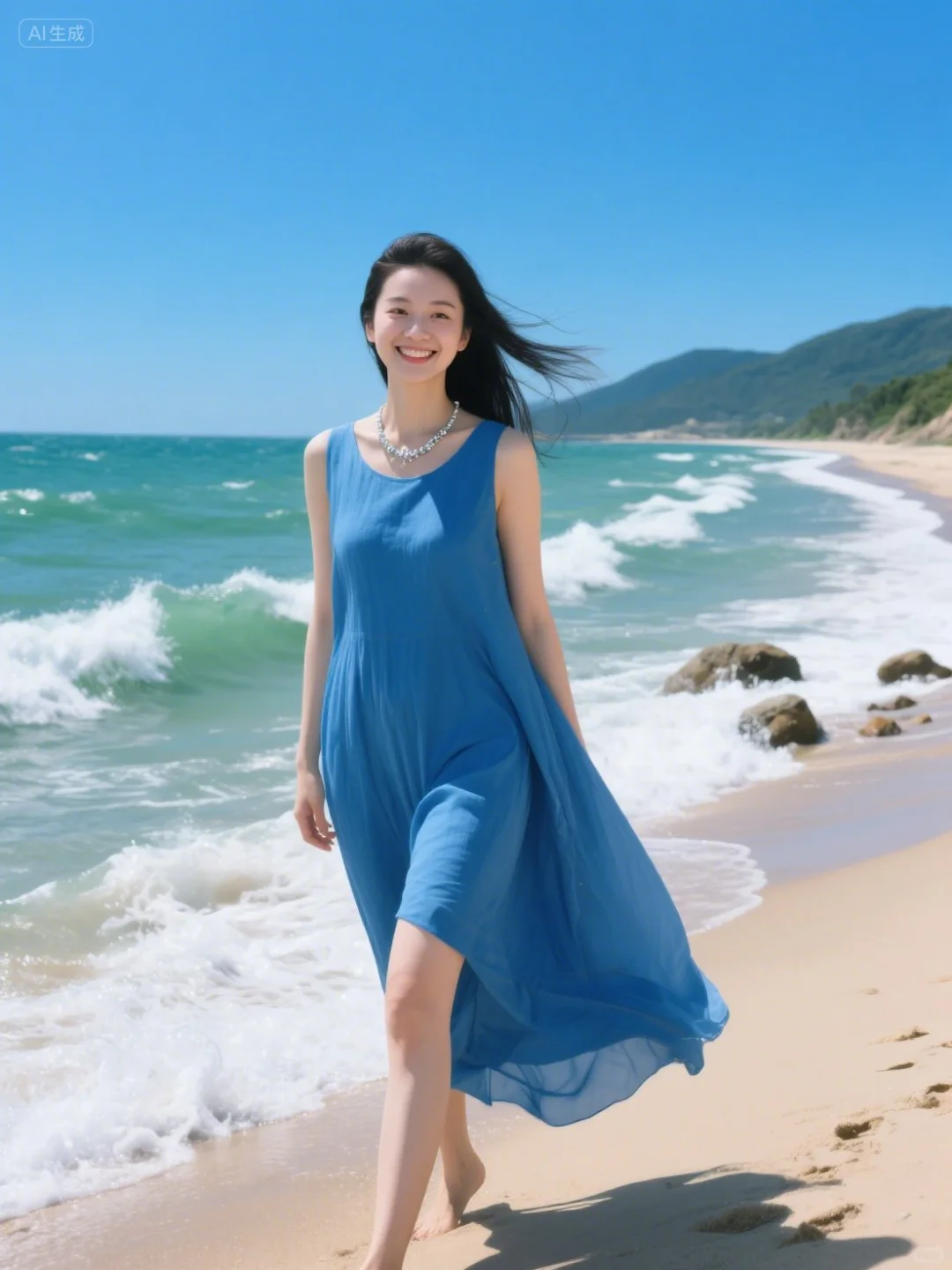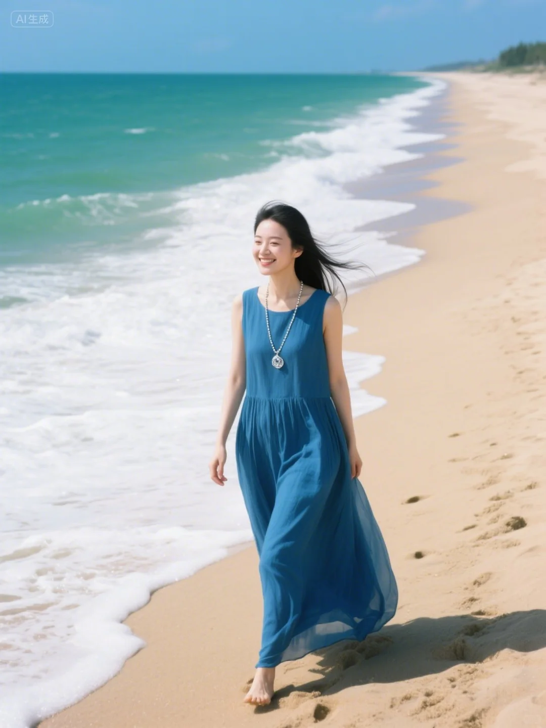 海浪漫过沙岸🌊 裙摆也跟着海风轻晃